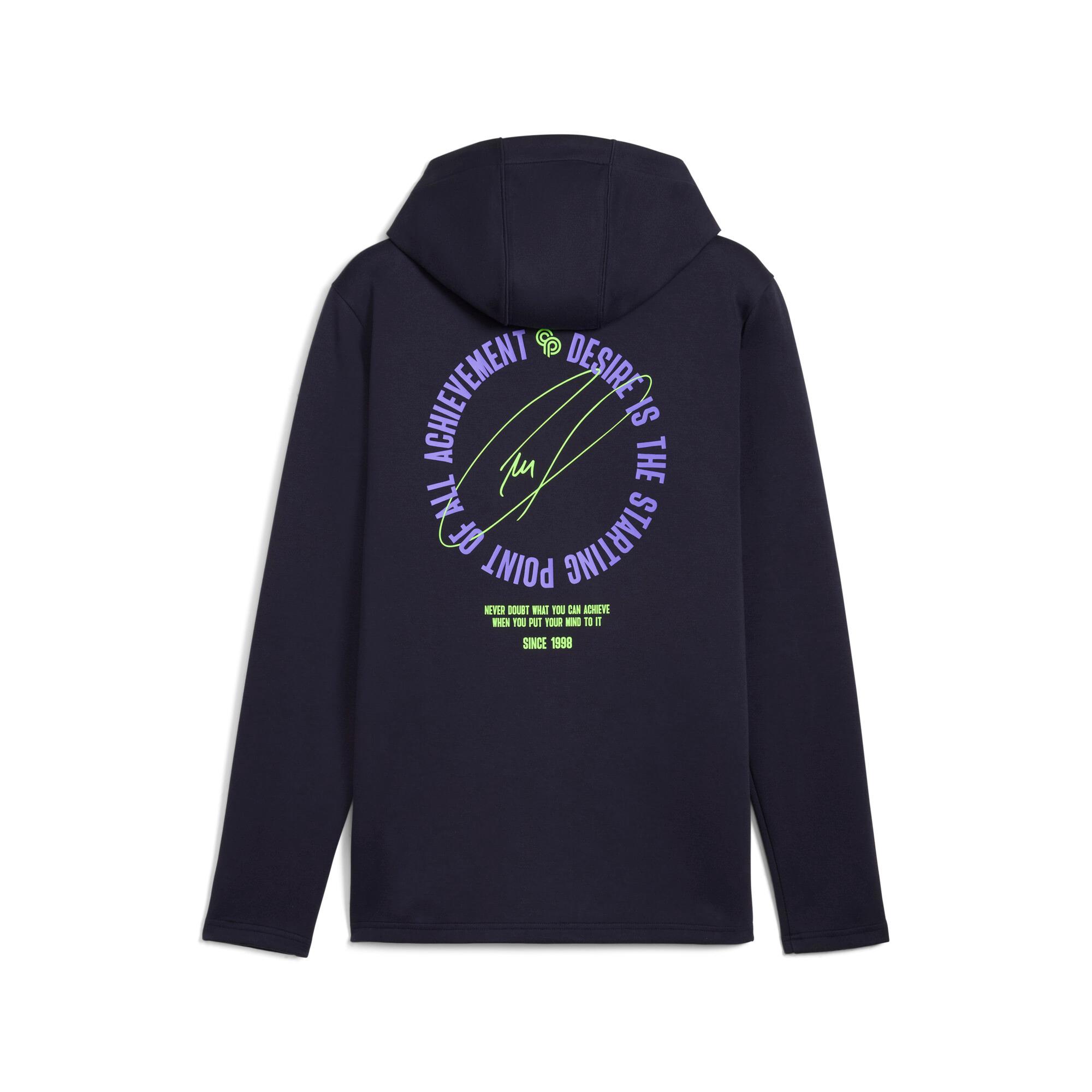 This full zip hoodie brings bold style and performance together in this exclusive PUMA x CP collection. Inspired by Christian Pulisic's journey and the Ultra boots he wears, this hoodie features striking graphics and a fresh color palette. It balances casual wear and athletic performance, making it an essential piece for fans chasing their own dreams.Made with at least 20% recycled materialsRegular fitMain material: Single jerseyRegular lengthHoodFull zipLong sleevesSide pocketElasticated cuffsPUMA Cat logo placed on right chestCP logo on left chest