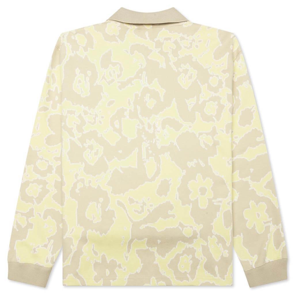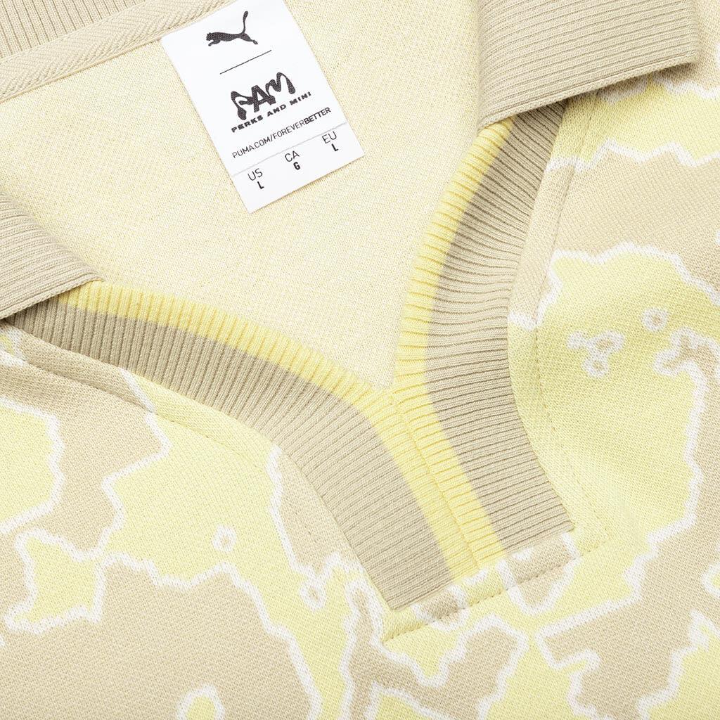 Collared rugby shirt from the latest collaboration from Puma x Perks and Mini, made with an allover print and an open collar. Long sleeves with a notched cut out front and made with cotton. 100% Cotton Ribbed cuffs Waist length Style No: 625063-90