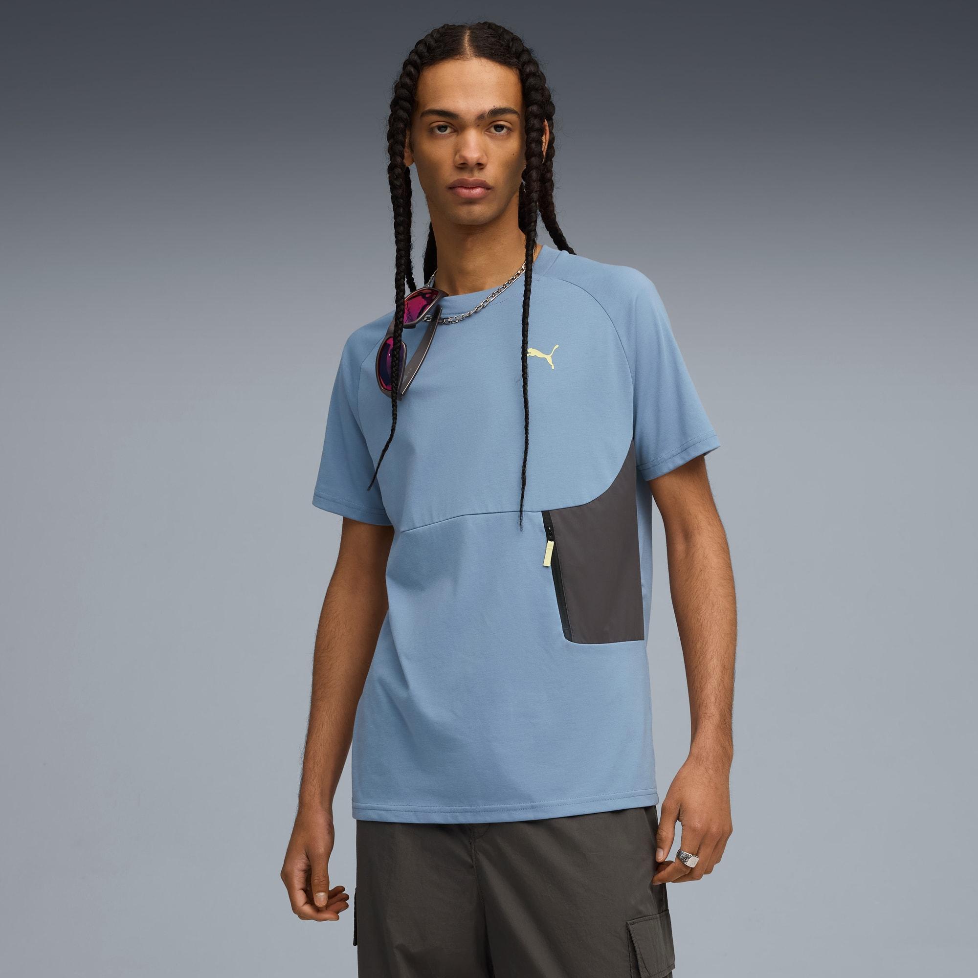 Step up your style game with this tee. Featuring a high-density CAT logo, contrasting color blocks, and a sleek front pocket with a zipper. Stay fresh and ready for anything with PUMA's dryCELL technology. Feel the energy, own the day.Made with at least 50% recycled materialsdryCELL: Performance technology designed to wick moisture from the body and keep you free of sweat during exerciseRegular fitSingle jersey fabricRegular lengthCrew neckShort sleevesPUMA branding details