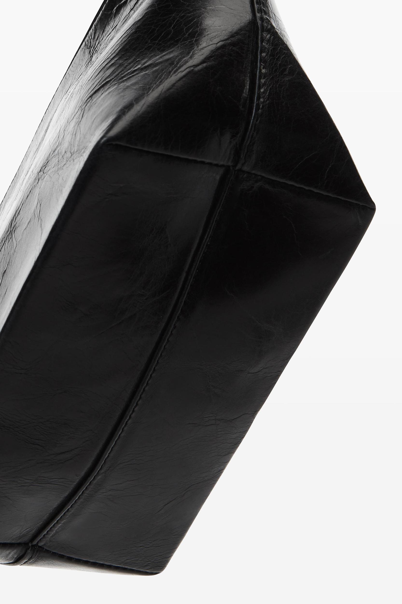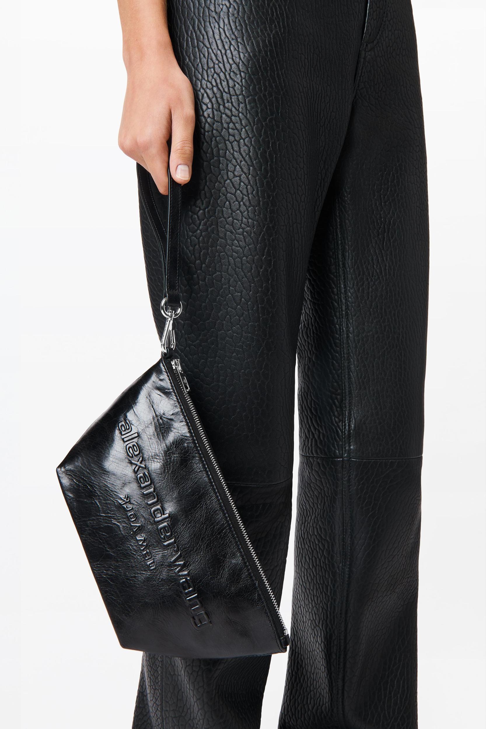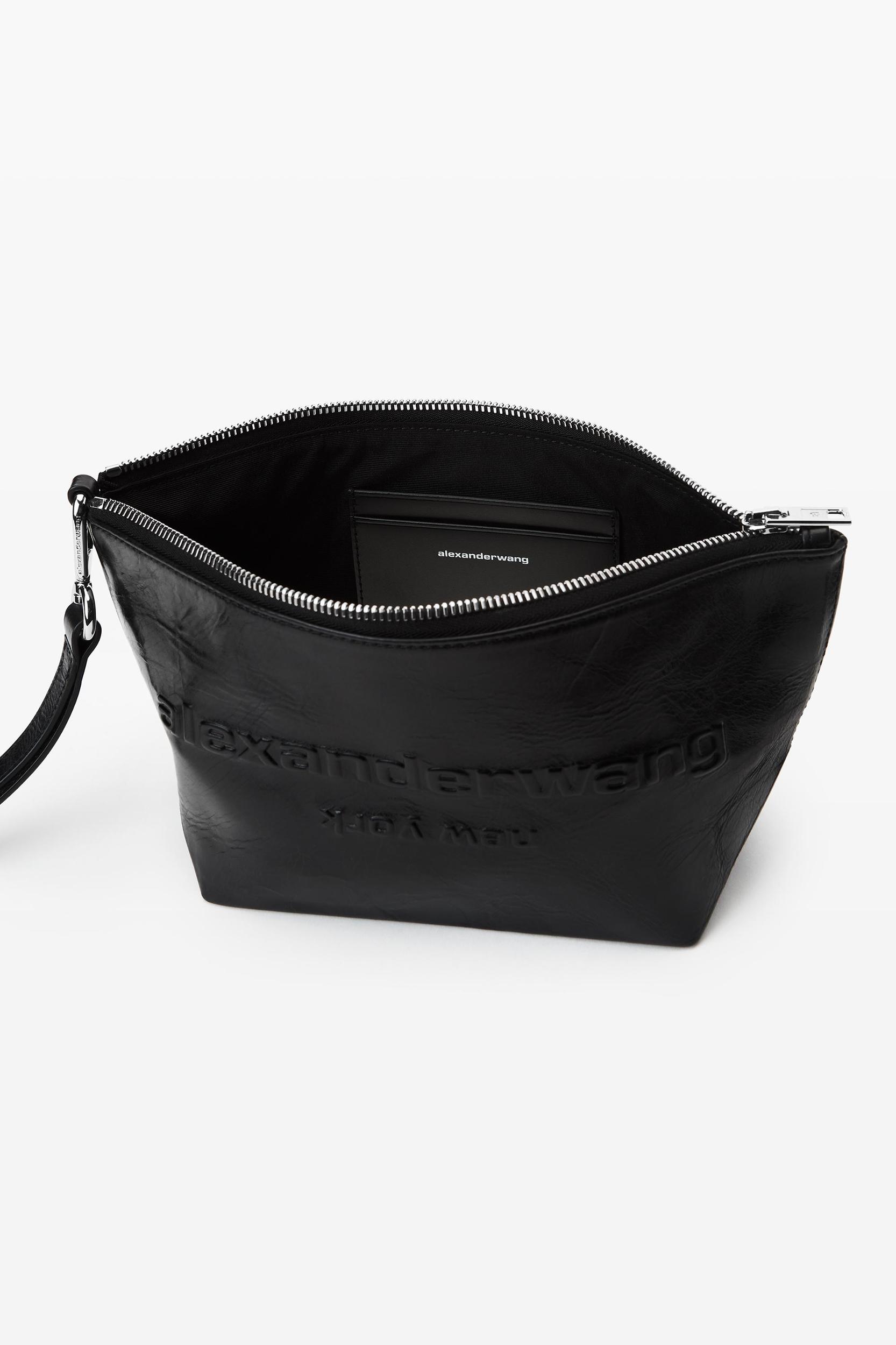 with its signature punch logo design, this wristlet strap pouch features a black crackle patent leather fabrication.