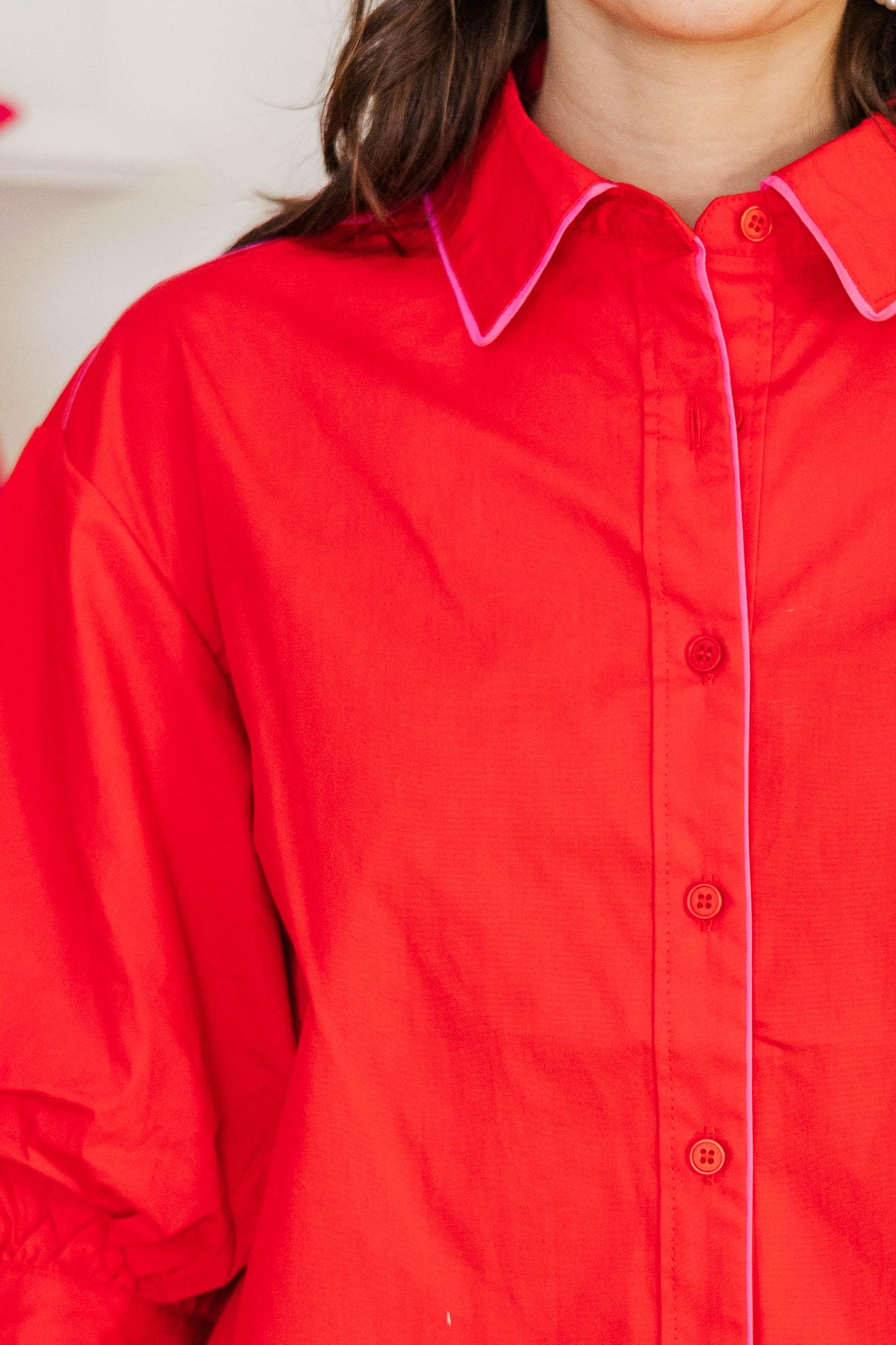 This bold button-down top makes a statement with its vibrant color and softly structured puff sleeves. Polished yet playful, it’s an easy way to elevate everyday denim or dress up your go-to trousers. Perfect for workdays, dinners, or festive moments when you want a confident, standout look. Classic collared neckline Button-front closure Elbow-length puff sleeves Relaxed, easy silhouette Lightweight fabric with minimal stretch Maddi is wearing the small.