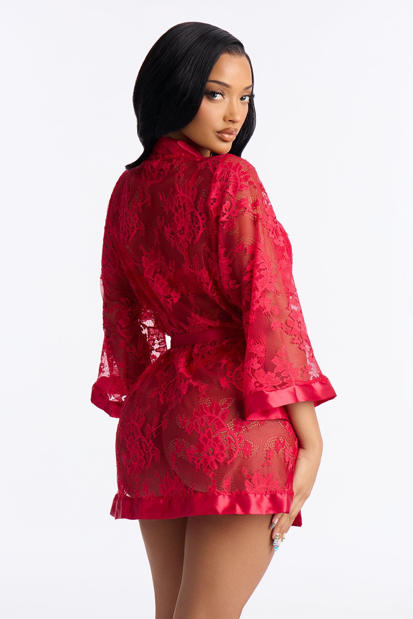 Available In Black And Red. Floral Lace Robe Adjustable Tie Waist Satin Contrast Trim Mini Length Final Sale Lace: 100% Polyamide Satin: 96% Polyester 4% Elastane Imported