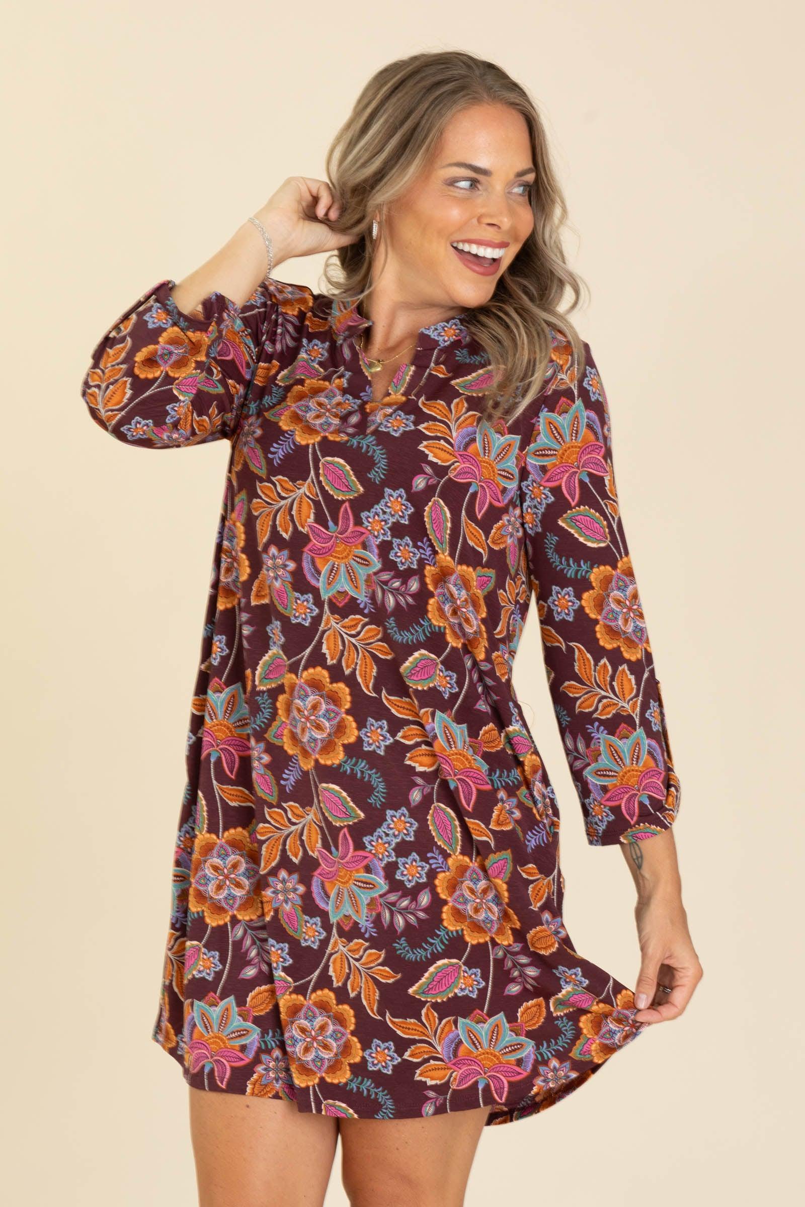 Purple And Mustard Print Wrinkle Free Dress