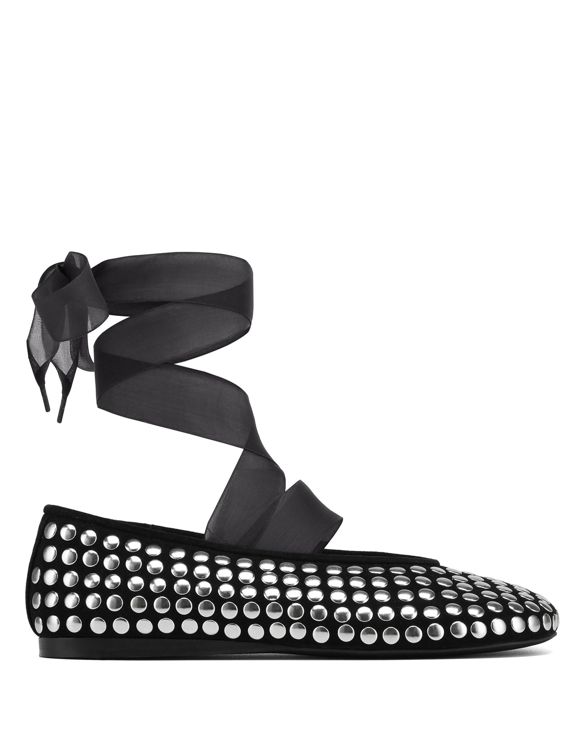 Experience luxury with Purr, our asymmetrical slip-on ballet flat with a detachable and interchangeable ribbon leg tie, featuring a 4mm outsole and a leather insole. Crafted from premium kid suede with all over flat stud detailing.