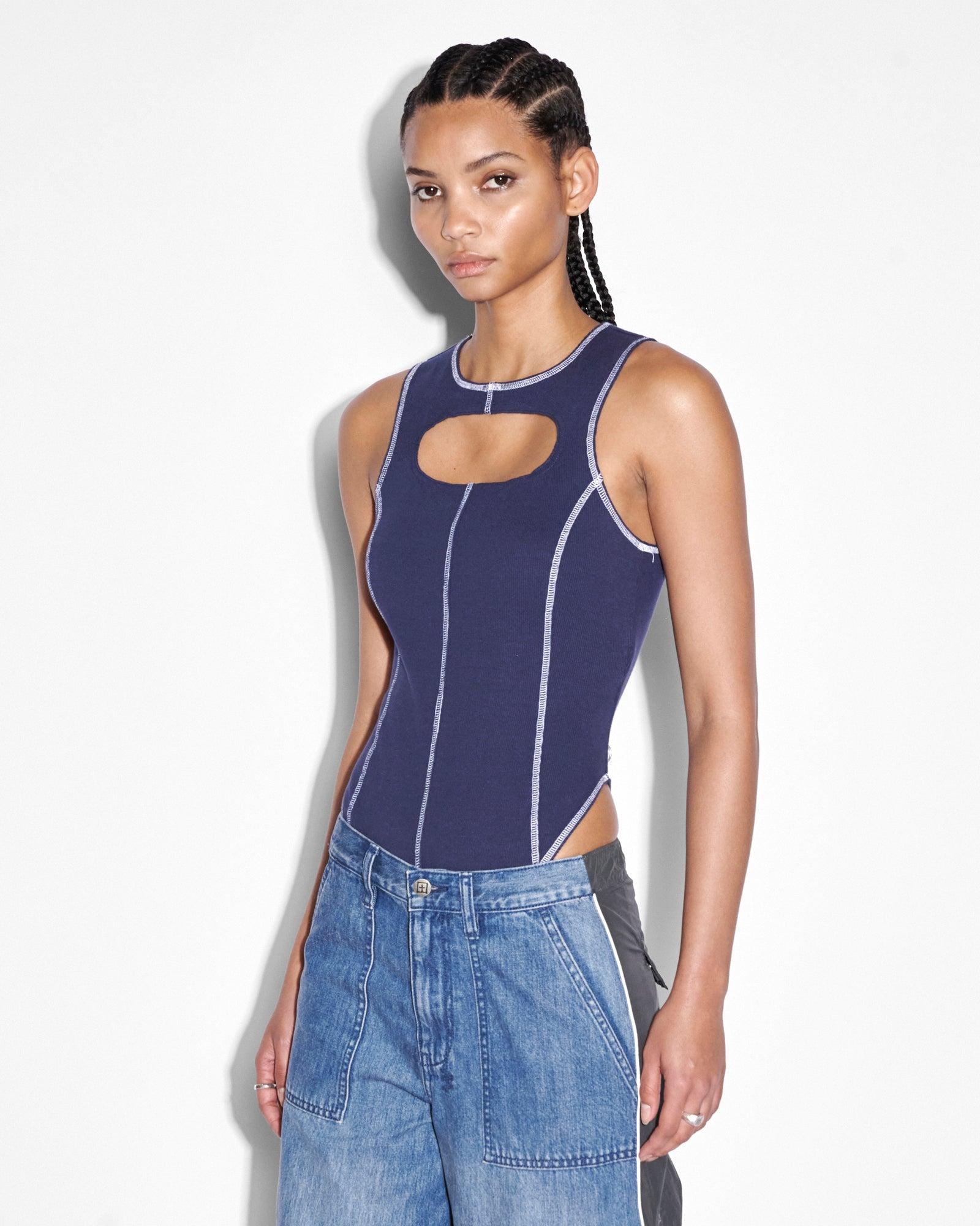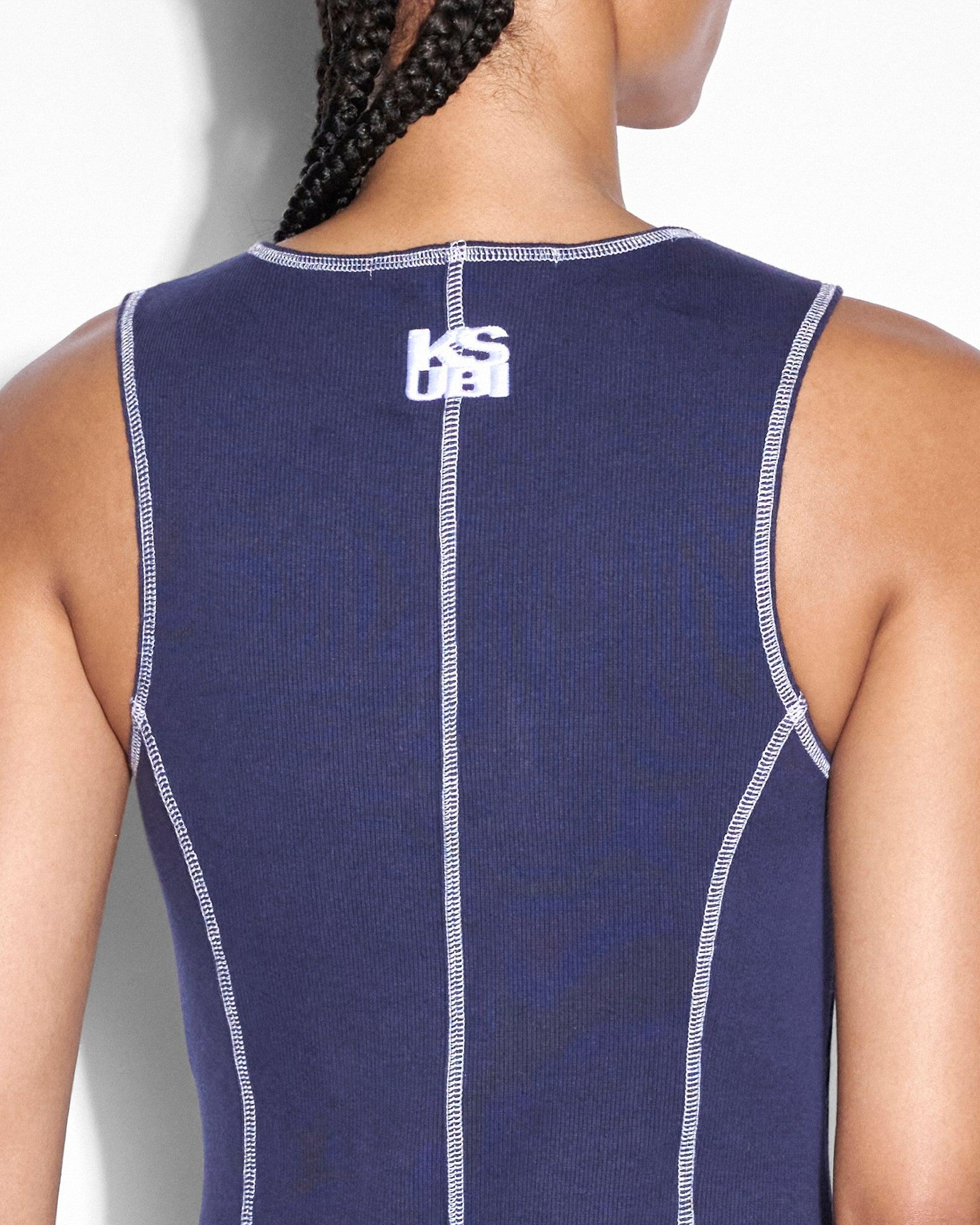The Pursuit Bodysuit Navy is a slim fit, sleeveless bodysuit crafted from a figure-forming cotton/elastane rib in seasonal navy. Designed with a front chest cut out, contrast white coverstitch and high-cut leg openings, wear it layered with the Pursuit Shrug hoodie for a styled set. This style features crotch snaps and gusset for a comfortable fit, and signature Ksubi branding.