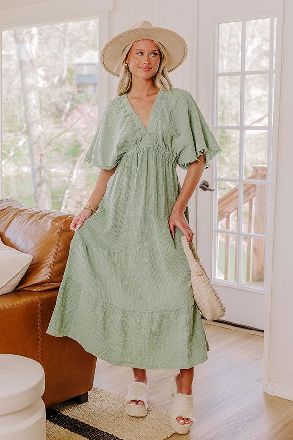- Stay effortlessly cute in this trendy midi! The unfinished detailing and vintage wash give it that perfect laid-back vibe. - Unlined, textured material with a vintage wash - An elastic v-cut neckline - Short butterfly sleeves with unfinished cuffs with frayed detailing - An elastic waistband - A flowy silhouette that ends in a straight, midi length hemline