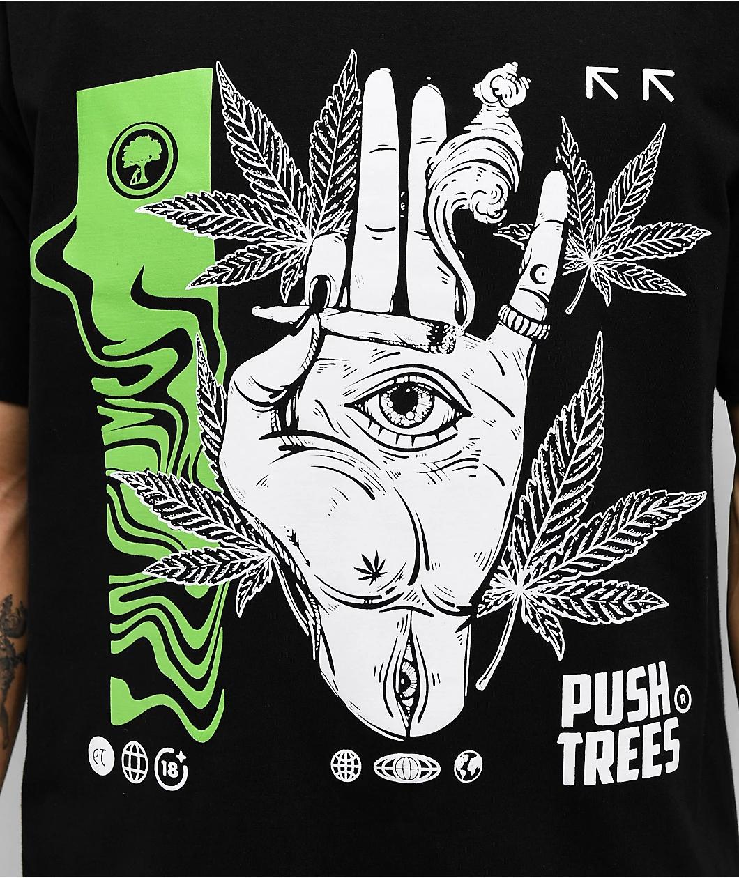 The Delusional t-shirt from Push Trees arrives in a black cotton construction with bold, stoner-inspired graphics. A joint-holding hand, abstract symbols, and weed leaves decorate the front, while the back features oversized branding and playful 420