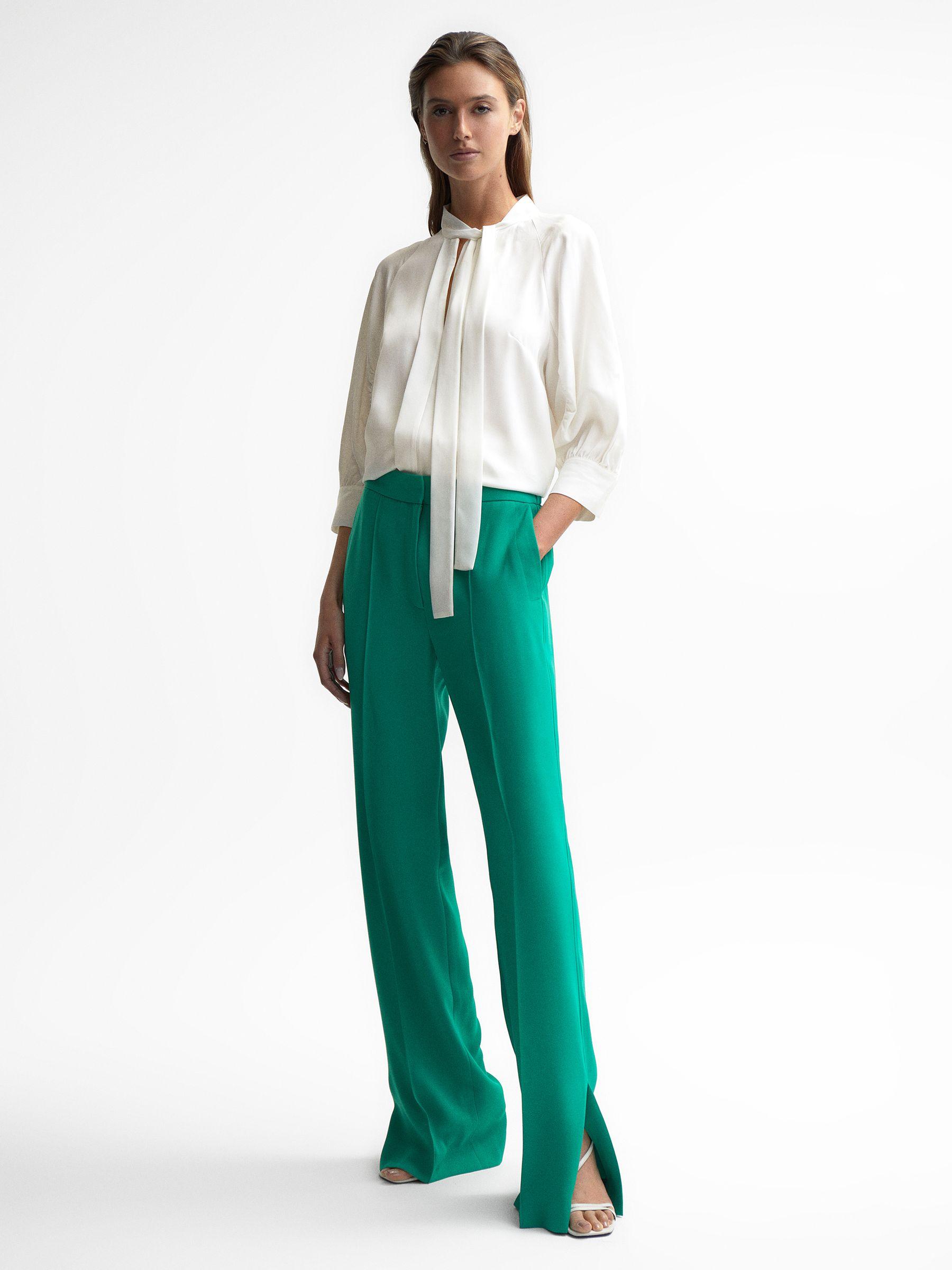 Discover your new favourite blouse with the Larissa, crafted in a subtle twill weave for textural nuance. This design features a V-neckline with a self-tie pussy bow. Buttoned sleeves and a curved hemline add to the elegance. Tuck into a pair of wide-leg trousers and finish the look with a blazer for a refined edit. Pussy bow. V-neckline. Buttoned sleeves. Textural weave. Curved hemline.