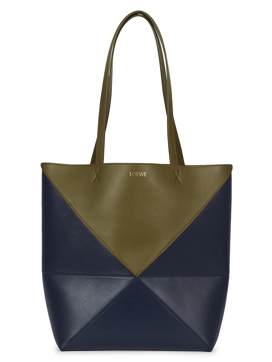 Loewe tote bag in puzzle pattern bicolor leather Flat shoulder straps Open top Approx. 12.3H x 9.9W x 5.7D Made in Spain