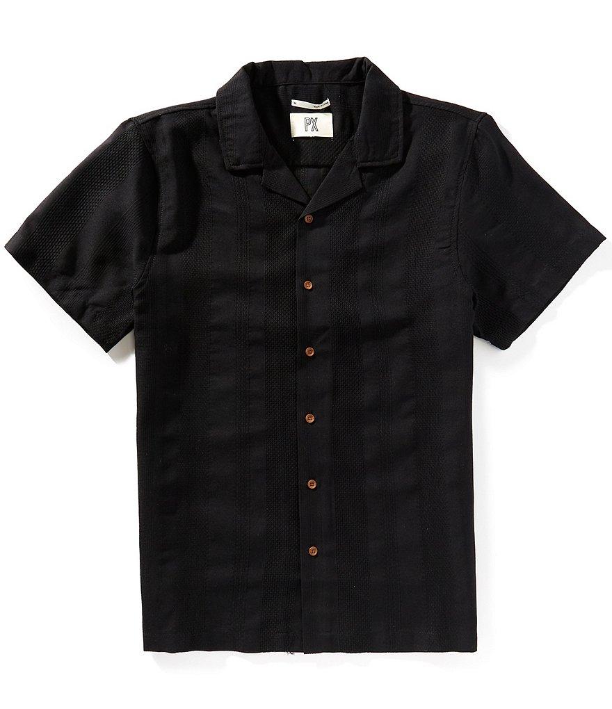 From PX Clothing, this shirt features: Camp collar Short sleeves Dobby stripes Button down closure Straight hem Textured fabric Cotton/polyester Machine wash/tumble dry Imported.