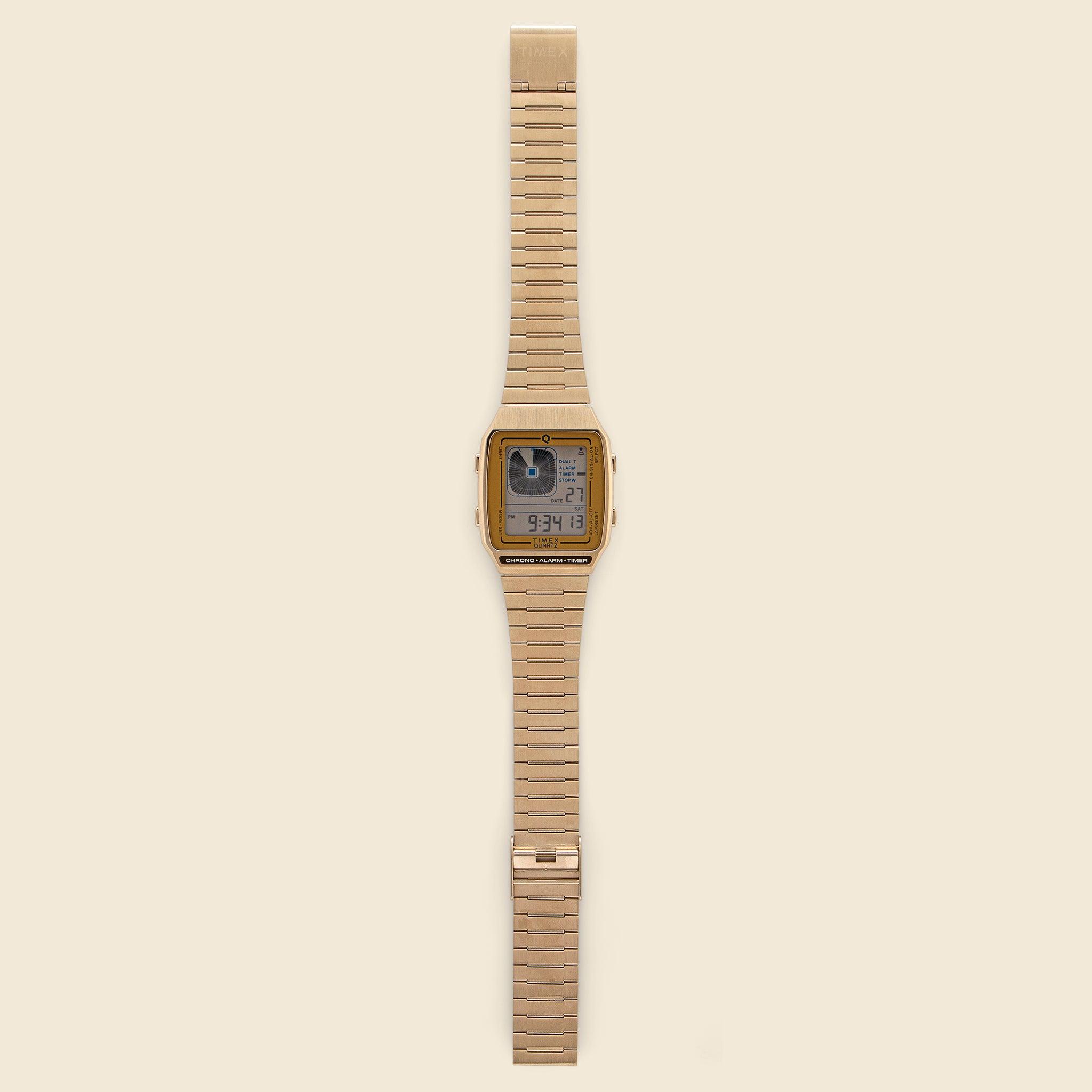 Fresh from the Timex archives, the Q Digital LCA Watch is a true recreation of the original right down to the unique digital/liquid crystal analog display. Updated with a gold-tone stainless steel case and bracelet, they kept the pre-INDIGLO single-bulb backlight to boost the retro vibe to its highest potential. Equipped with a customizable alarm, countdown timer, and a day and date display, this is one retro-inspired watch we really dig. Retro-inspired stainless steel watch Digital/ liquid crystal analog display Quartz digital movement Stainless steel adjustable bracelet Gold-tone finish Day and date display Countdown timer and customizable alarm Pre-NDIGLO single bulb backlight Mineral glass lens Water resistant up to 30 meters Materials: Stainless steel Dimensions: Case width: 32 ½mm | Case height: 9mm | Strap and lug width: 20mm