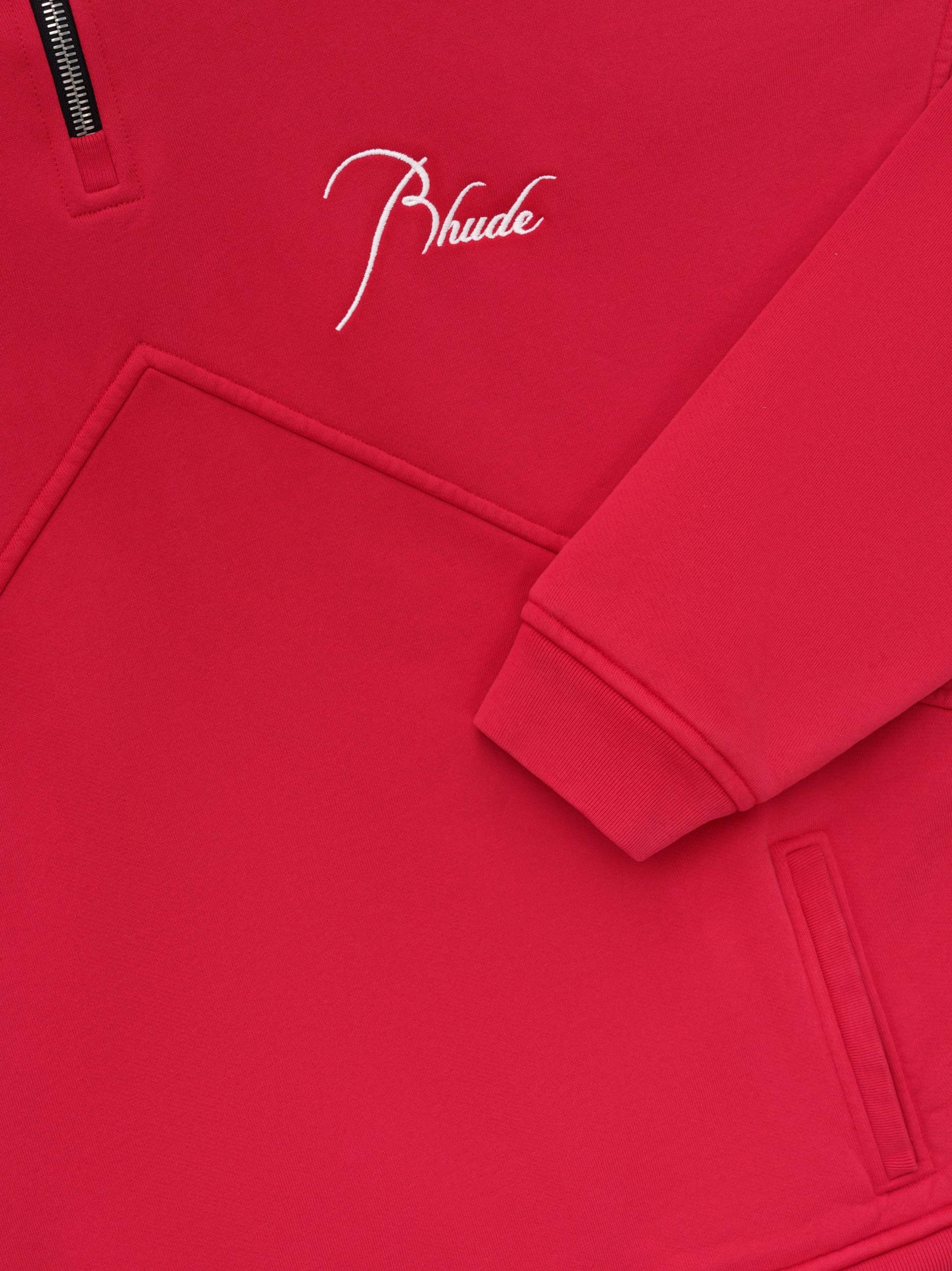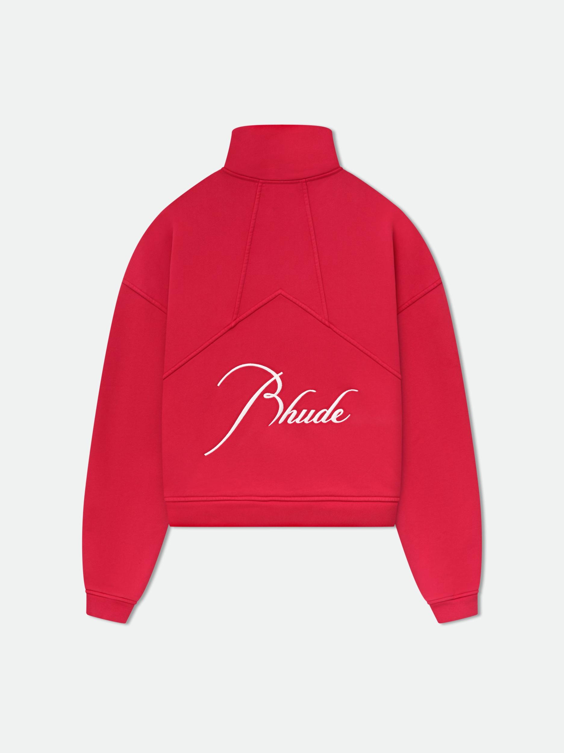 Heavyweight quarter-zip jacket with signature Rhude script on the front and back. Front quarter zipper closure with custom RHUDE Pill Hardware. 100% COTTON/100% LYOCELL/100% POLY Dry clean only.Standard fit- We recommend taking your standard size.
