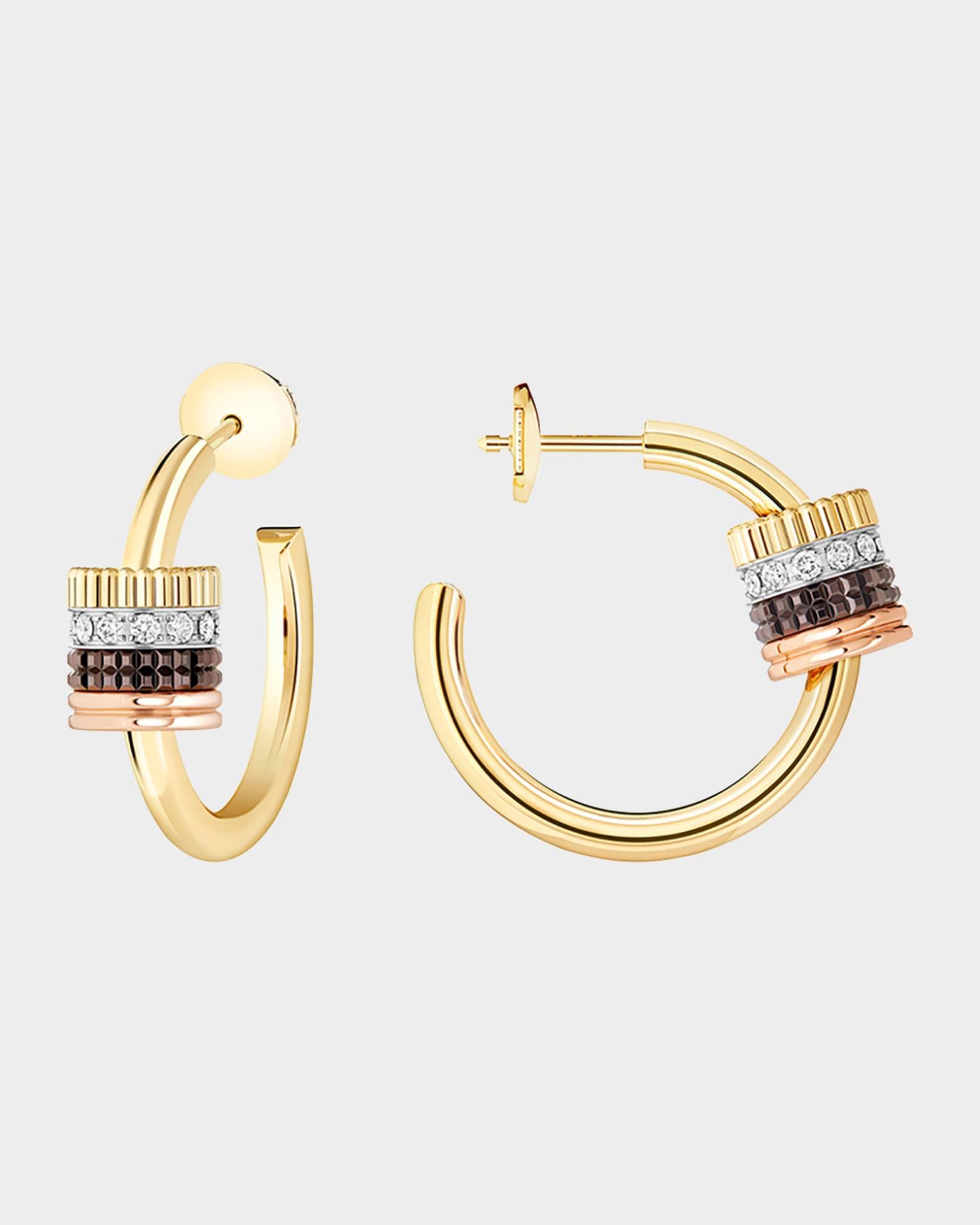 These earrings from Boucheron are crafted with smooth hoops and accented by mixed textures. Tricolor gold, brown PVD and white diamonds enhance the hoop earrings. Polished 18-karat yellow, white and rose gold 0.36 total diamond carat weight For pierced ears Made in Italy