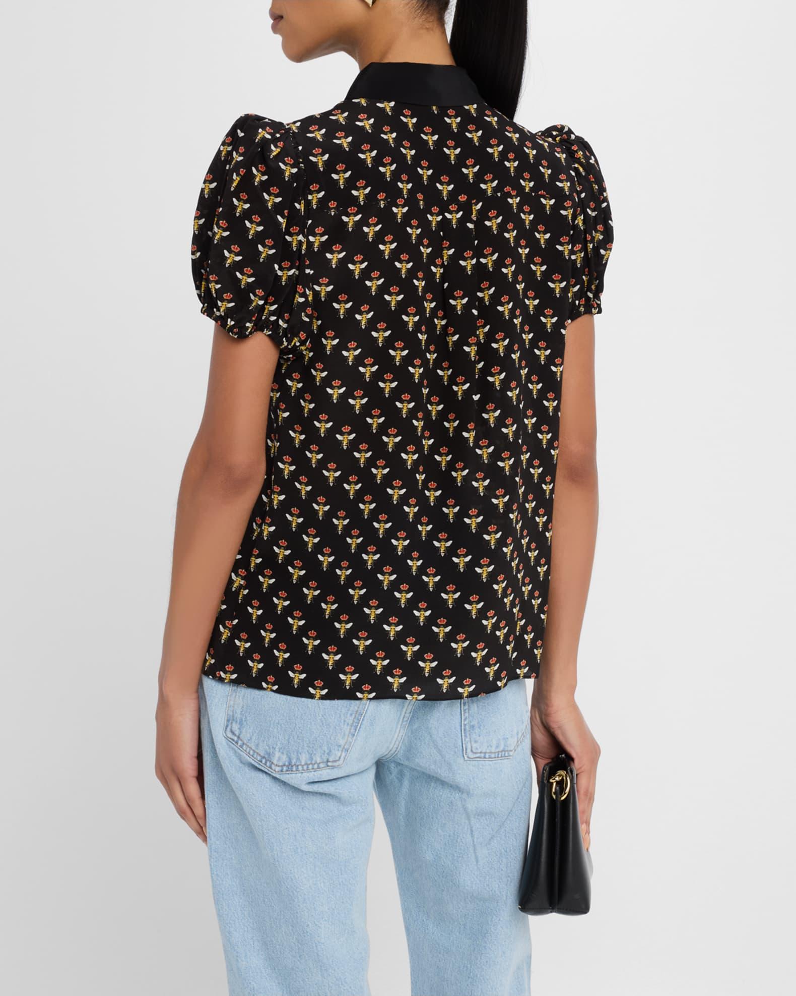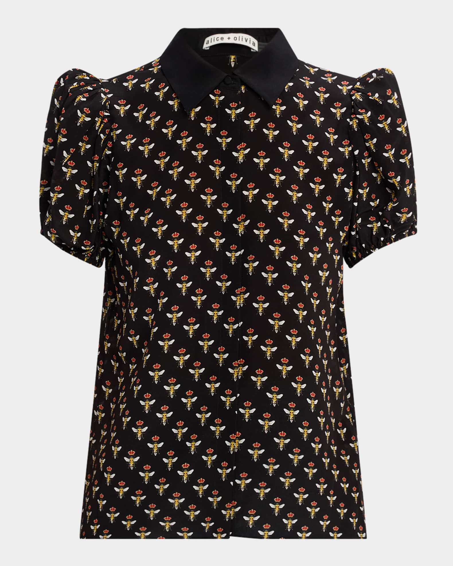 Alice + Olivia "Willa" blouse featured in allover Queen Bee print Approx. 24.5"L from shoulder to hem Point collar with Queen Bee embroidery Short puff sleeves with elastic cuffs; approx. 15.5"L Yoked back Hip length Relaxed fit Button front closure Silk/polyester Unlined Dry clean Imported