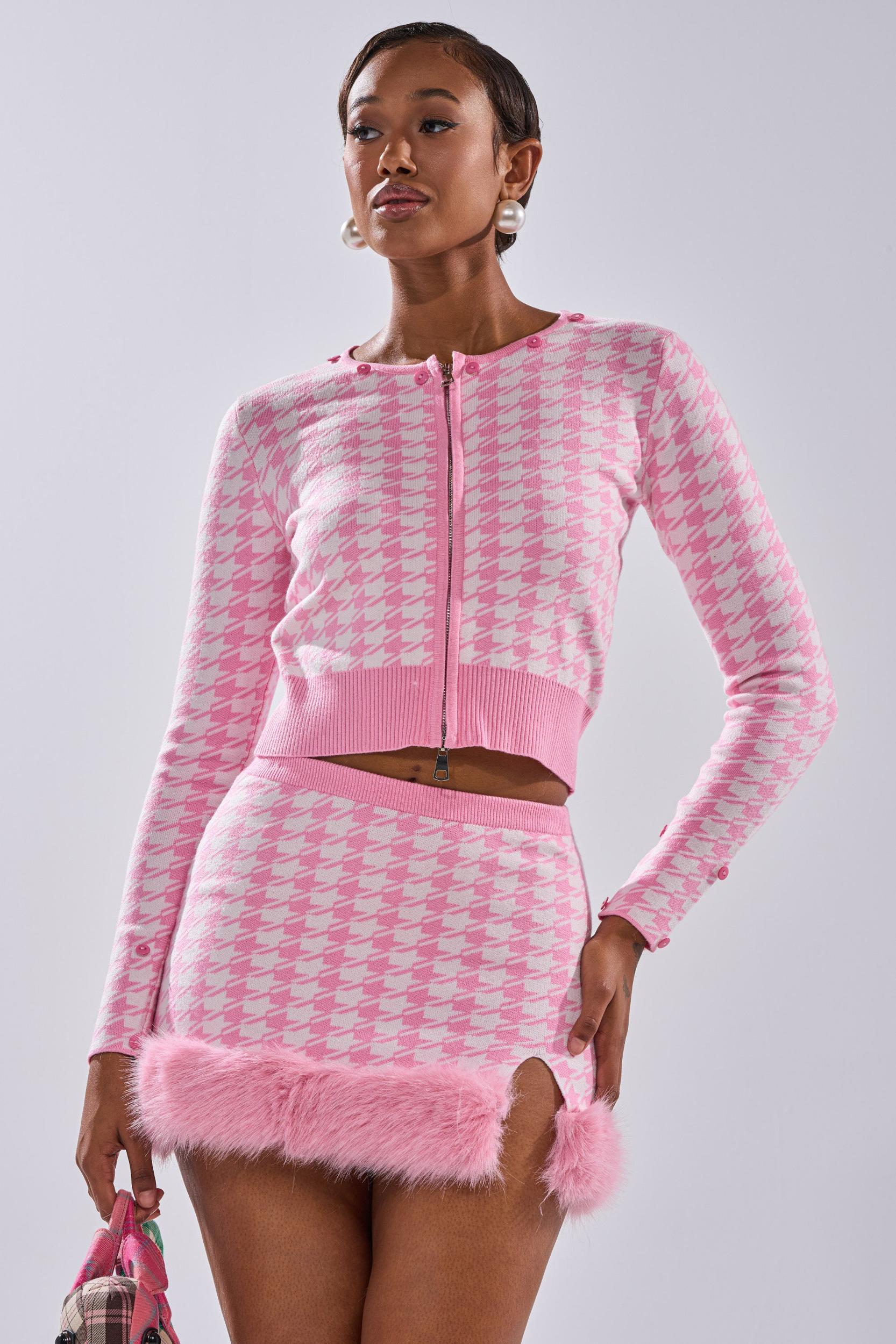 Hi Barbie! The AKIRA Label Queen of Love Sweater with Fur Trim is crafted from a soft, stretchy knit with a houndstooth pattern. Brought to you in a delicious shade of bubblegum pink, this cutesy ‘lil cardigan features a cropped fit, ribbed hem, zip-front closure, and plush, detachable faux fur accents at the collar and sleeve cuffs for fabulous flair. Pair it with matching Queen of Love Sweater Skirt and platform boots for a sugary sweet finish. - 50% Viscose, 28% Polyester, 22% Nylon- Some Stretch- Imported (all measurements approximate from size small)- 18.5” Shoulder to Hem- 14” Shoulder to Shoulder- 24” Sleeves- Model is 5’9” and wearing a size smallProduct ID: 1057334 (all measurements approximate from size 1X)- 21.5” Shoulder to Hem- 20” Shoulder to Shoulder- 24” SleevesProduct ID: 1057338