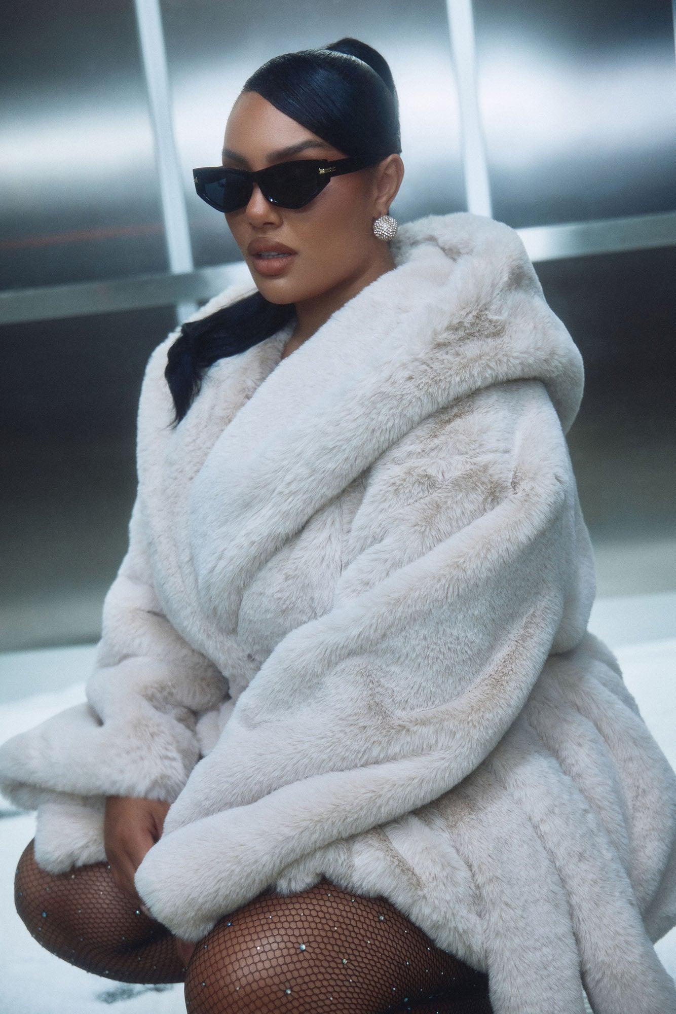 Available In Beige. Faux Fur Coat Hooded Long Sleeves Button Closure Tie Waist Pockets Fully Lined Self Faux Fur: 100% Polyester Lining: 100% Polyester Imported California Proposition 65WARNING: Cancer and Reproductive Harm - www.P65Warnings.ca.gov.