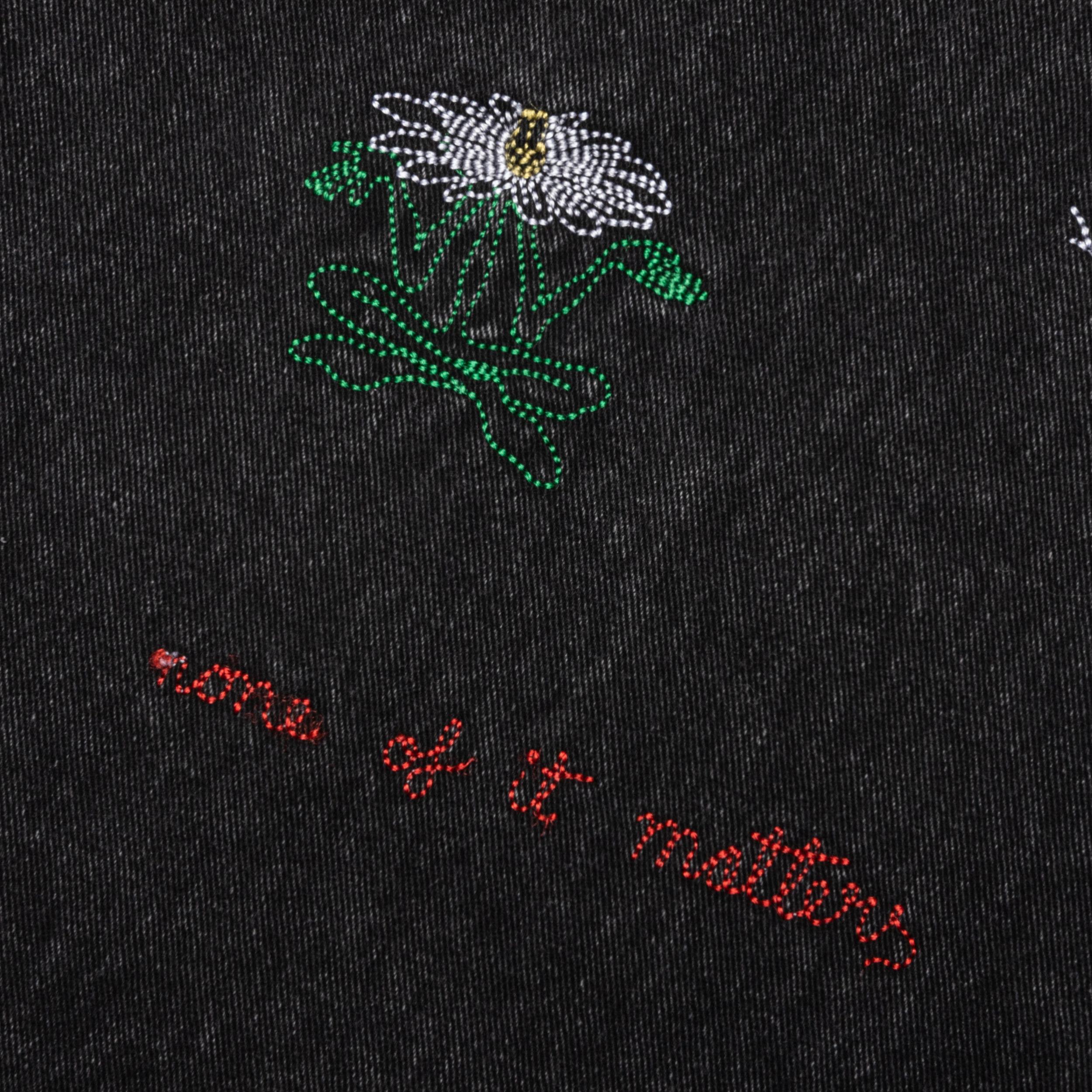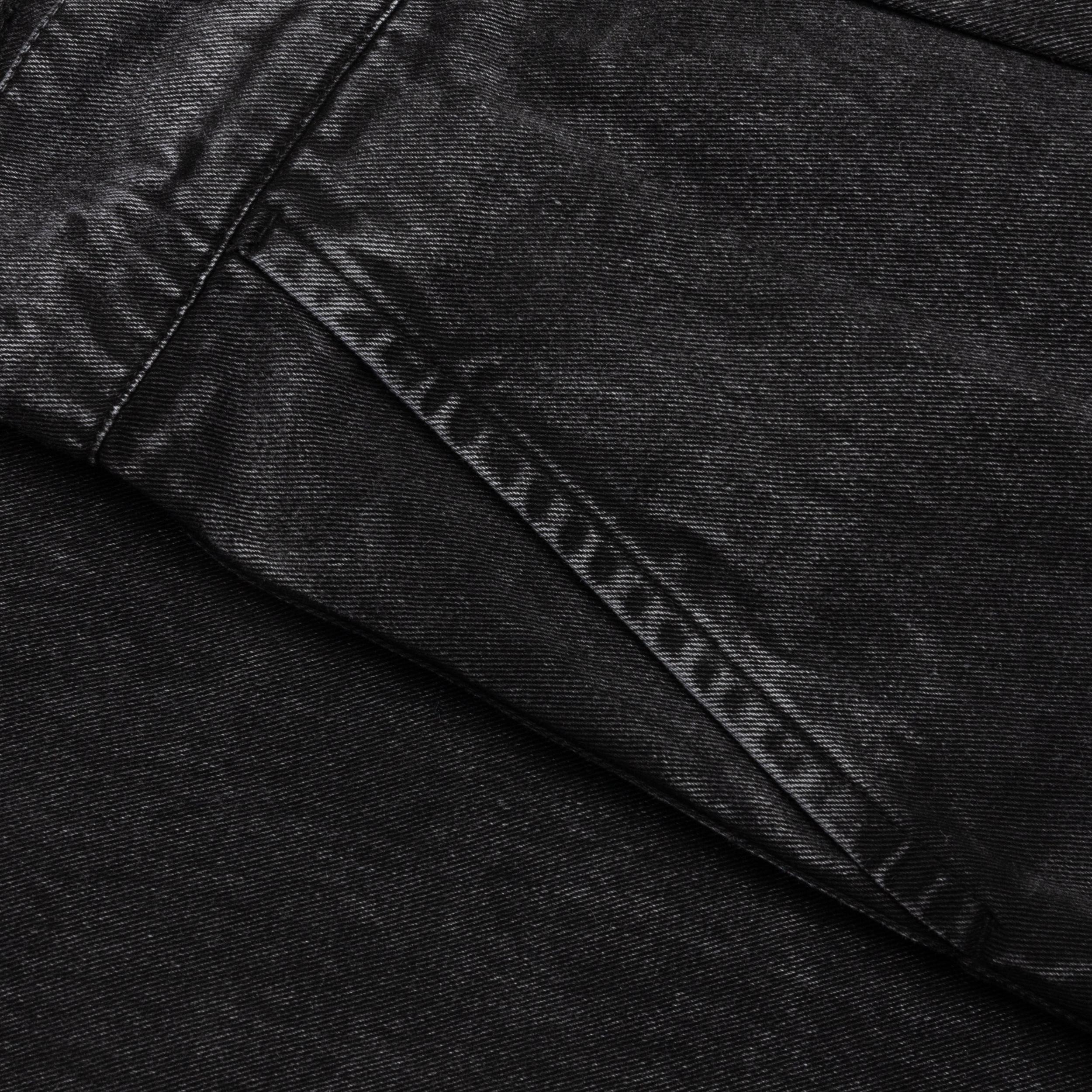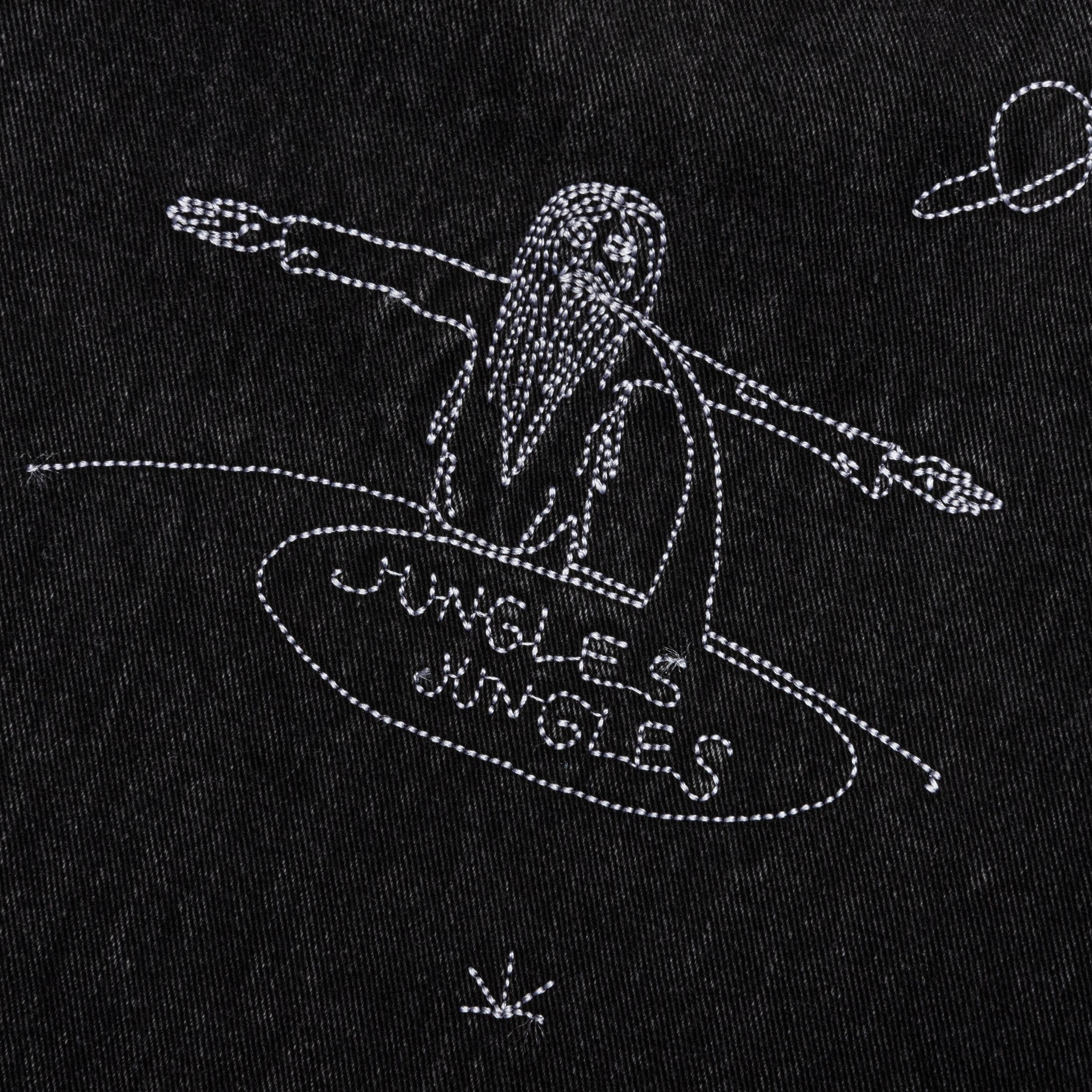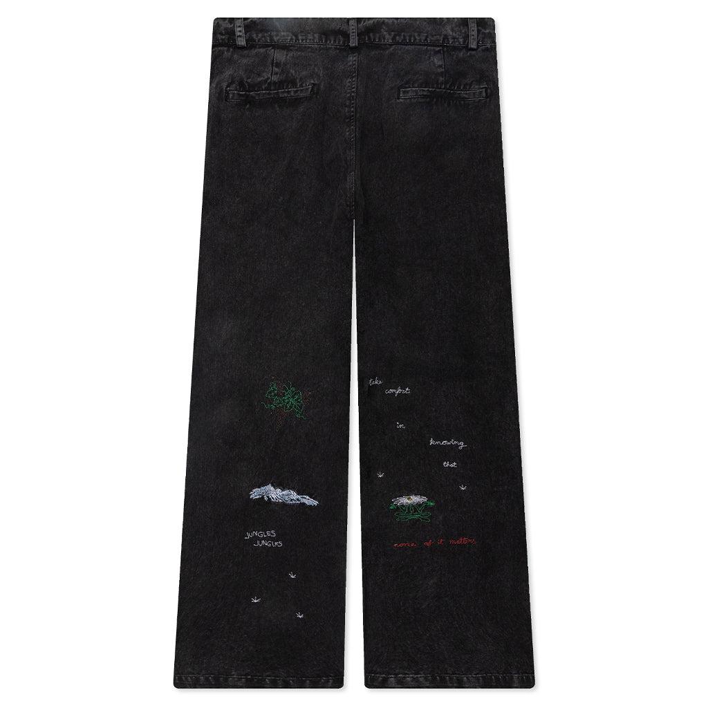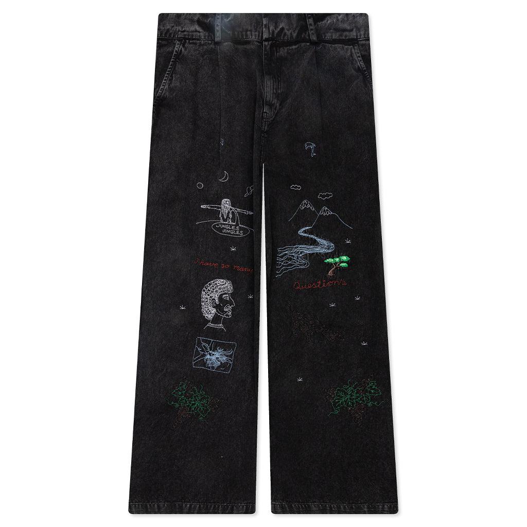 The Questions Pleated Pant is the latest addition from Jungles. Composed of cotton twill, these jeans have been overdyed black for a vintage look. They have a relaxed fit for comfortability. The design is highlighted by the single-stitch embroidery scattered throughout. Some technical details like the zip-fly closure, pleated details, and four-pocket design complete the look. 100% Cotton twill Four-pocket construction Zip-fly closure Single-stitch embroidery Relaxed fit Overdye Style No: PLP-SMQ-OD-BLK PLPQ OD BLAC