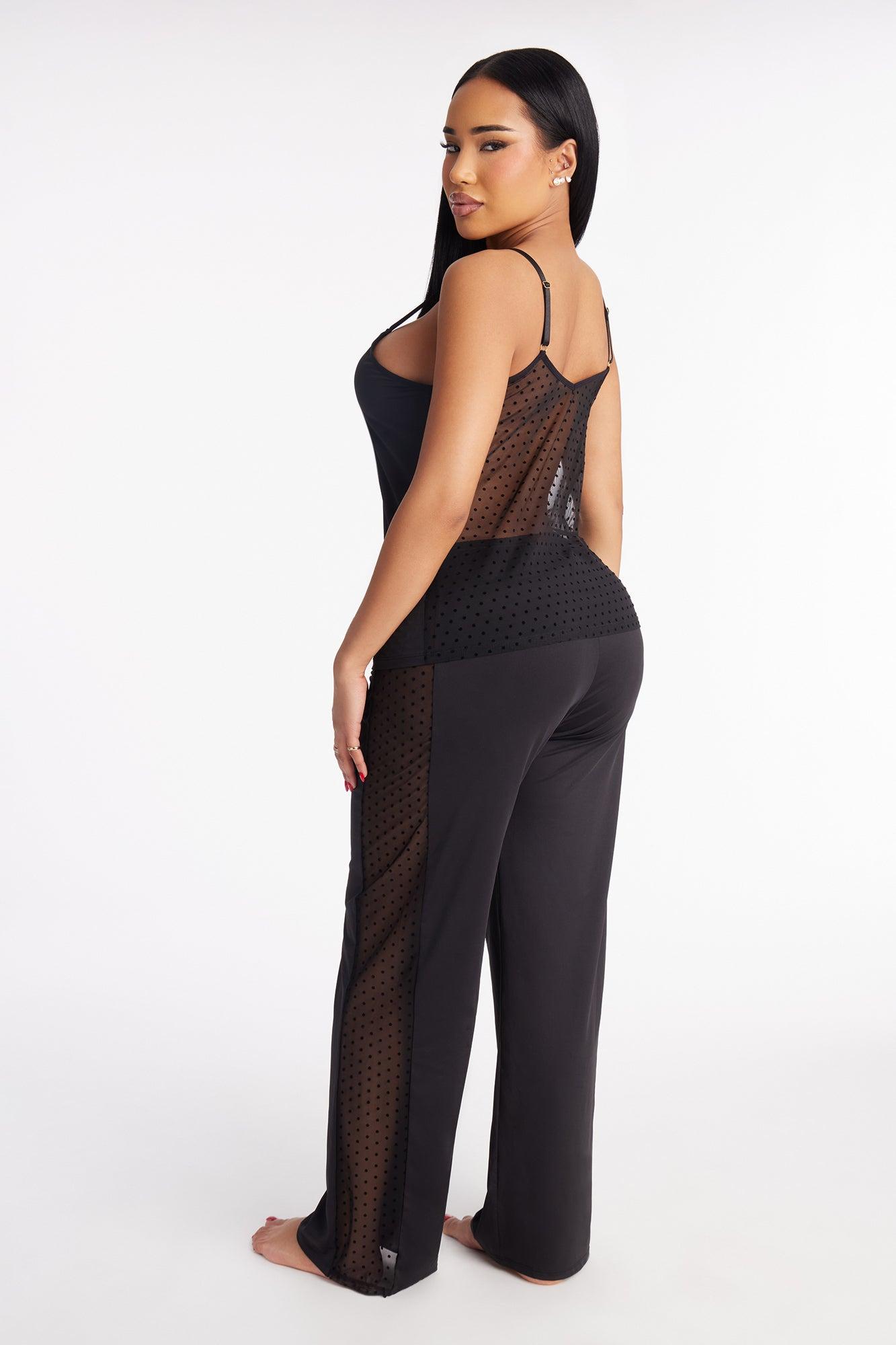 Available In Black. 2 Piece Cami Set Microfiber Dotted Mesh Heart Detail Adjustable Straps Mesh Back Detail Matching Pant Bottoms Wide Legged Mesh Side Panels Final Sale Mesh : 84% Polyester 16% Spandex Microfiber : 90% Polyester 10% Spandex Imported