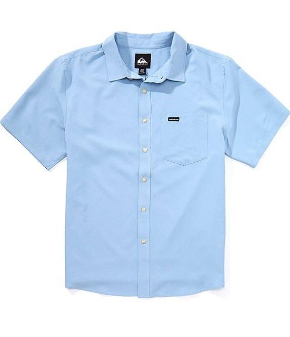 From Quiksilver, this shirt features: Solid Collared neckline Short sleeves Button-front closure Single patch pocket Woven polyester Machine wash/tumble dry Imported.