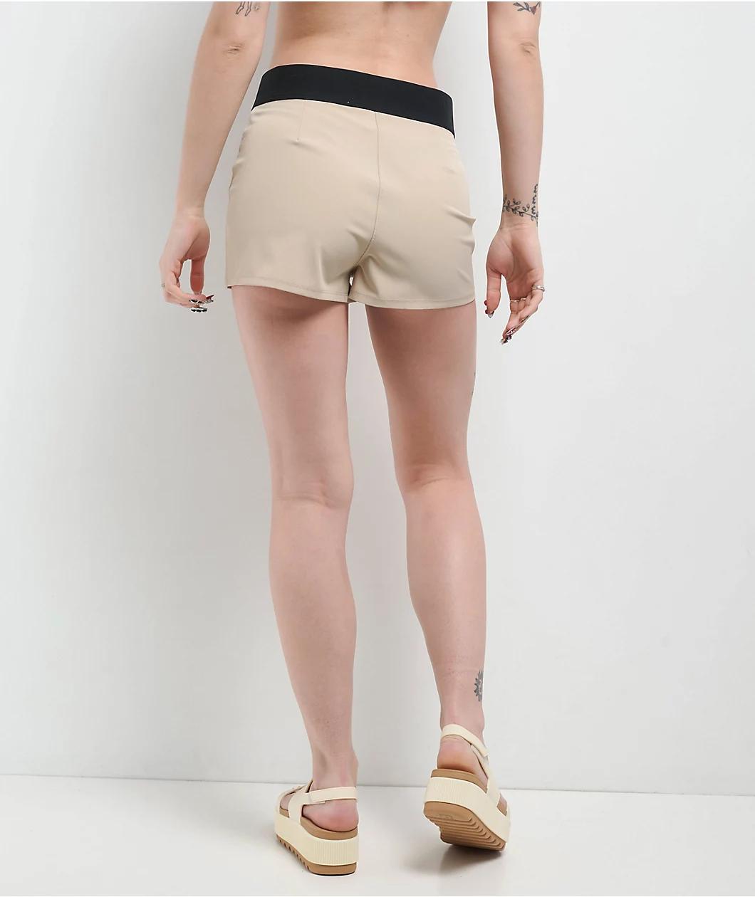 Designed by Quiksilver in women's sizing, the Kelli Contrast board shorts are presented in a tan tone with a solid black adjustable waistband. Adorned with a woven brand label on the left leg, the lightweight swimwear is made from a stretchy polyeste