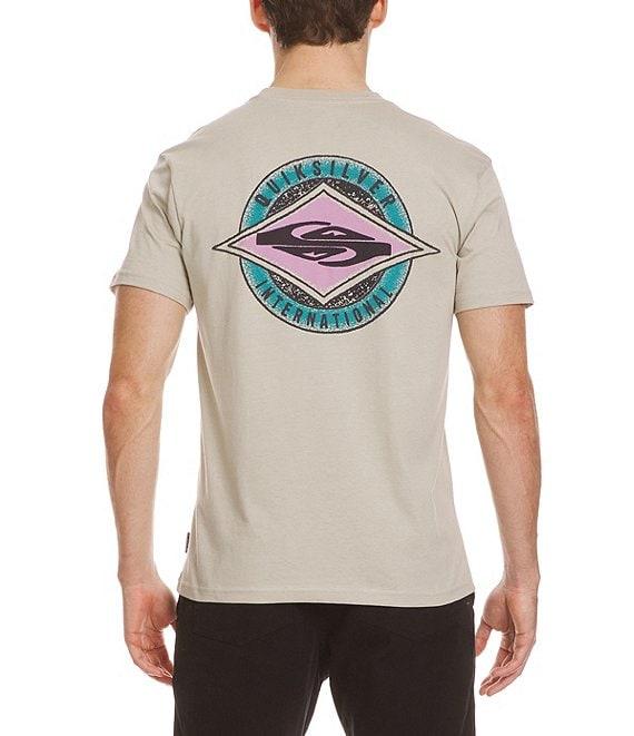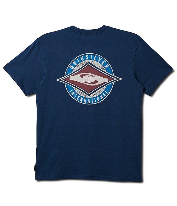 From Quiksilver this t-shirt features: Crew neckline Short sleeves Circle-shaped graphic with Quiksilver logo, icon logo detail, and other verbiage Pullover construction Regular fit Ringspun combed cotton jersey Machine wash/tumble dry Imported.