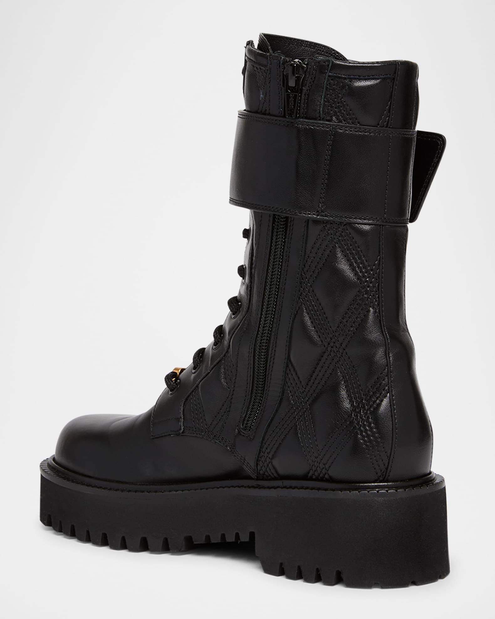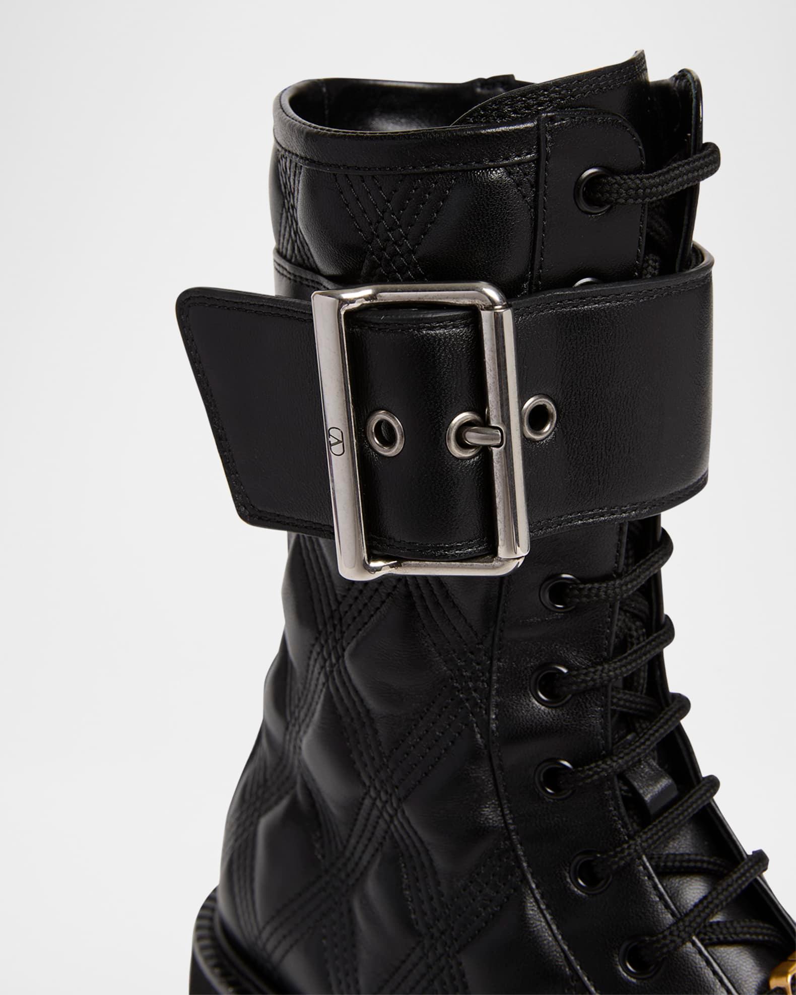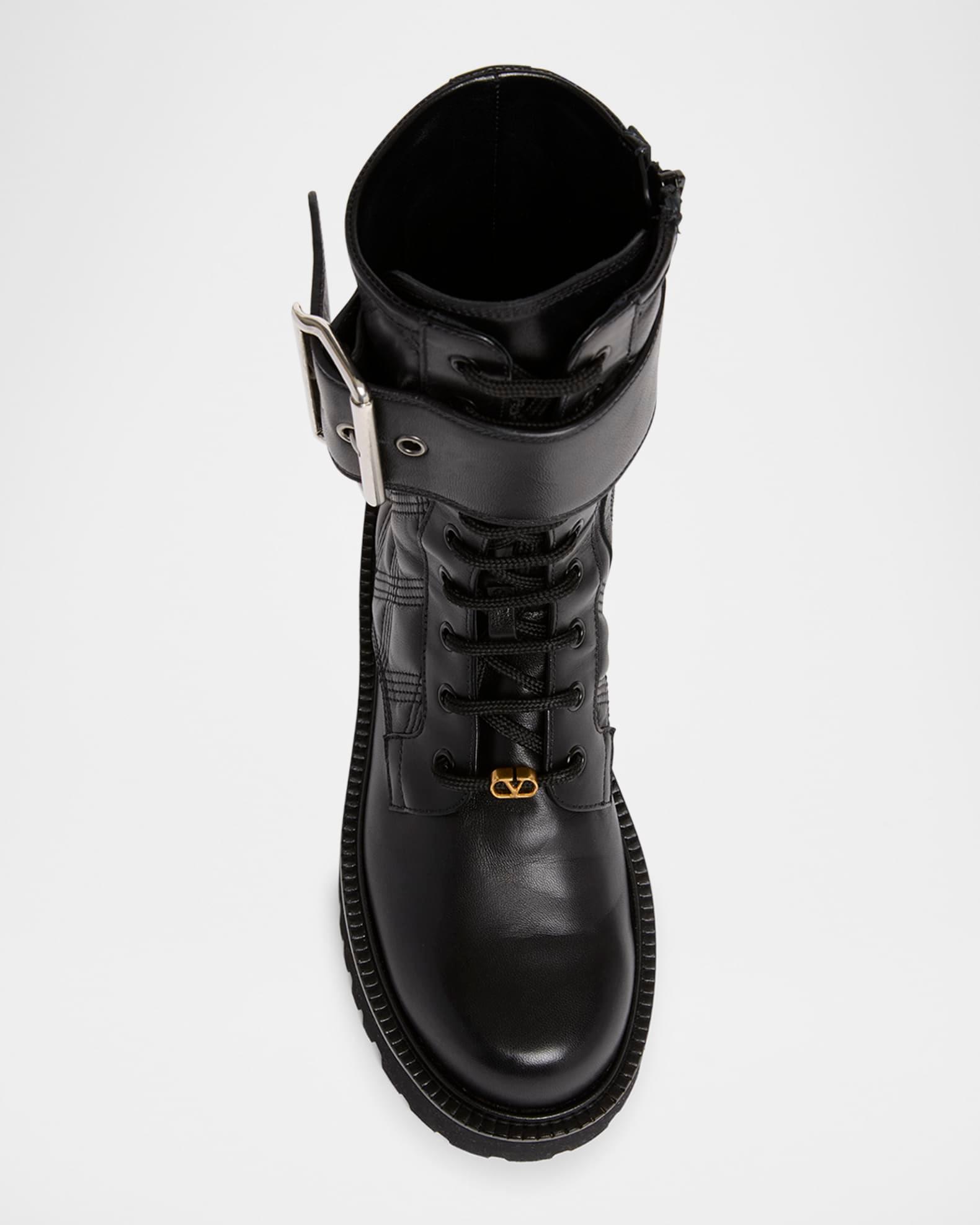 Valentino combat boots in quilted calf leather with VLogo detail 1.50 in / 40 mm block heel Round toe Lace-up vamp Adjustable side buckle strap Leather lining and sole Made in Italy