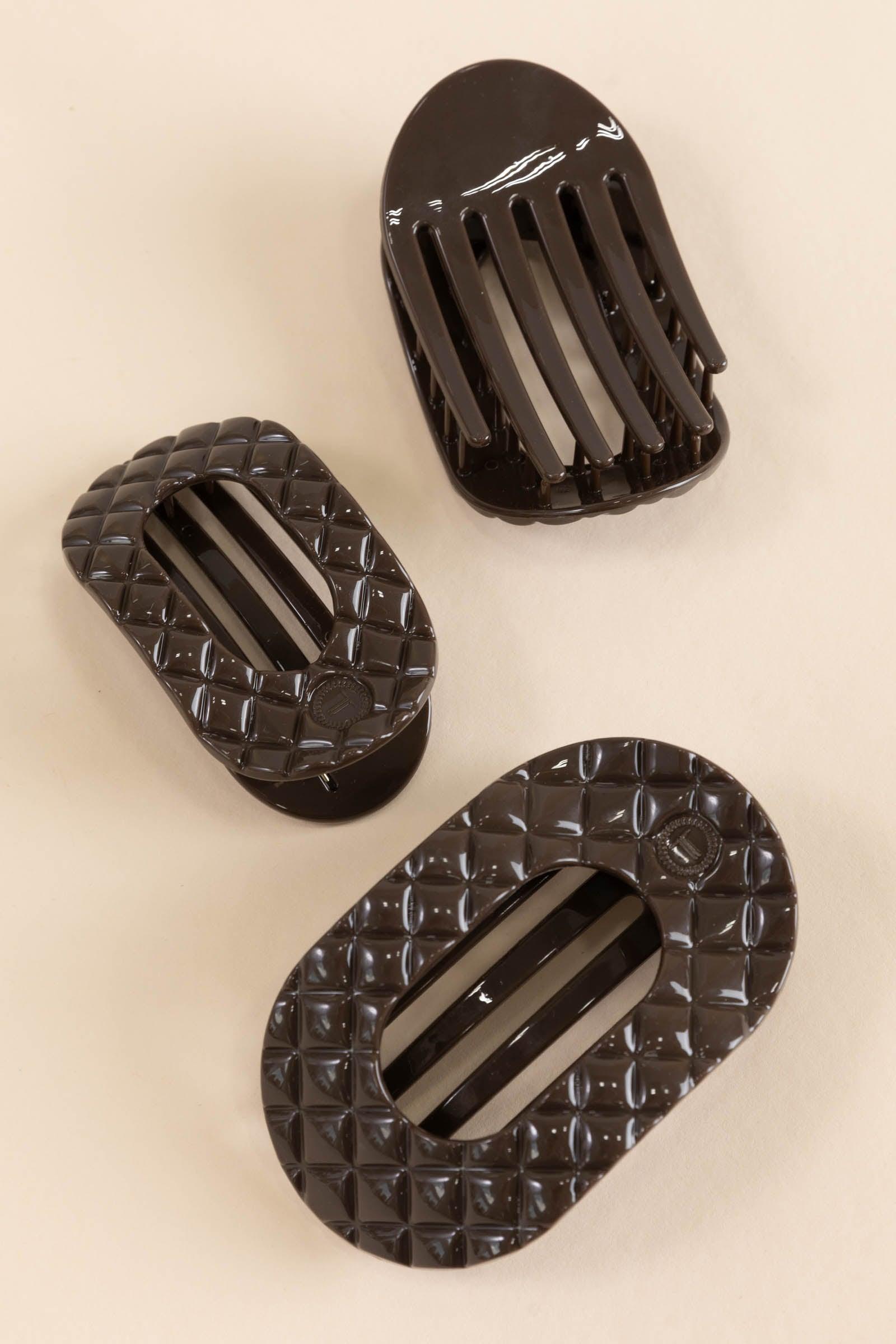 Product Details Colors: Jet Black: Black Truly Taupe: Brown Other Details: This hair clip has a quilted texture design. It is also designed to allow you to lay back flat, do yoga, or sit comfortably in a seat with a headrest, and it is made with the same material that is nearly unbreakable. Lay down flat with comfort Bendable teeth for a secure yet gentle hold Lightweight, durable, and hair-friendly Perfect for all-day wear—from sunup to sundown The small size is suitable for thin to medium hair types, whether worn up or half-down. Medium clips are great for thick to medium thickness of hair. The large size is great for thick hair. Brand: Teleties Size and Fit Small: 3.25" Medium: 3.75" Large: 4.25"