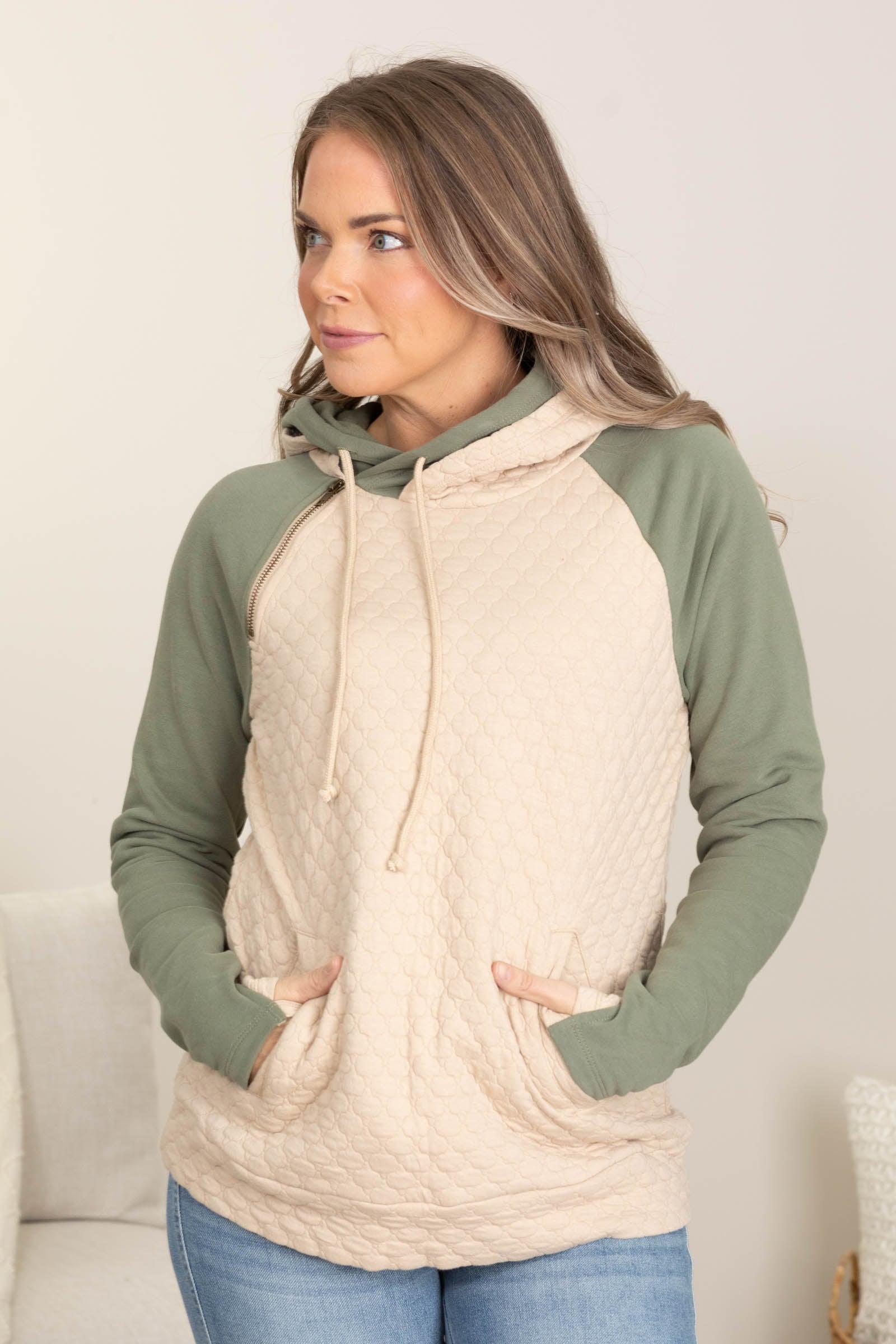 Product Details Colors: Oat, Sage/ Dusty Rose, Heather Grey Print: Two Tone Neckline: Round Hooded Sleeve: Long Sleeve Hemline: Straight Brand: Doe And Rae Material and Care 52% Polyester 45% Cotton 3% Spandex Contrast: 84% Rayon 16% Spandex Hand Wash Cold Hang/ Line Dry Size and Fit Small: Bust 38" Waist 36" Length 24.5" Medium: Bust 40" Waist 38" Length 25" Large: Bust 42" Waist 40" Length 25.5" Erica is 5’7” and wearing her true size small