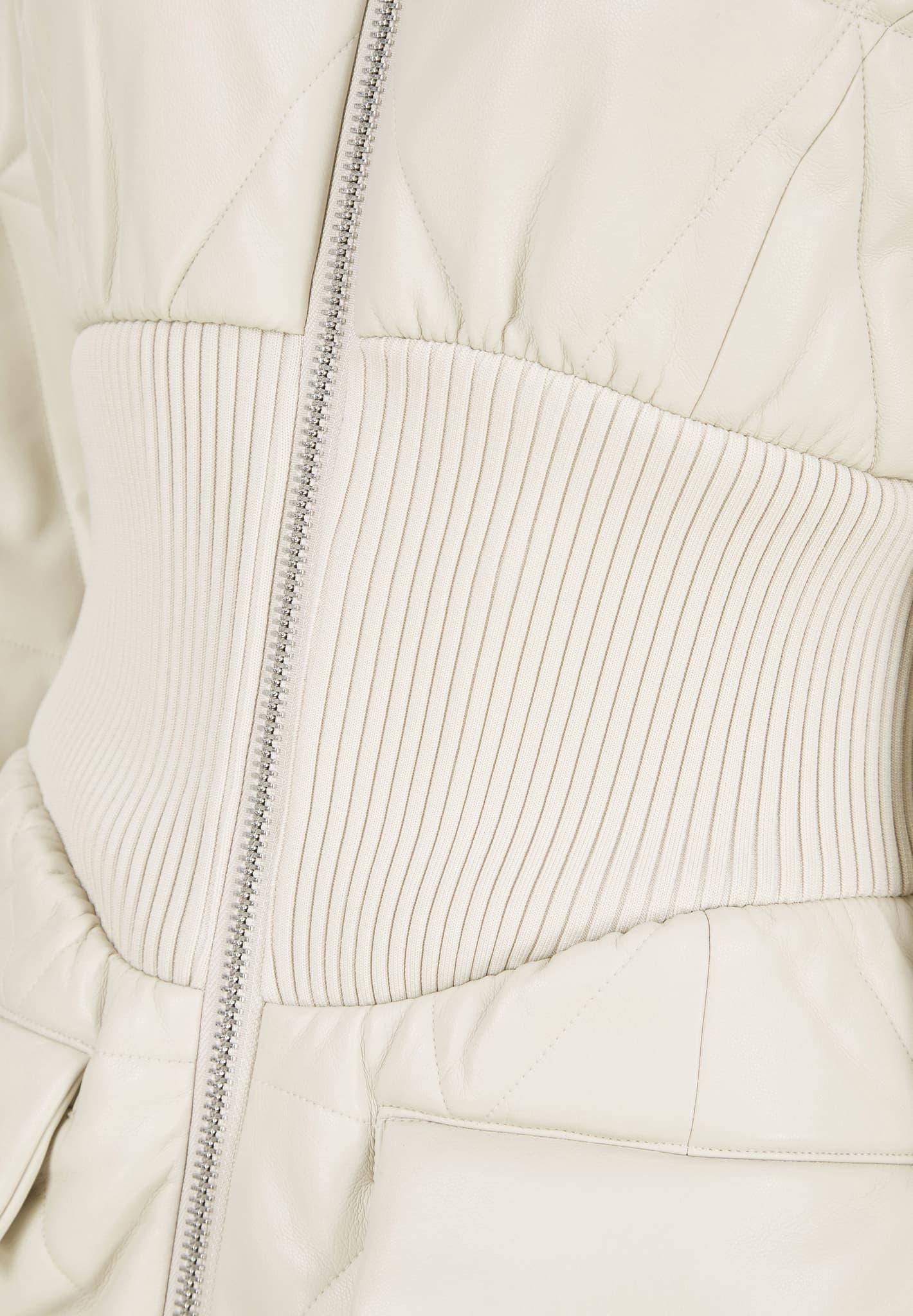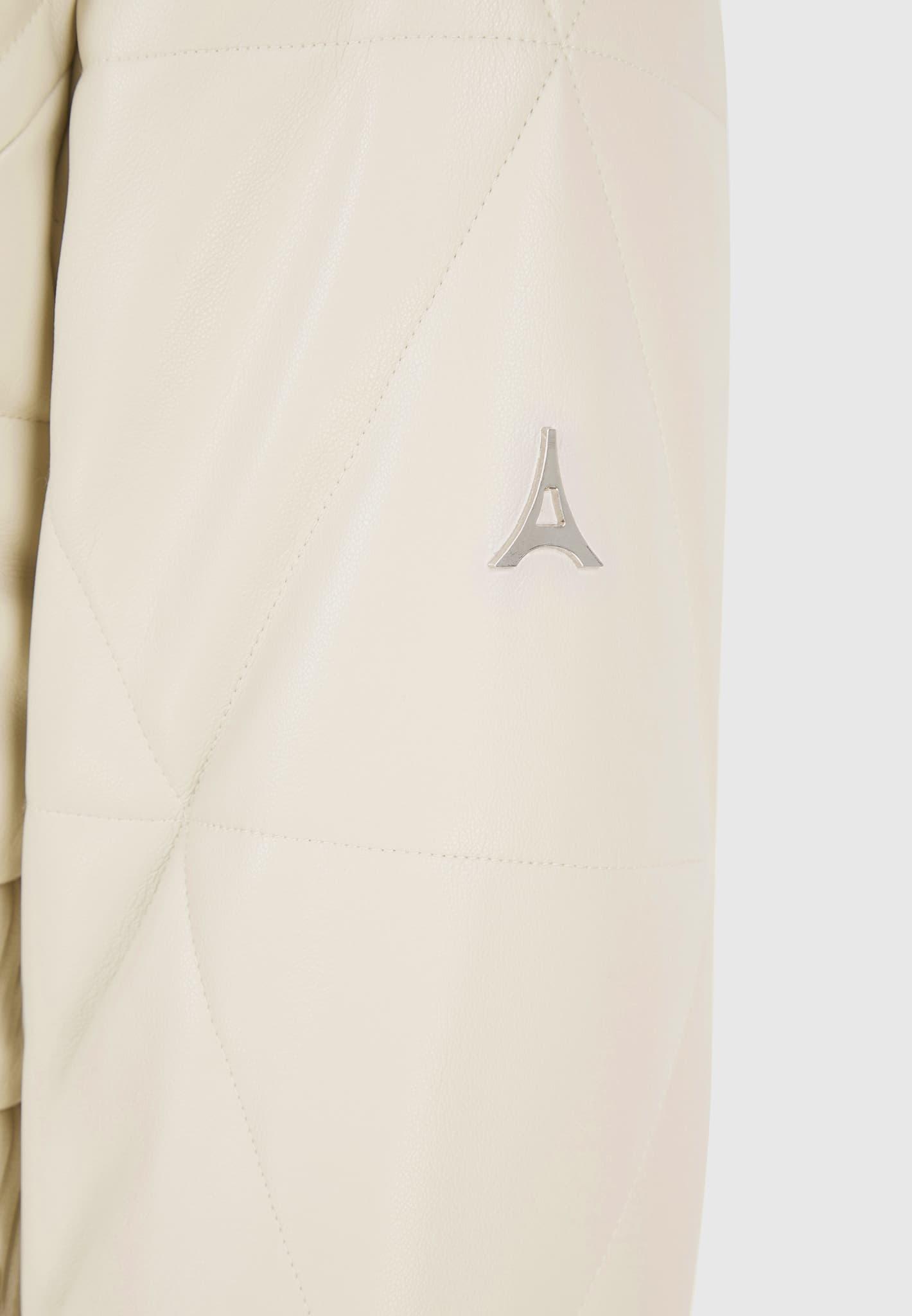Featuring a deep ribbed corset-style waist, this coats falls effortlessly on the body due to the soft vegan leather fabric to create a relaxing silhouette while drawing in at the waist. Longline Coat Silhouette Vegan Leather Ribbed Waist Faux Front Pockets Storm Cuffs Ribbed Inner Cuffs with Thumbholes High Neck Triangle Quilting Silver 3D Manière De Voir Plaque