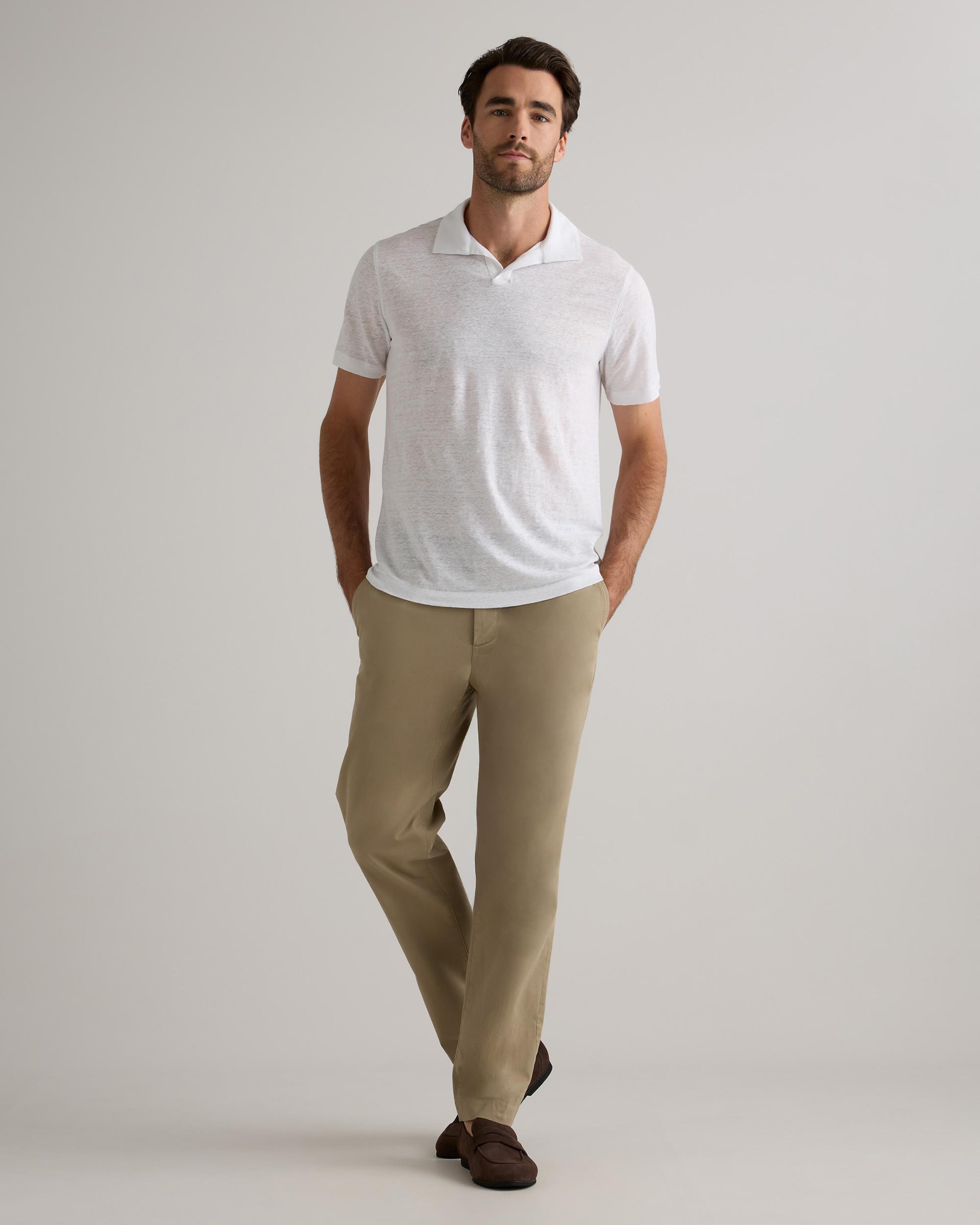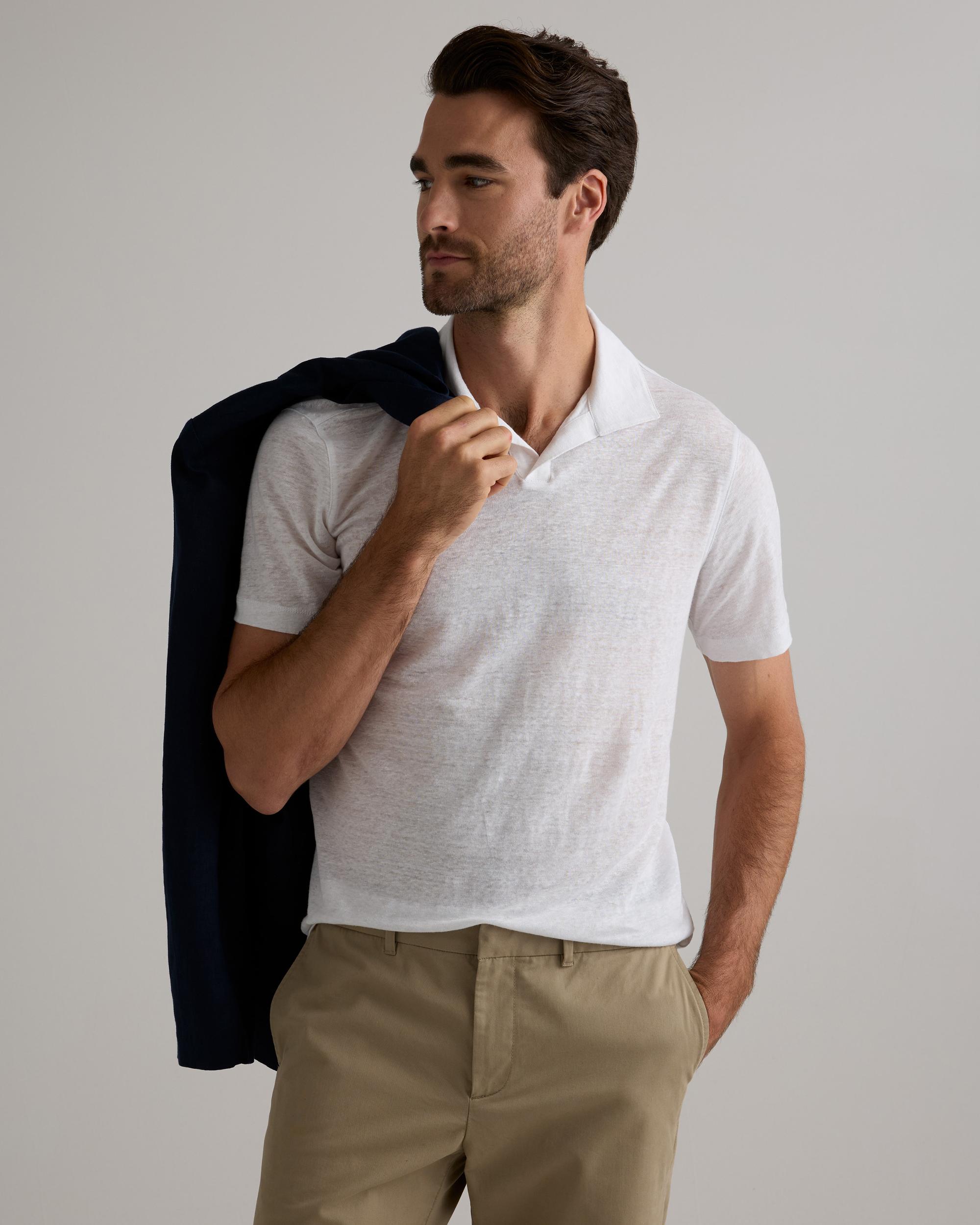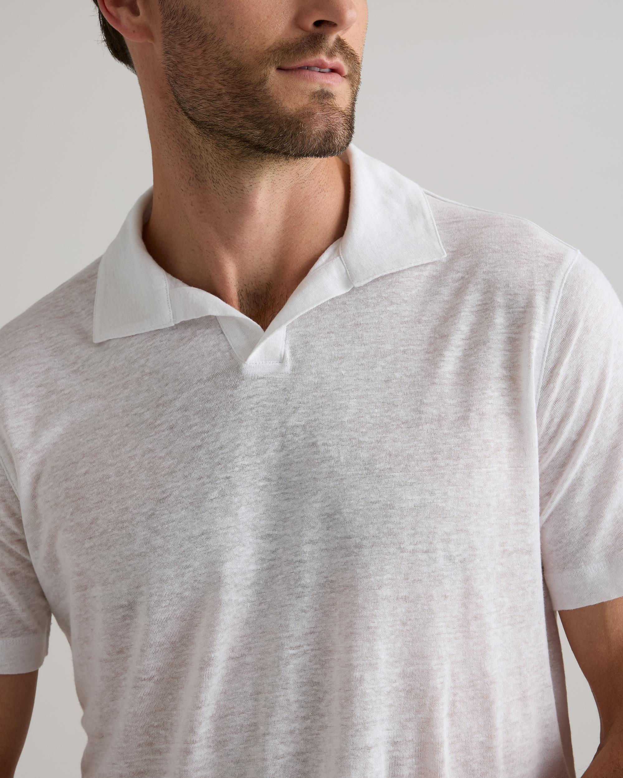 Discover our Men's 100% European Linen Jersey Polo, expertly crafted from a luxurious 180 gsm fabric that strikes the ideal balance between timeless style and comfort. This polo showcases a refined silhouette with a casual, classic fit, made from loosely woven, lightweight, and breathable linen to keep you feeling fresh and comfortable all day. Elevate your everyday look with this versatile piece that seamlessly blends sophistication with laid-back charm. | Quince | Men's 100% European Linen Jersey Polo in White, Size Medium