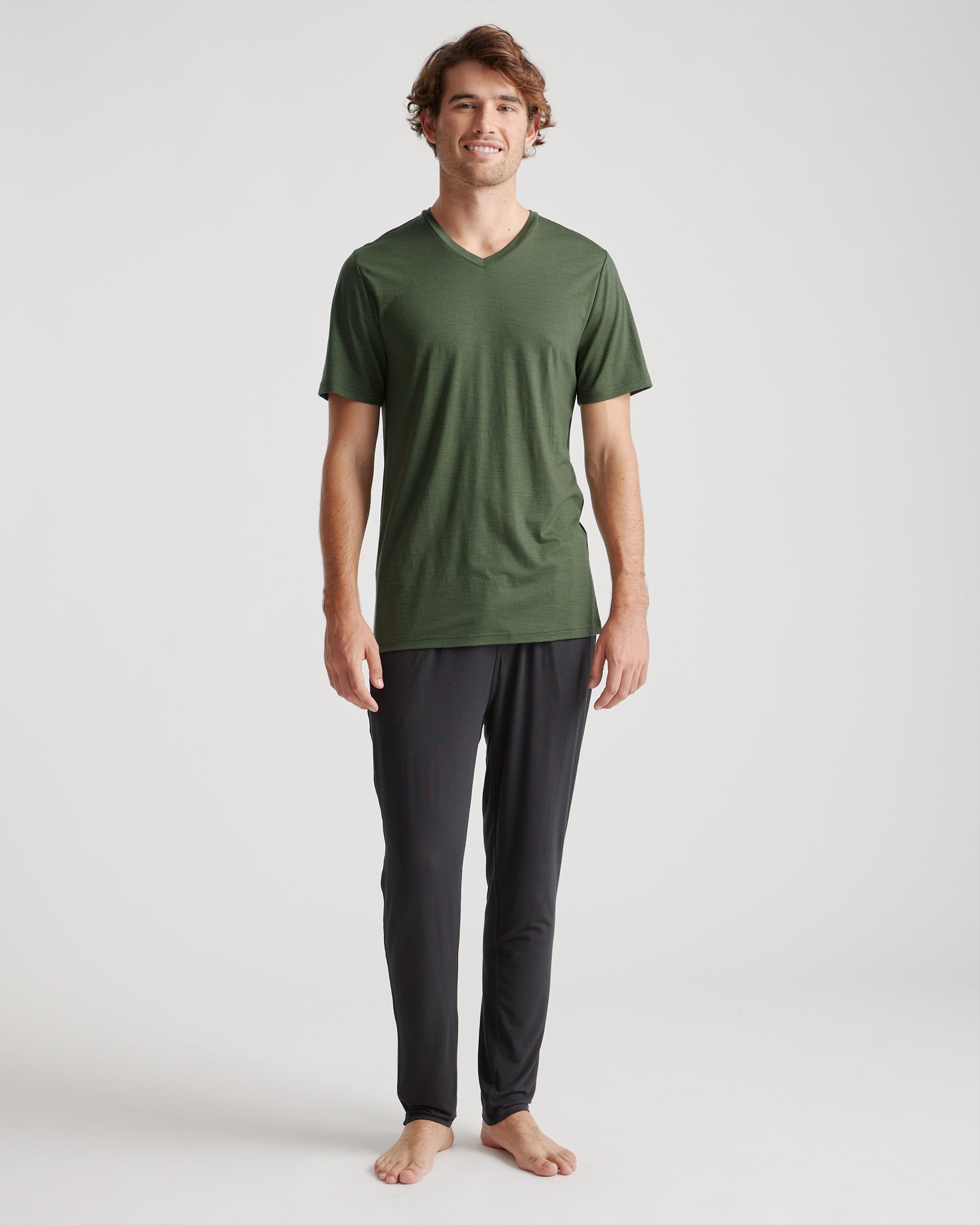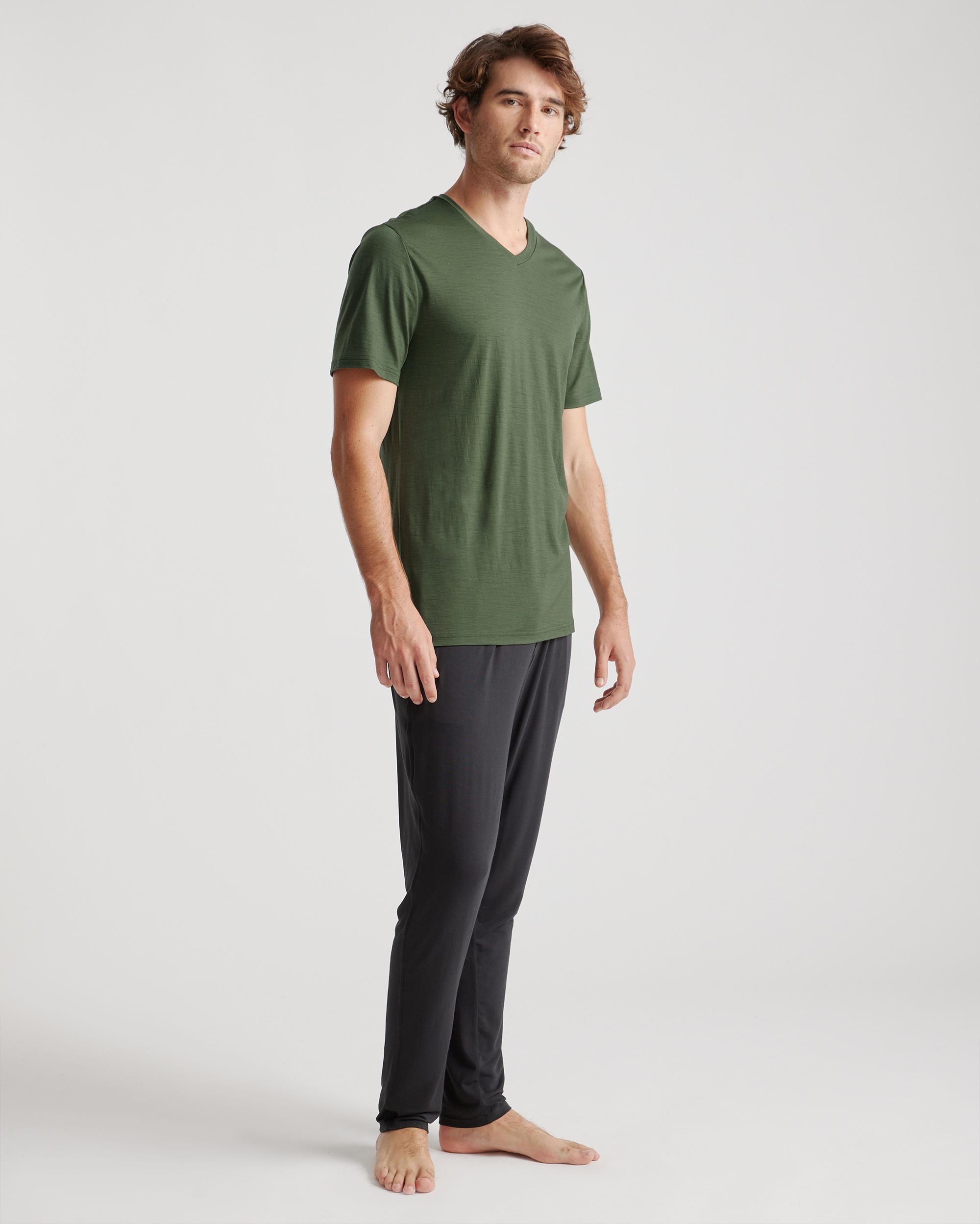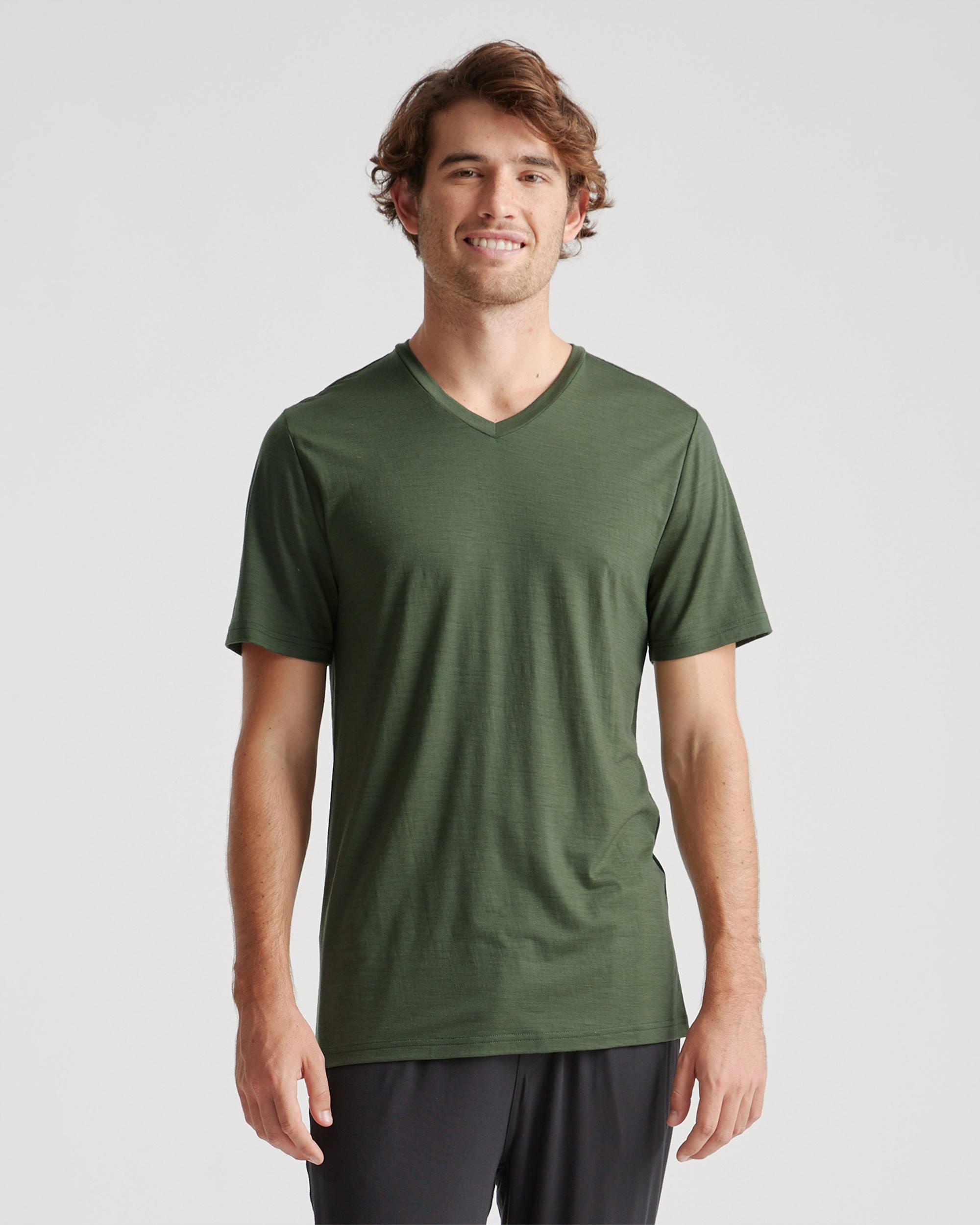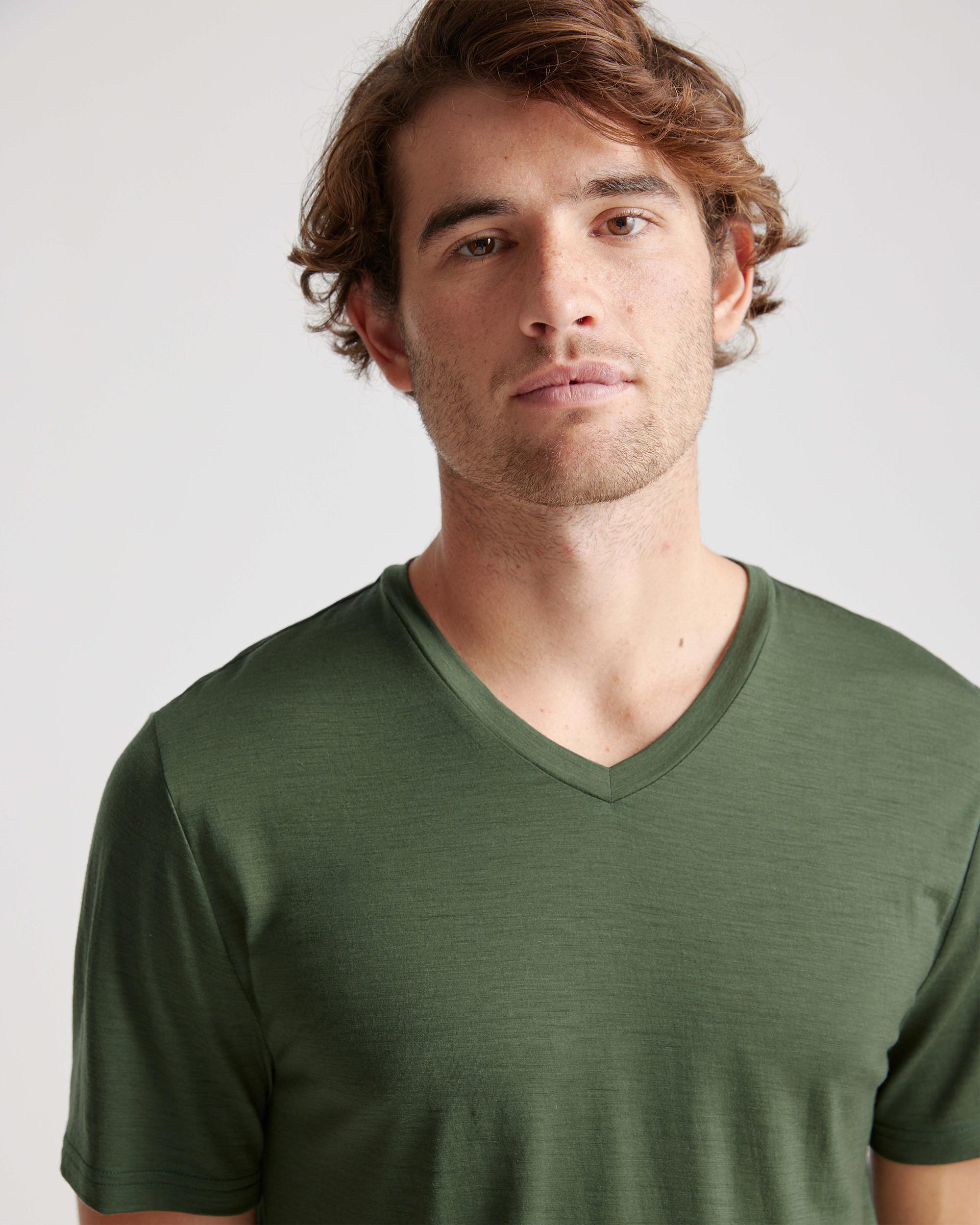 This versatile merino tee is a true all-season all-star. Merino is naturally heat-regulating, so it will help you stay warm in winter and cool in summer. And with its natural elasticity, you'll feel comfortable all day no matter what you're doing. The benefits of merino are plentiful: it's biodegradable and renewable for lessened environmental impact; wrinkle- and UV-resistant for long-lasting low maintenance; and naturally breathable for comfort. | Quince | Men's 100% Merino Wool All-Season V-Neck Base Layer T-Shirt in Green, Size Medium, Merino/Cotton