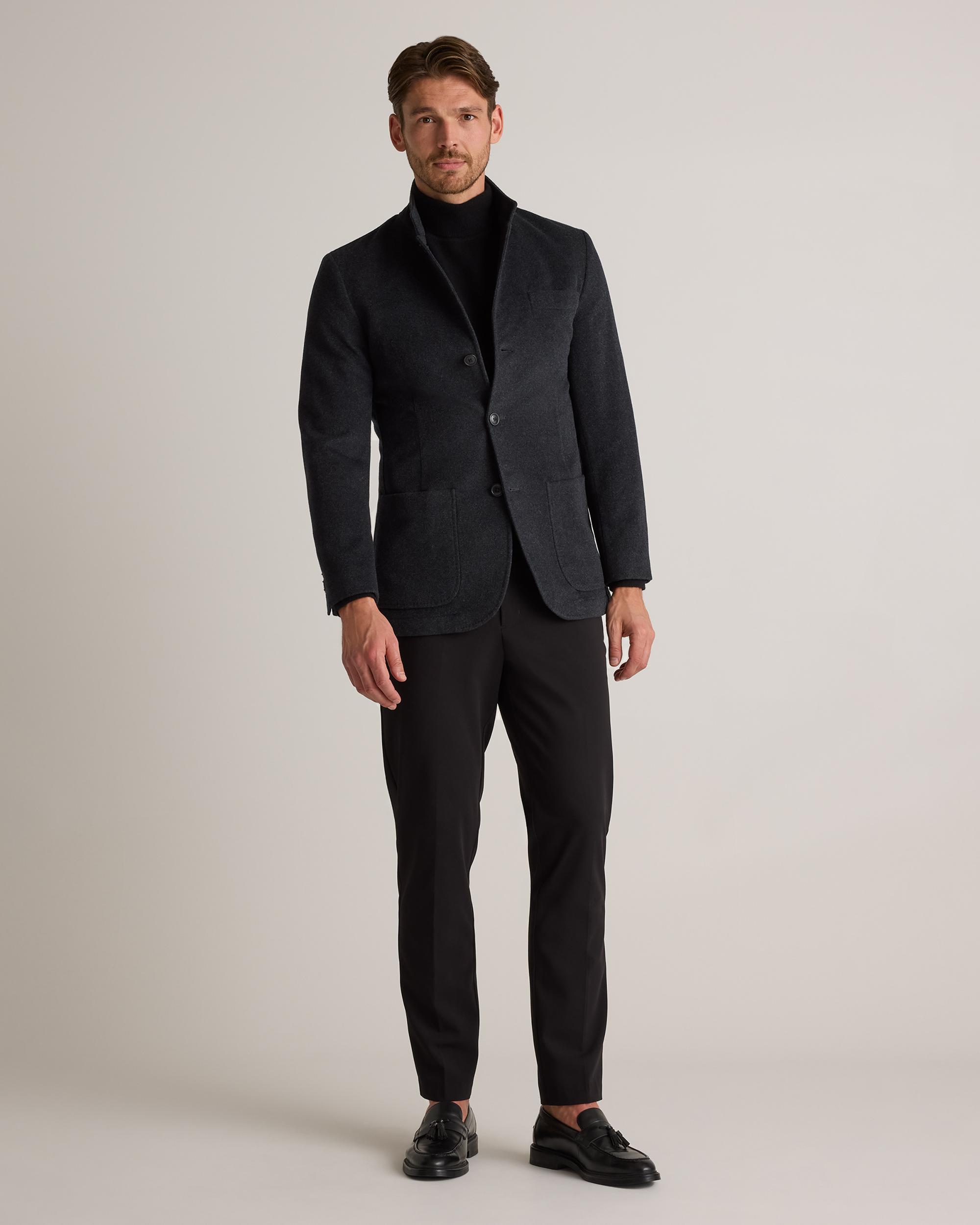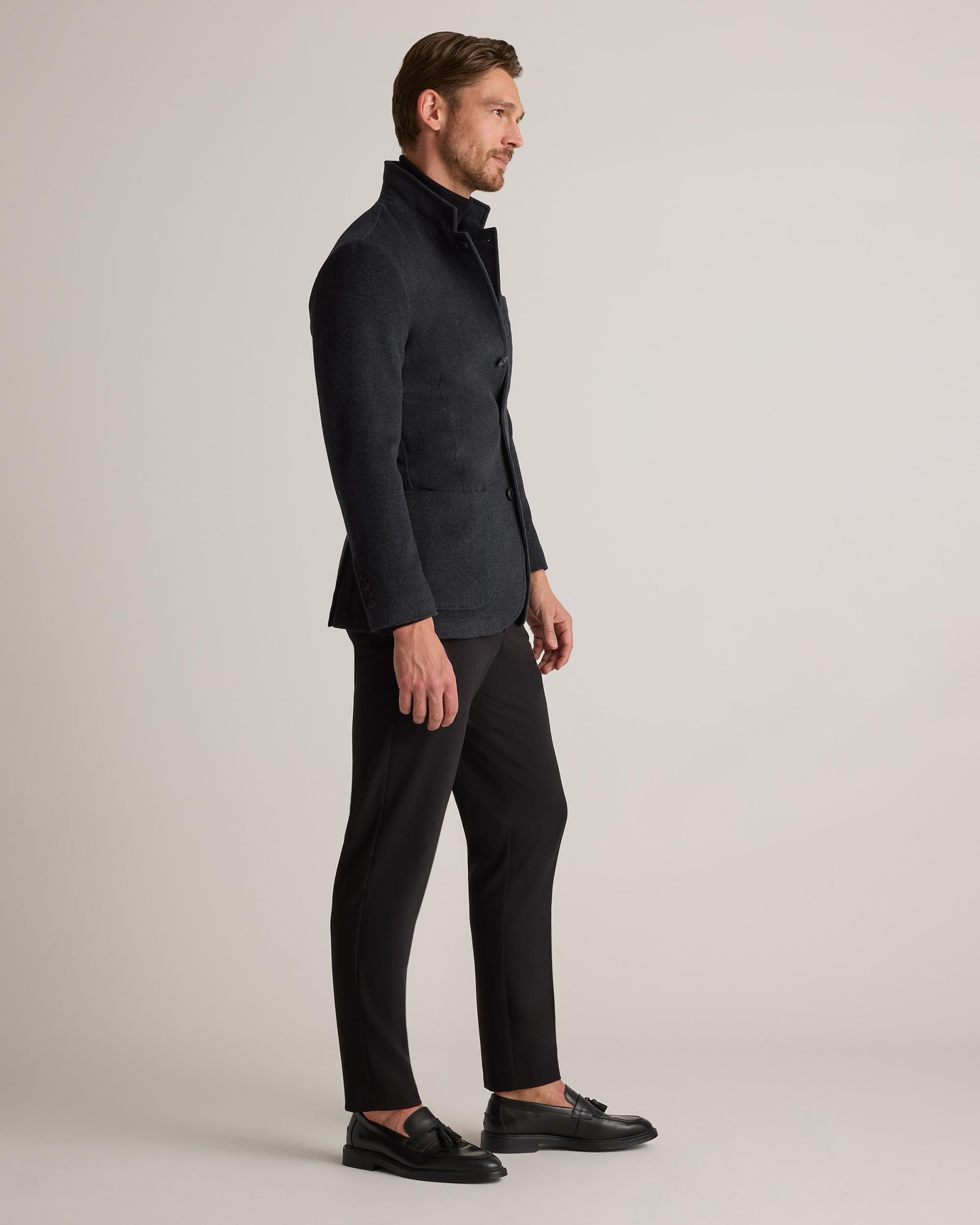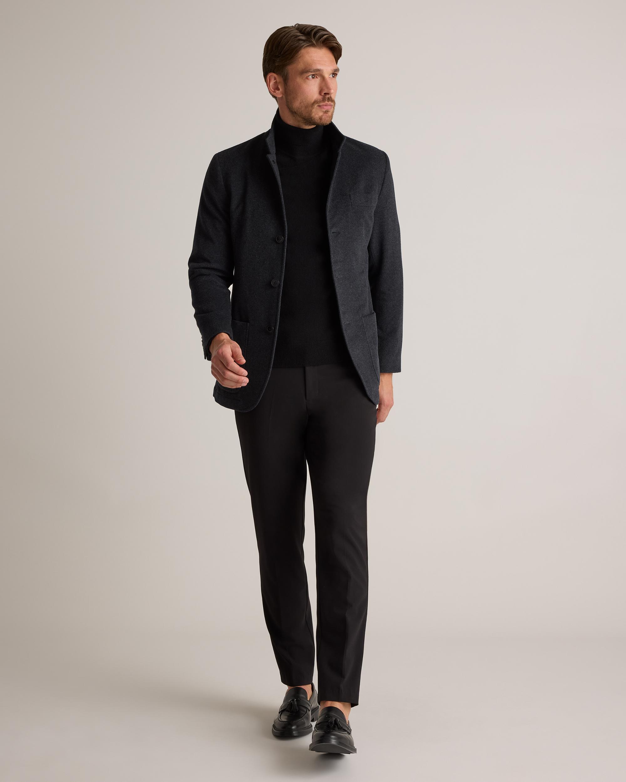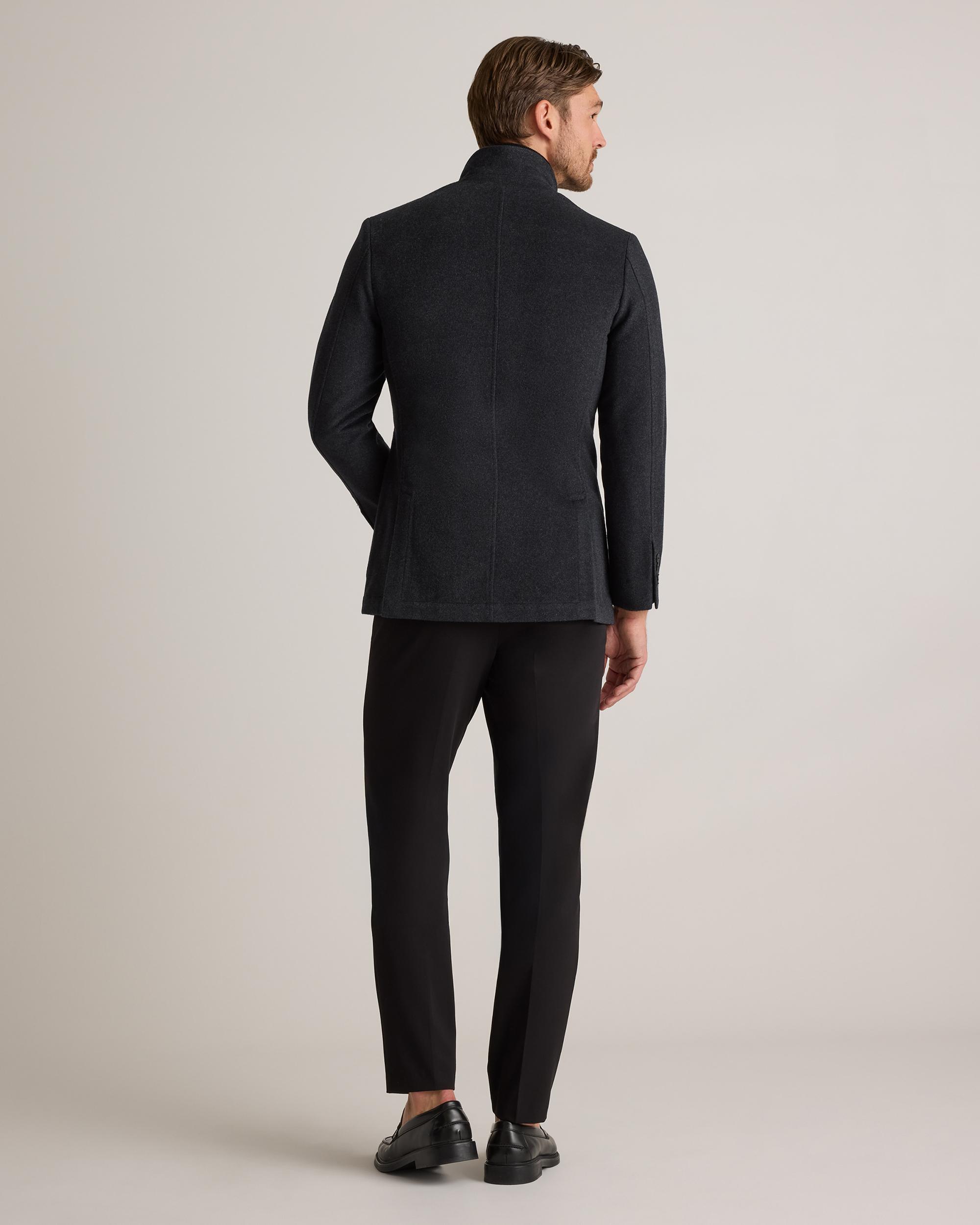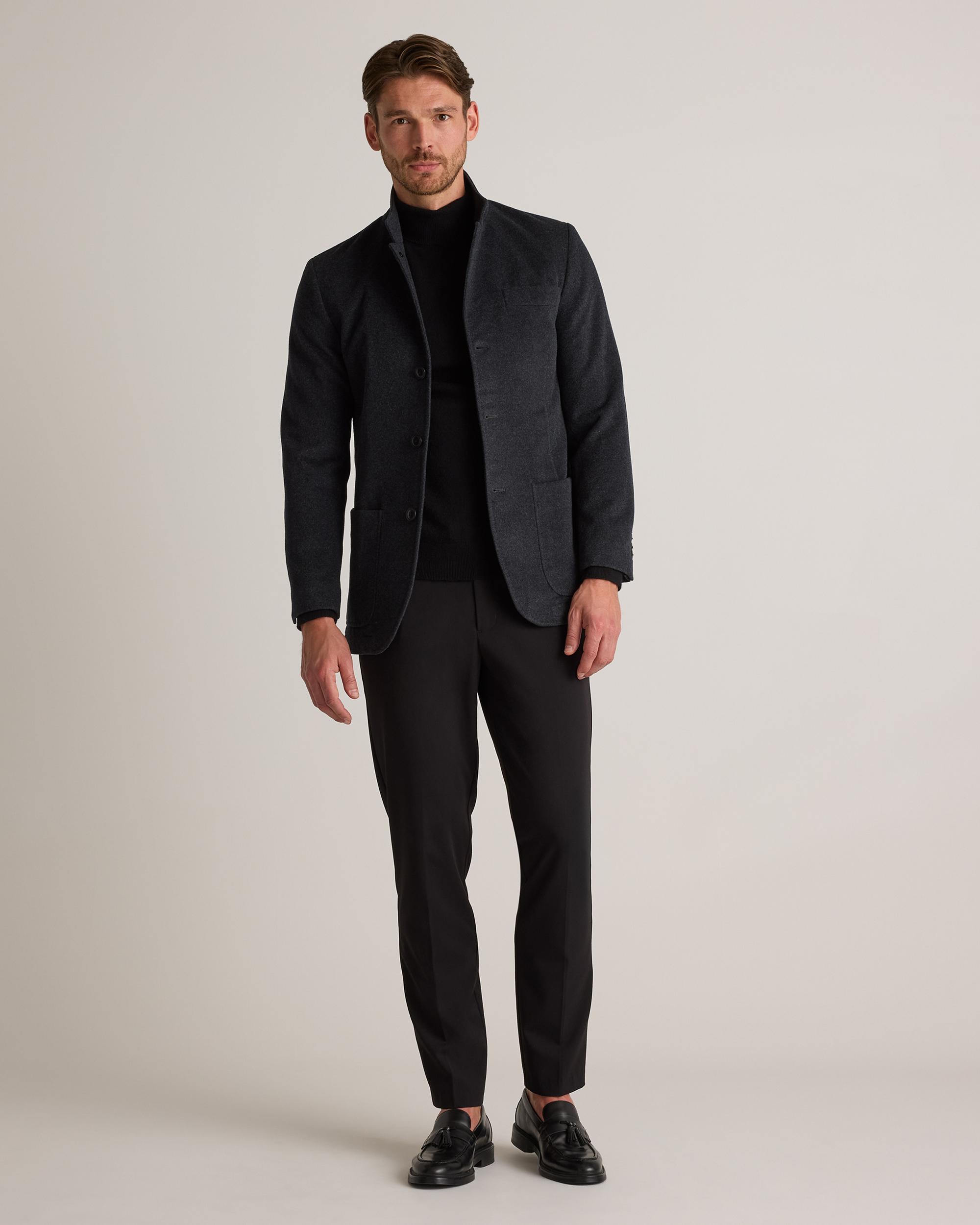 Crafted from luxurious 100% Mongolian cashmere, this stand collar blazer combines classic tailoring with modern sophistication. Lightweight yet exceptionally warm, it features refined details such as lapels, patch pockets, Cupro lining, and precise seams for a polished finish. The sleek stand collar adds a contemporary touch, while the water-resistant finish ensures it’s as practical as it is luxurious. Versatile and effortlessly elegant, this blazer transitions seamlessly from casual to formal. | Quince | Men's 100% Mongolian Cashmere Stand Collar Blazer in Heather Graphite, Size Small