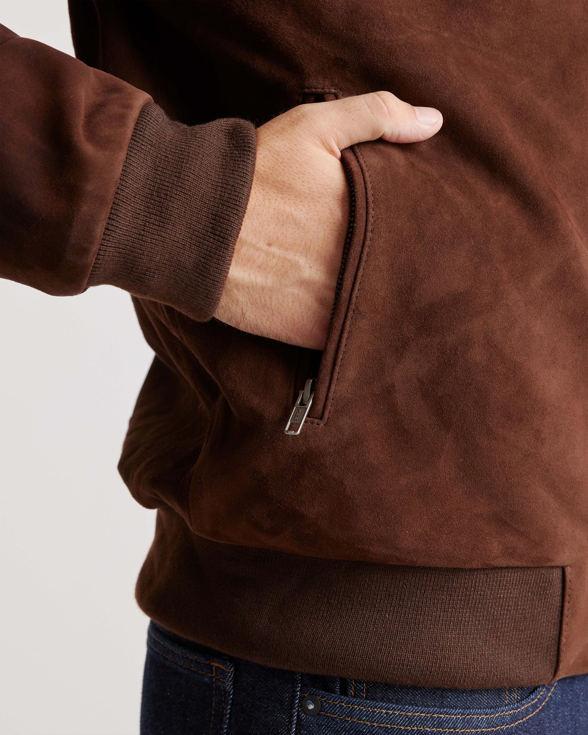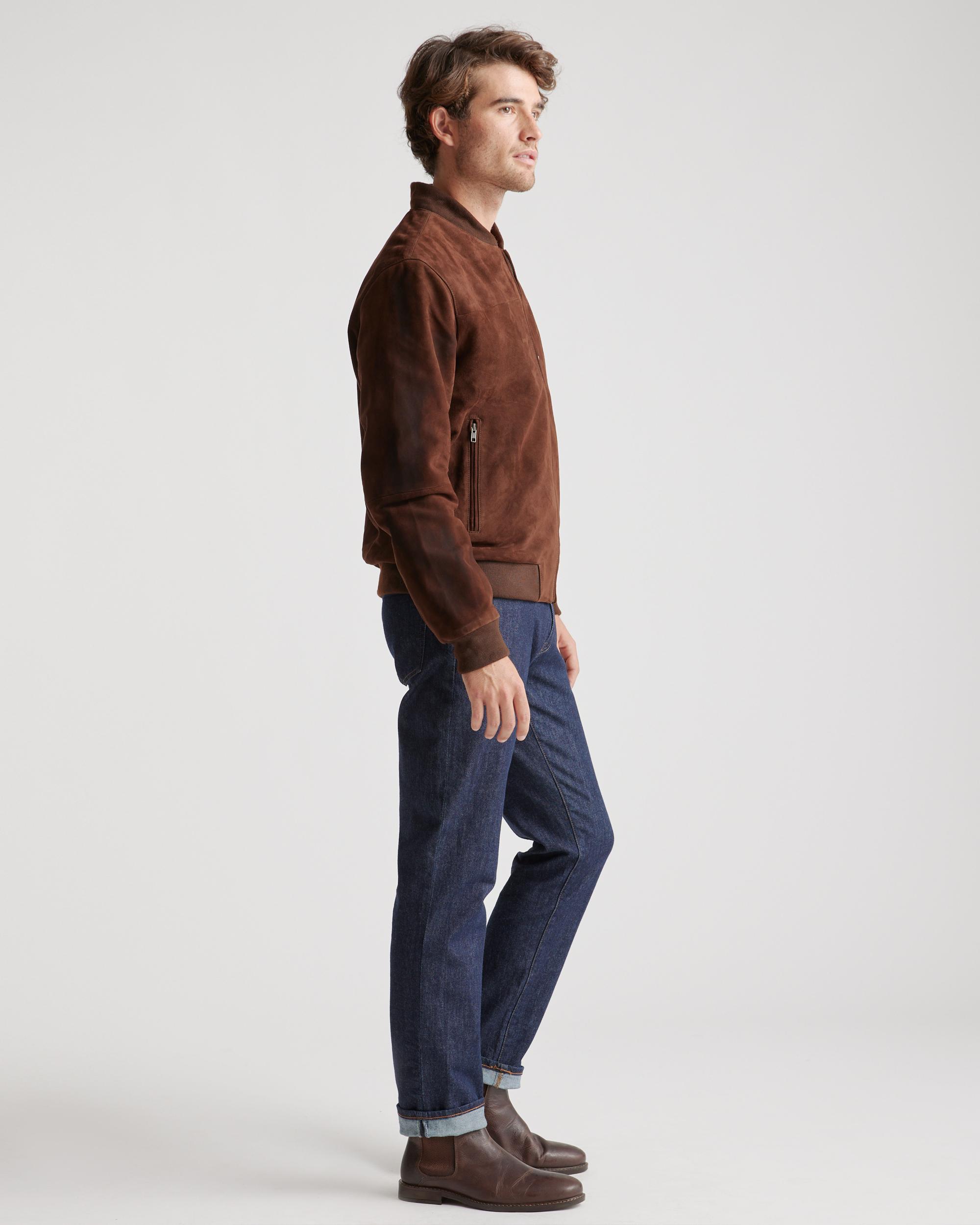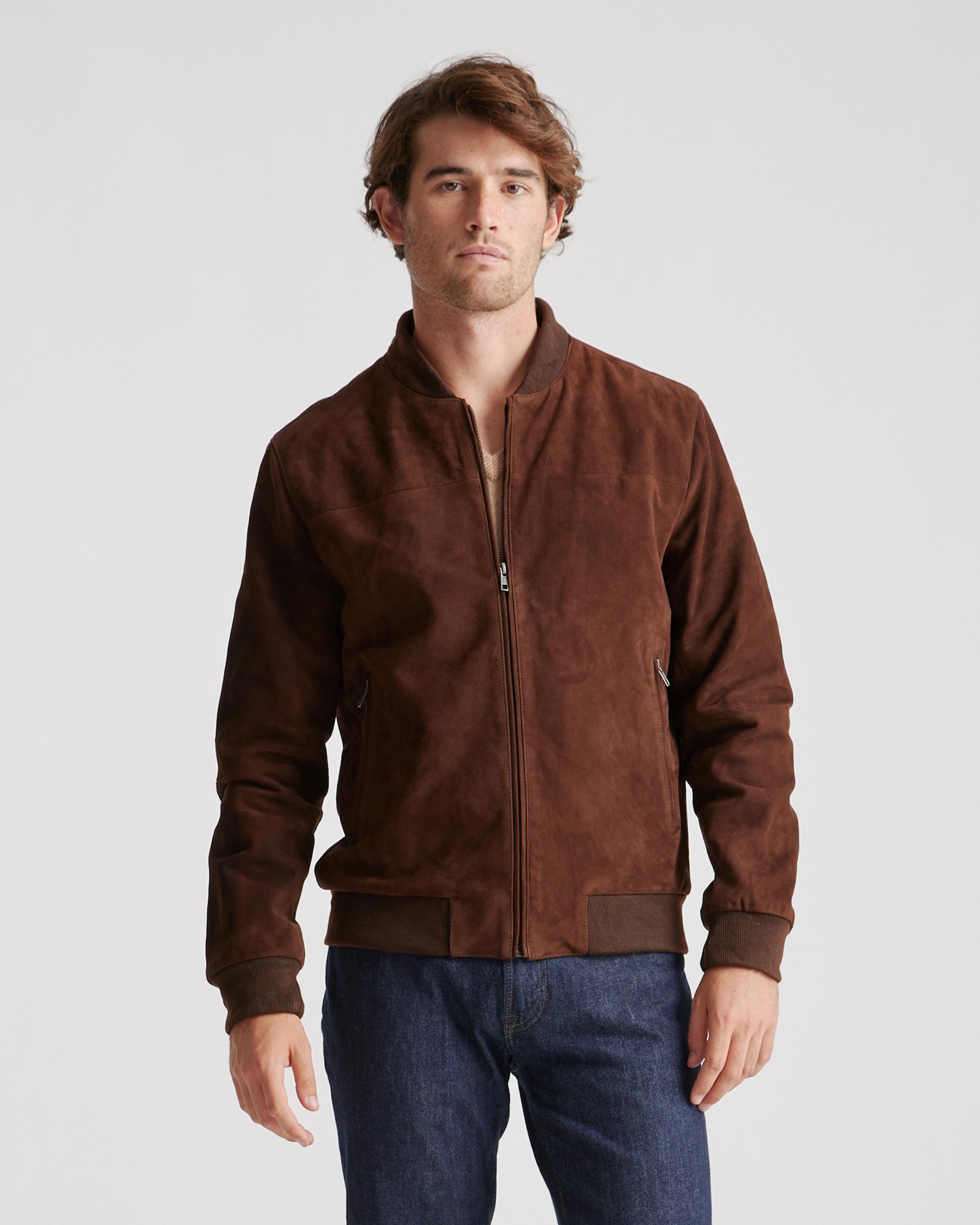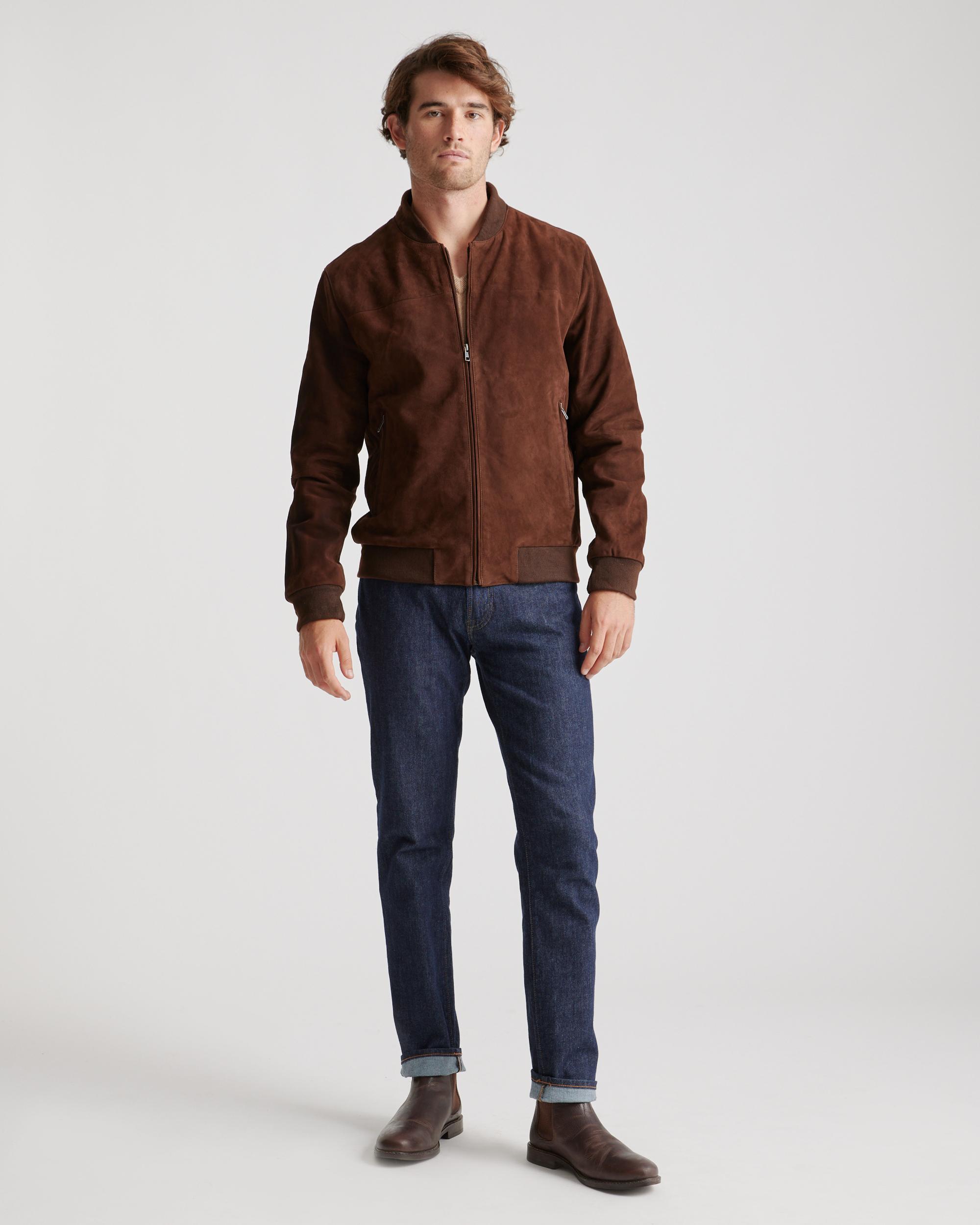 Made from 100% goat suede leather, this bomber jacket is the perfect casual outdoor look as temperatures start to drop. With its inner lining, you'll stay cozy and comfortable. Read more about what makes our leather special in our Leather 101 guide. | Quince | Men's 100% Suede Bomber Jacket in Brown, Size XXL, Suede Leather