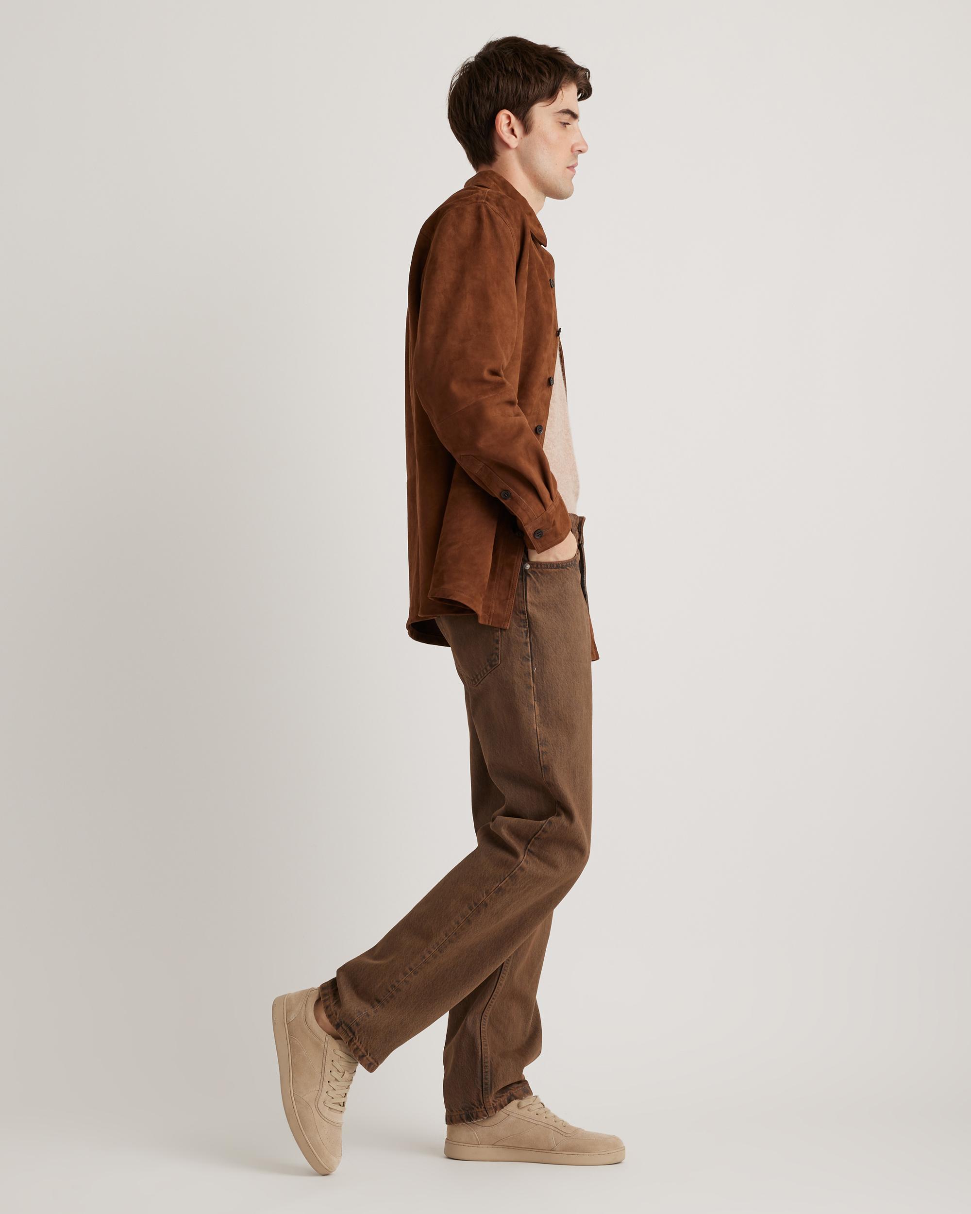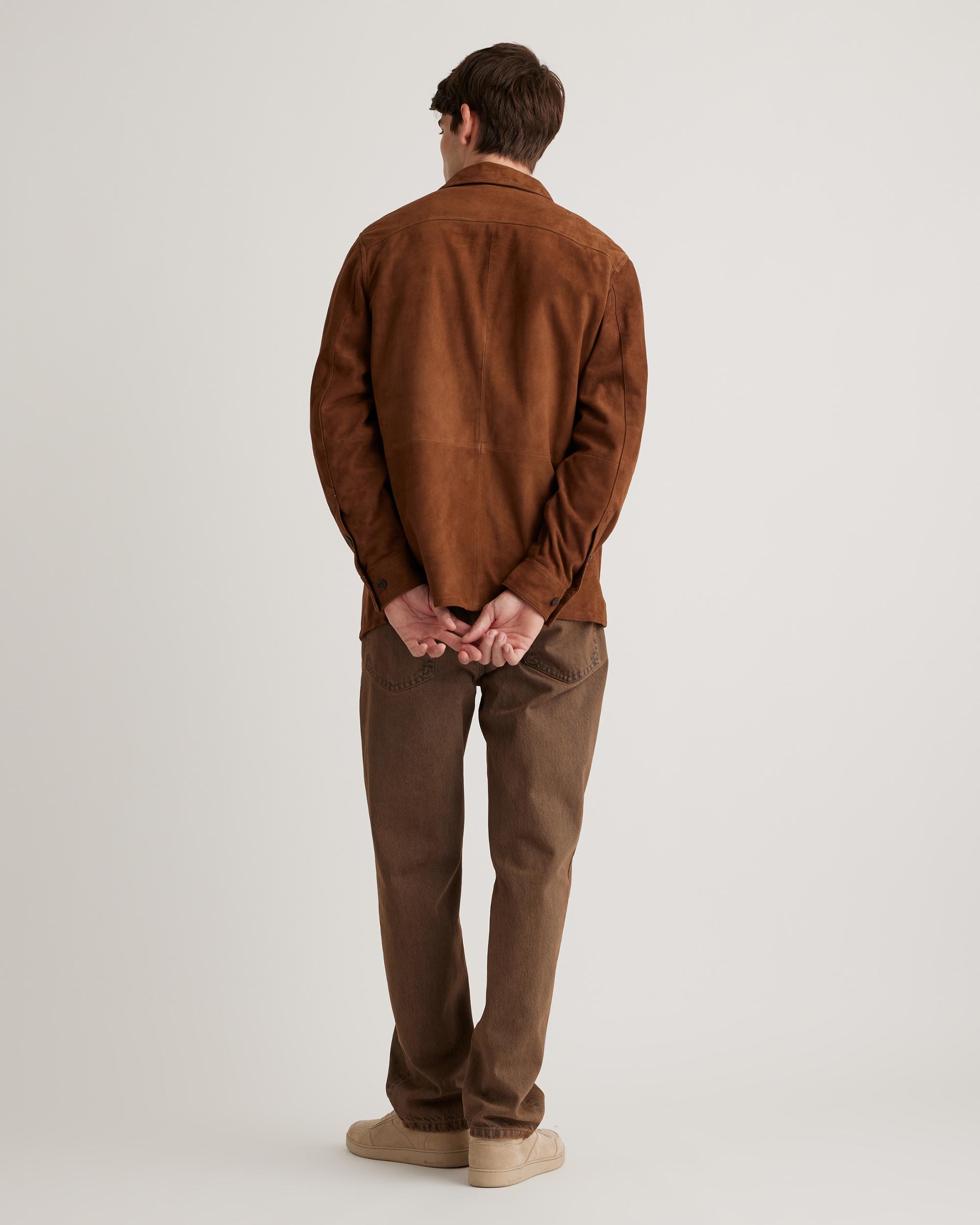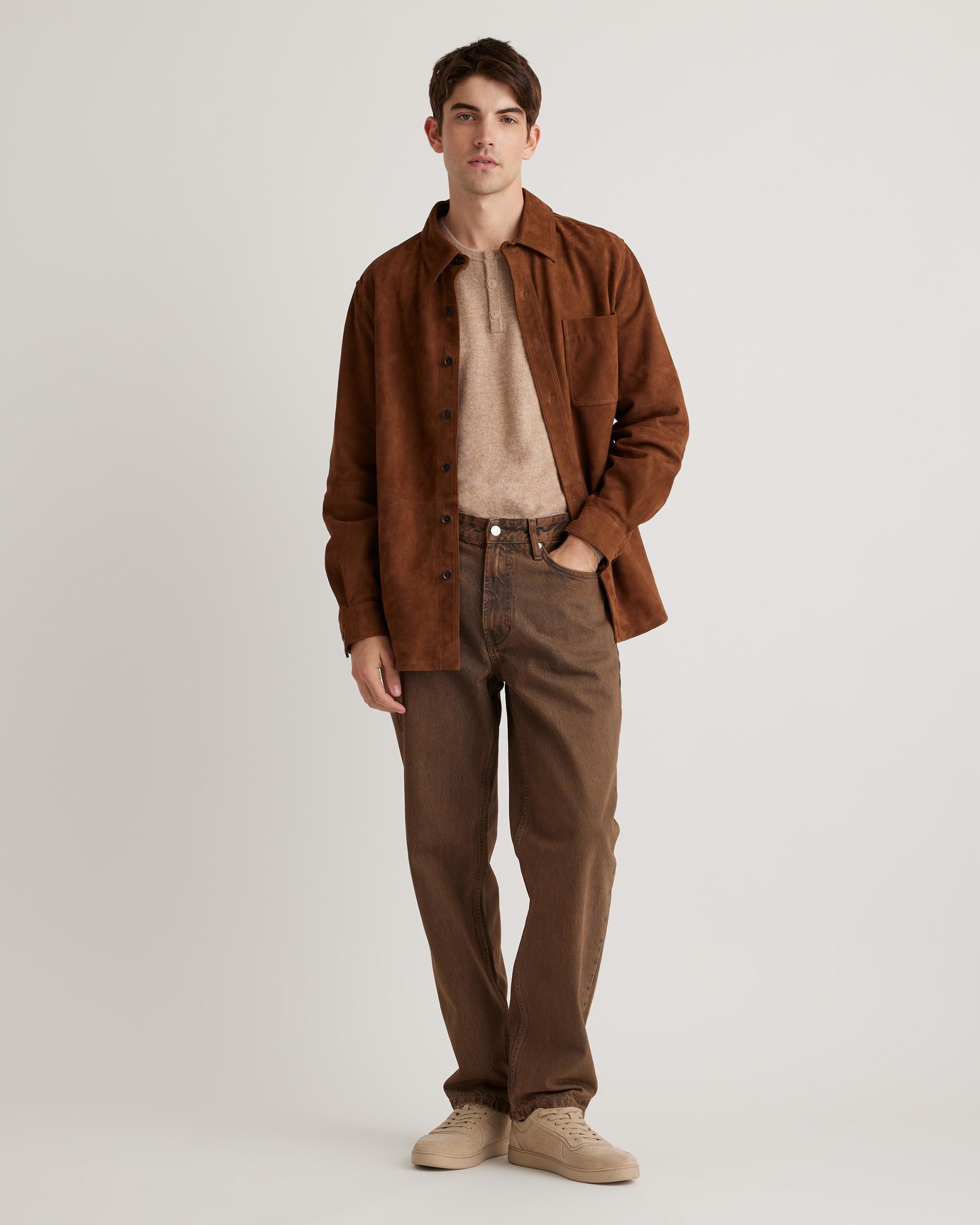 Our suede overshirt is here and it's the ideal blend of classic button-down shirt and luxe leather jacket. With a relaxed fit, it's perfect for layering—try wearing it open, like a traditional overshirt, paired with your favorite tee, or fully buttoned under a jacket as the temperature starts to drop. Read more about what makes our leather special in our Leather 101 guide. | Quince | Men's 100% Suede Overshirt in Dark Chestnut, Size Medium, Suede Leather