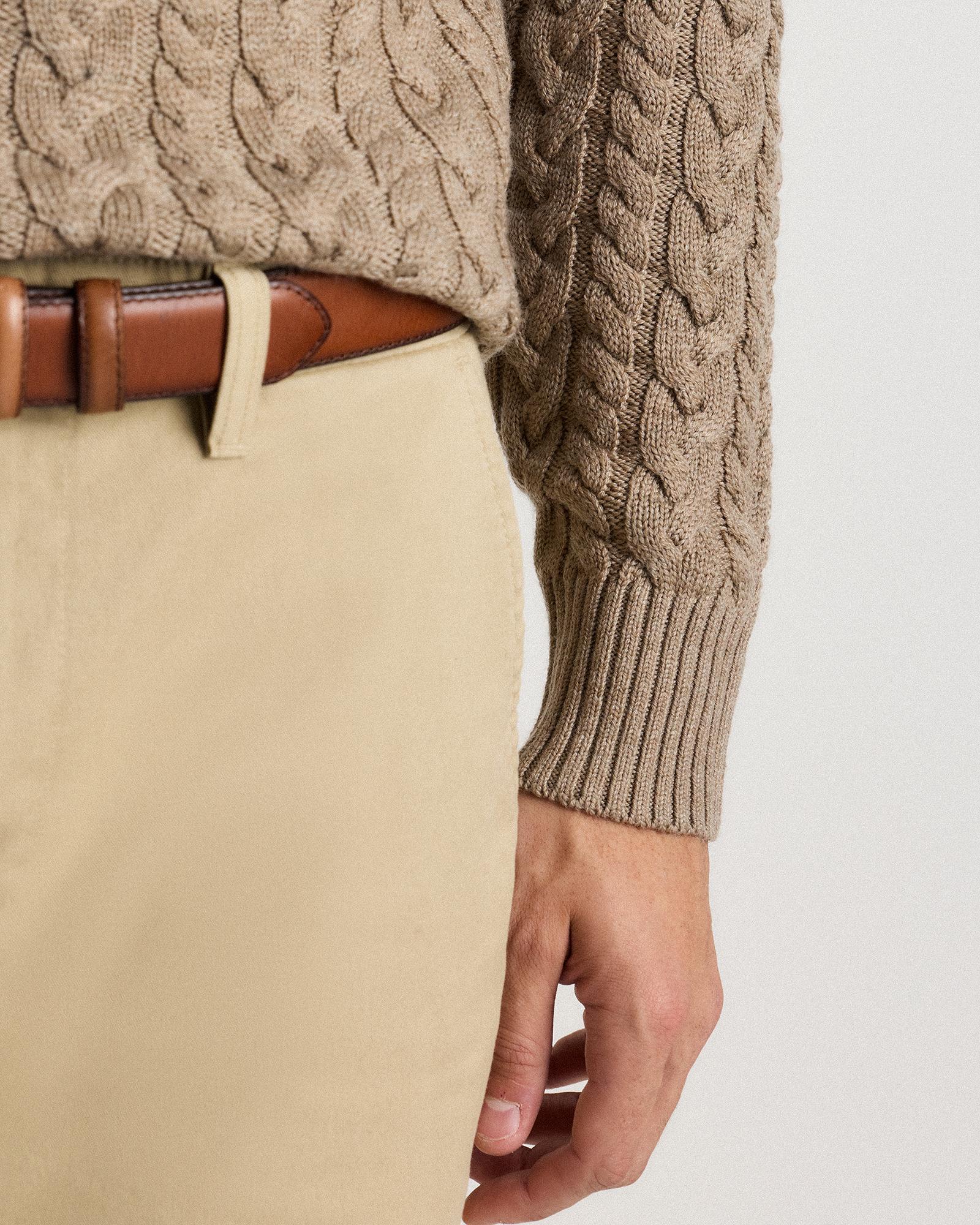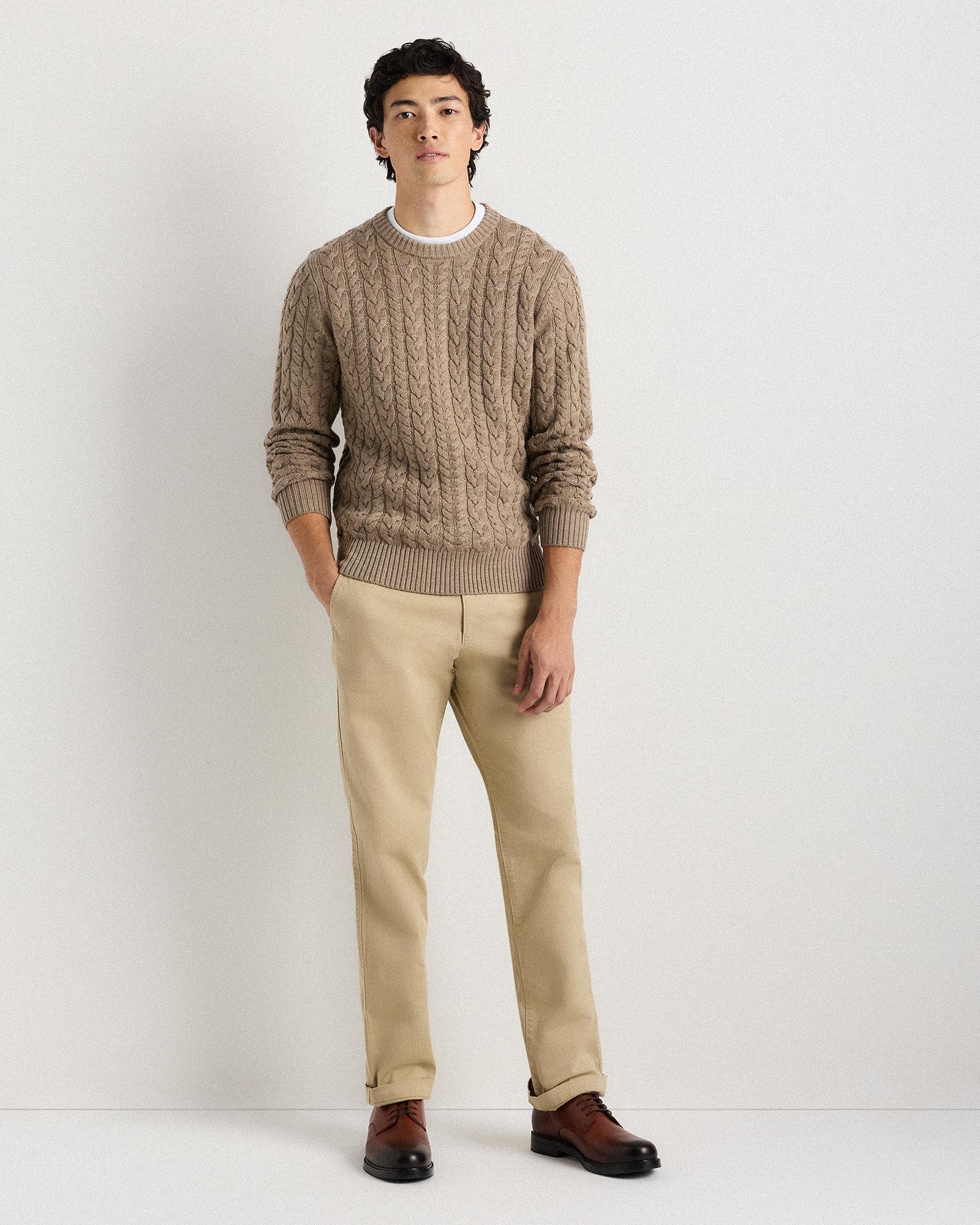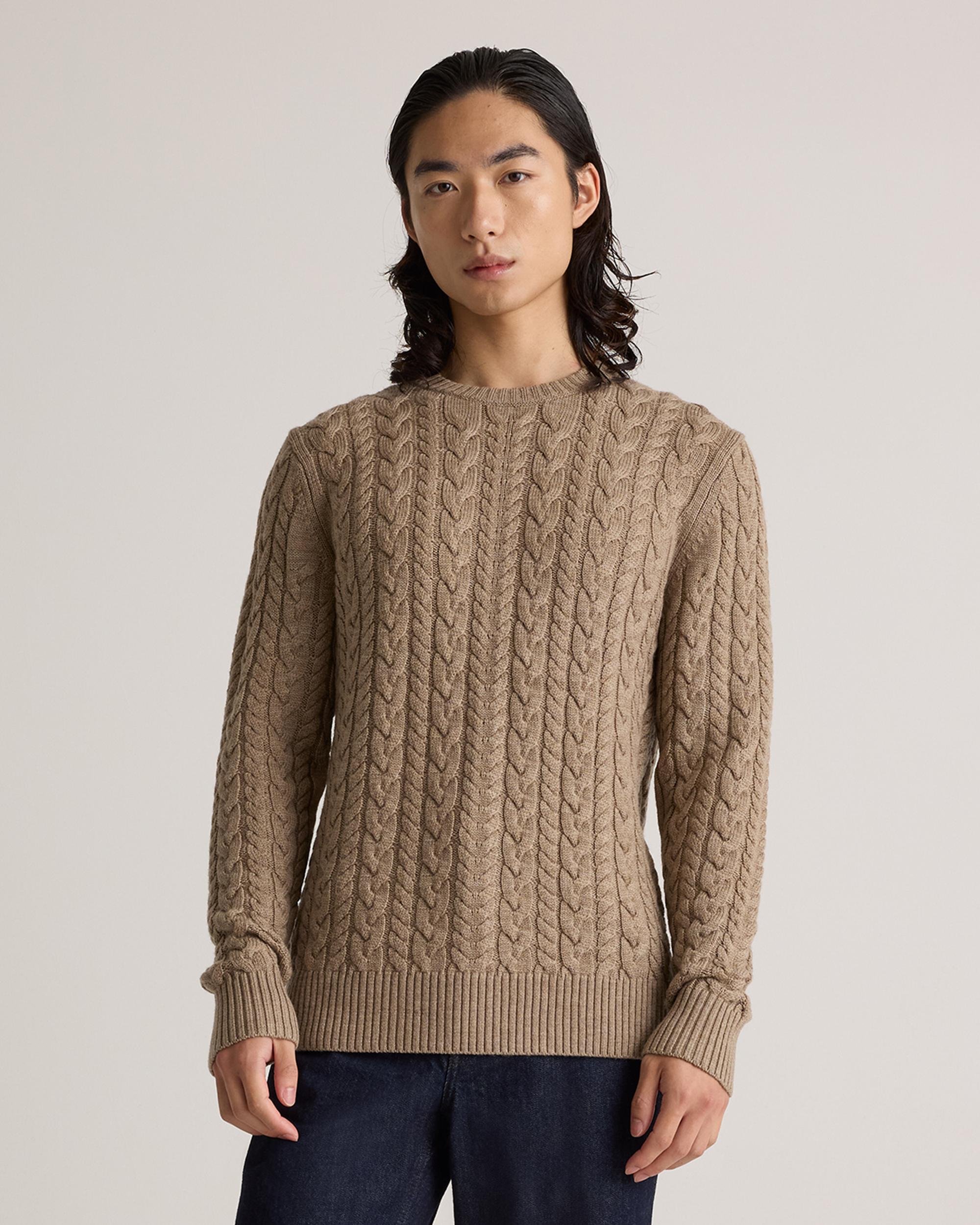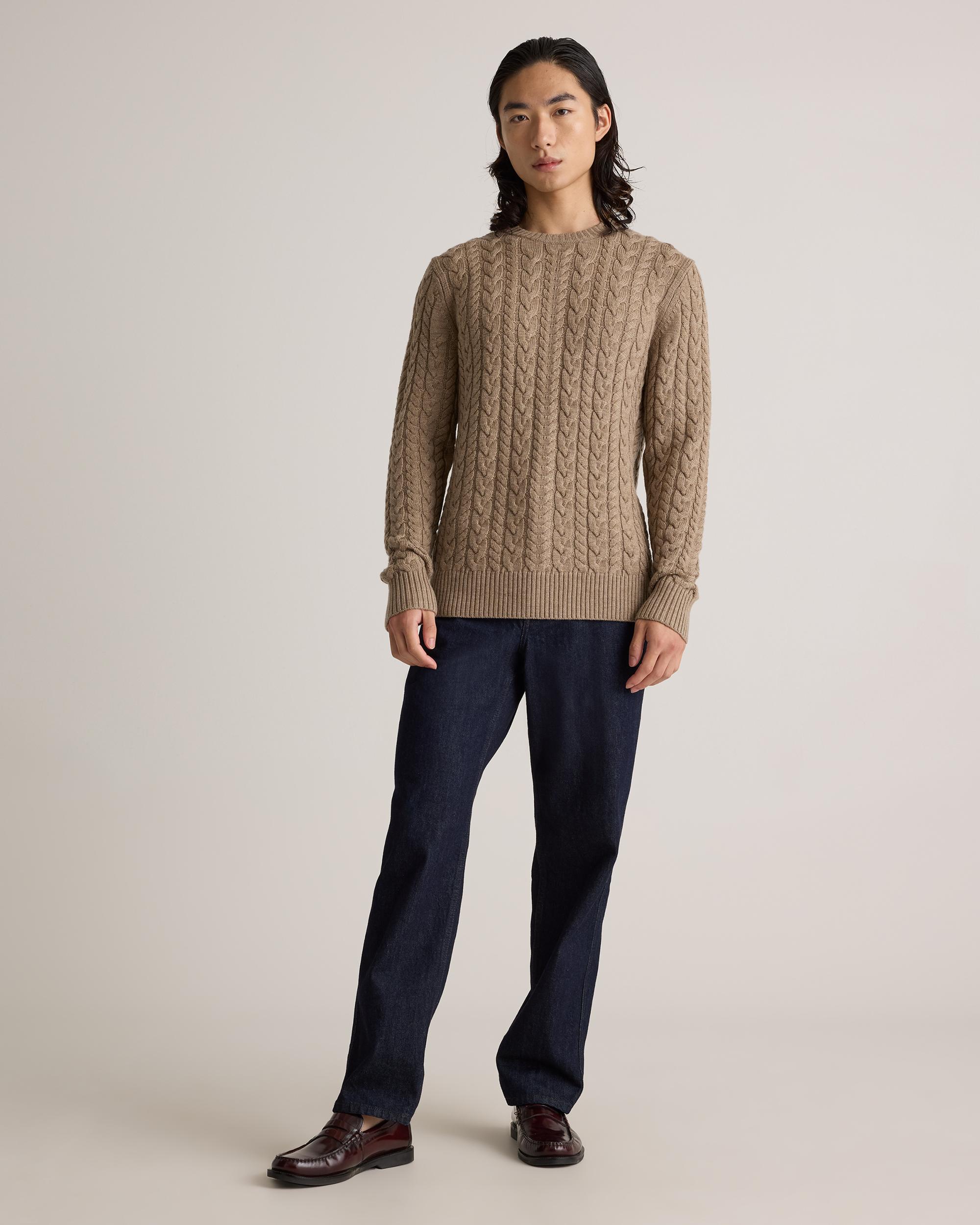 Our Australian Merino Wool Cable Crewneck Sweater is your go-to classic style with an intricate cable-knit design that adds rich texture. Designed to be both stylish and functional, this sweater is perfect for layering over a collared shirt for a polished look or wearing on its own for a more relaxed, yet sophisticated outfit. The natural properties of Merino wool make it highly breathable and temperature-regulating, so you'll stay comfortable whether you're indoors or braving the chill. | Quince | Men's Australian Merino Wool Cable Crewneck Sweater in Malted Toffee, Size Medium