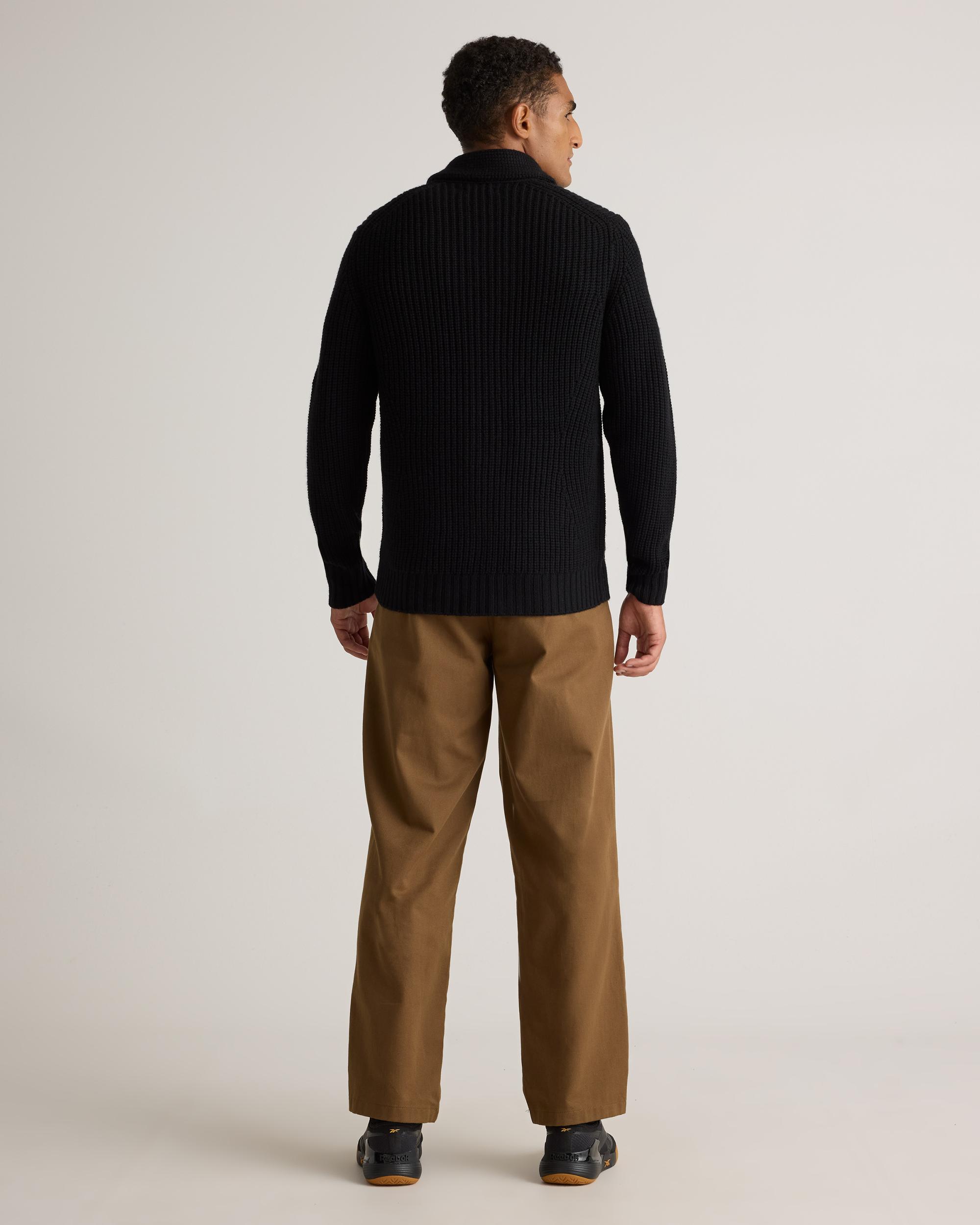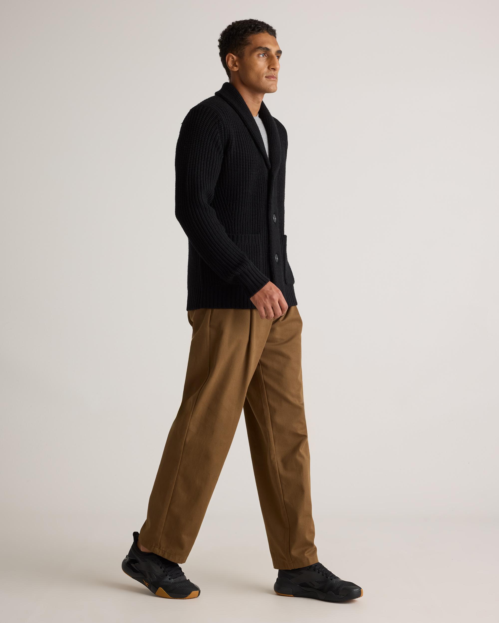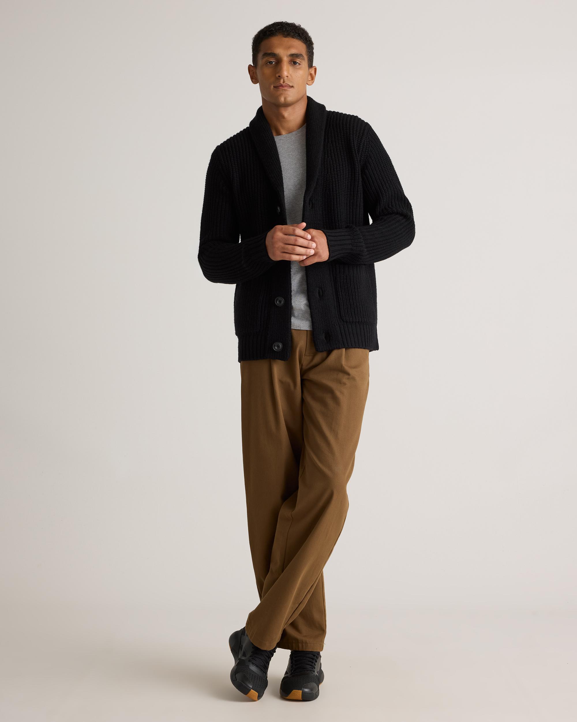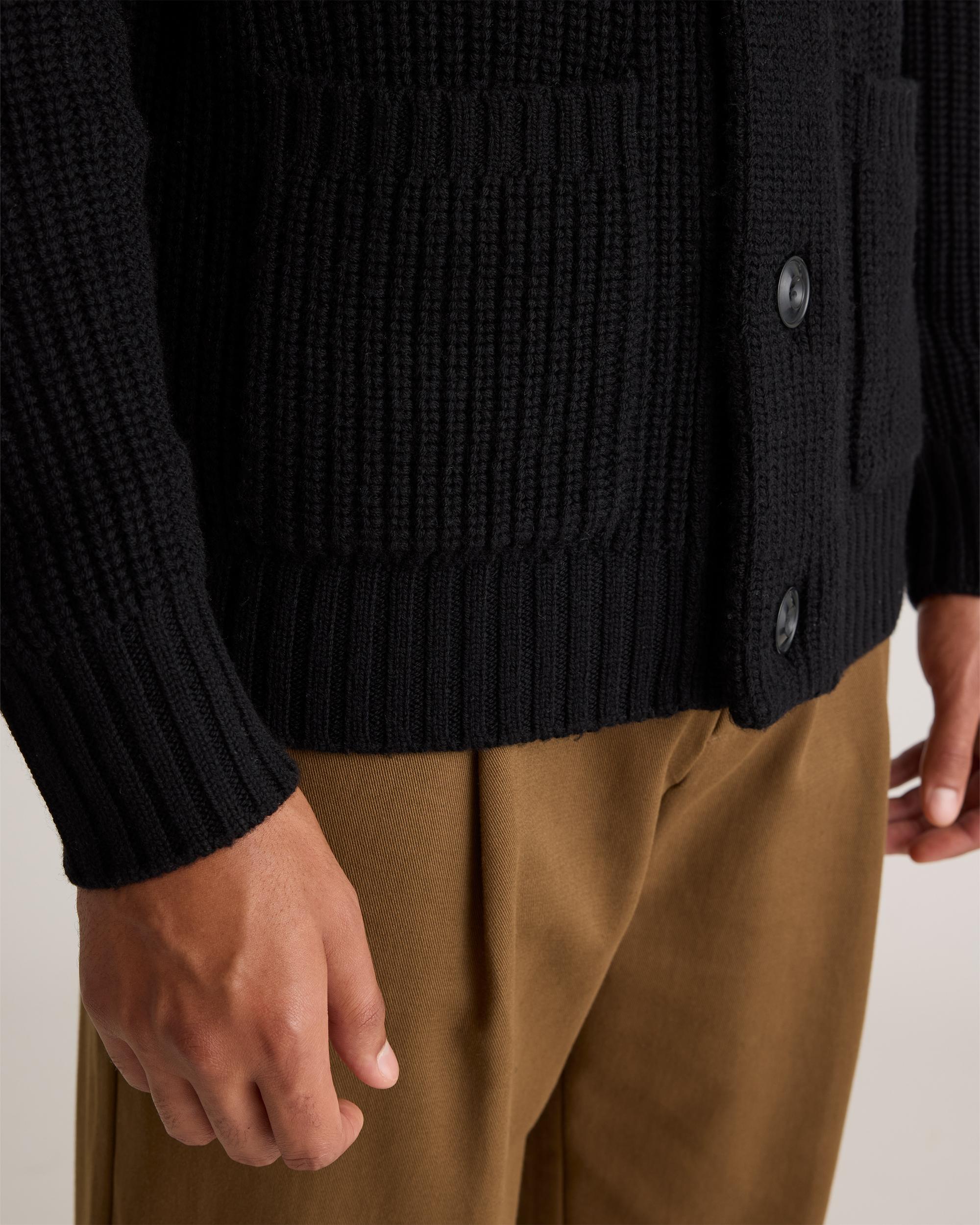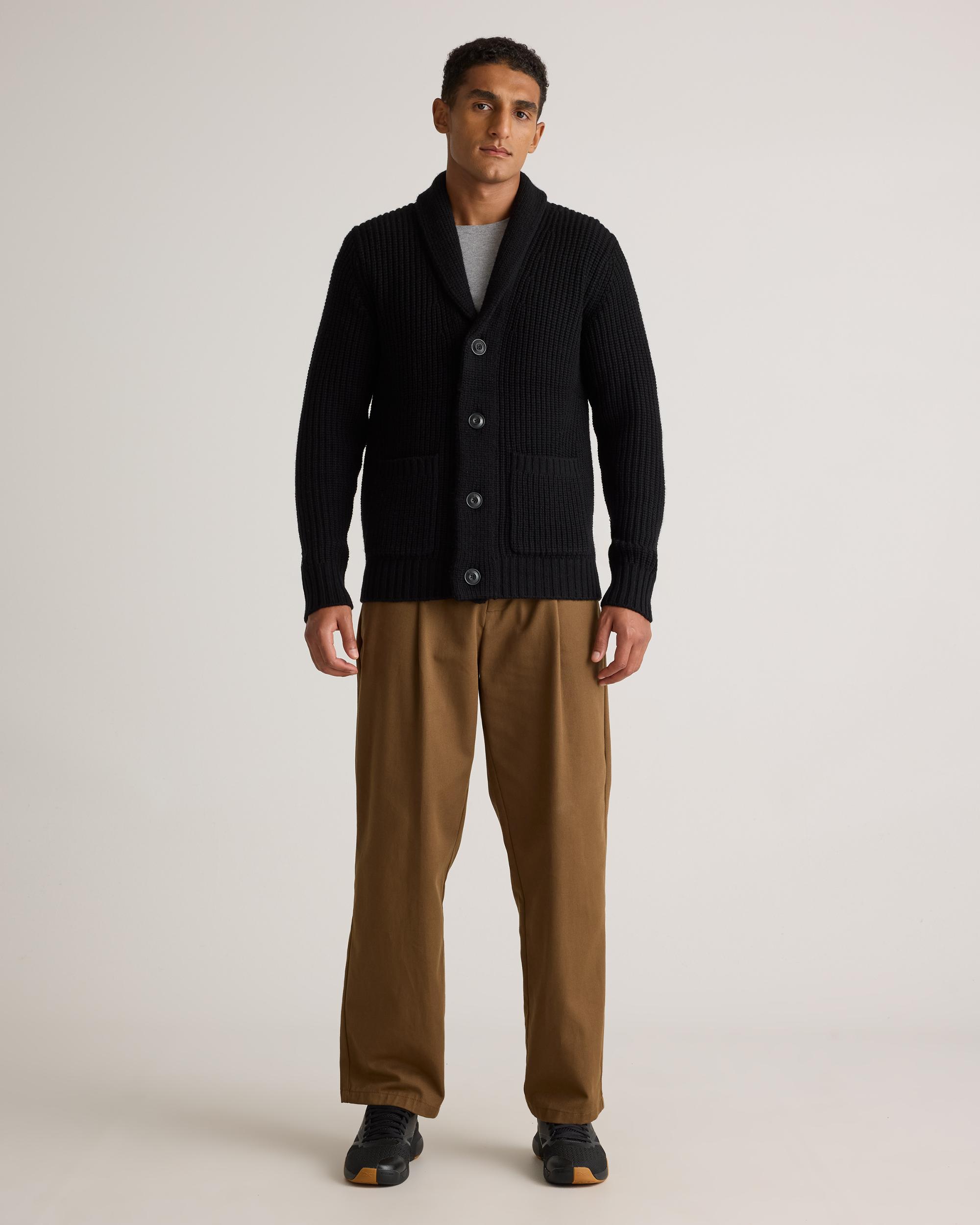 Expertly crafted from 100% Australian Merino wool, this Shawl Collar Cardigan offers an indulgently soft touch while effortlessly maintaining the perfect balance of warmth and breathability. The statement shawl collar exudes quiet confidence, framing your look with a polished, contemporary flair. Finished with ribbed cuffs and a sleek button-front closure, it’s designed for the man who appreciates understated luxury. Whether layered over a crisp shirt for an evening out or worn casually on a weekend escape, this cardigan adds a touch of effortless refinement to any occasion. | Quince | Men's Australian Merino Wool Shawl Collar Cardigan Sweater in Black, Size Medium