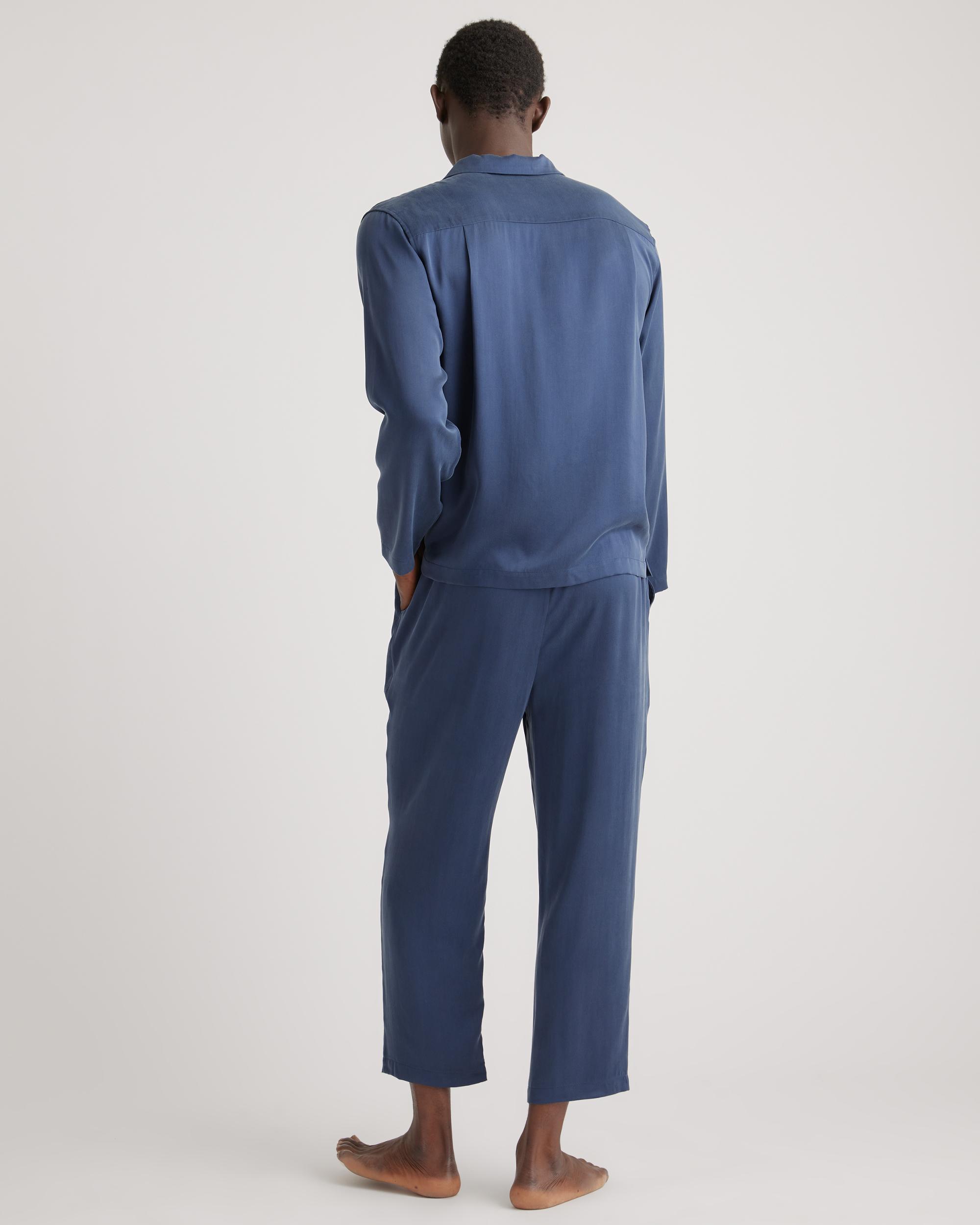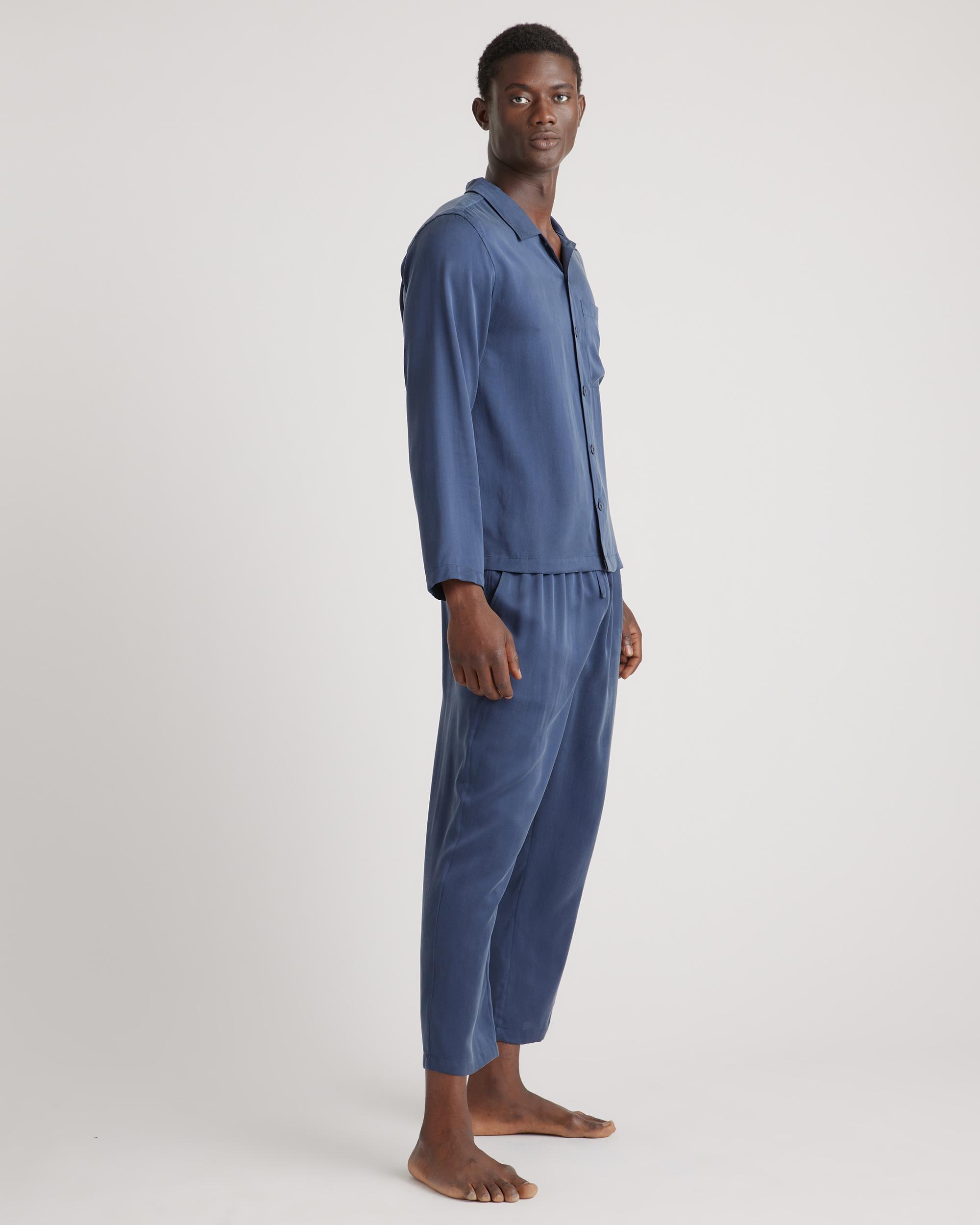 Step into the world of laid-back luxury with our 100% Washable Silk Button Down Pant Set, where comfort meets cool. And although this sleep set certainly looks and feels like an extravagant splurge, it’s completely washable and naturally thermoregulating, making this set decidedly lowkey. Meet your new favorite sleep set for years to come. | Quince | Men's Button Down Pants Set in Indigo, Size Small, Silk