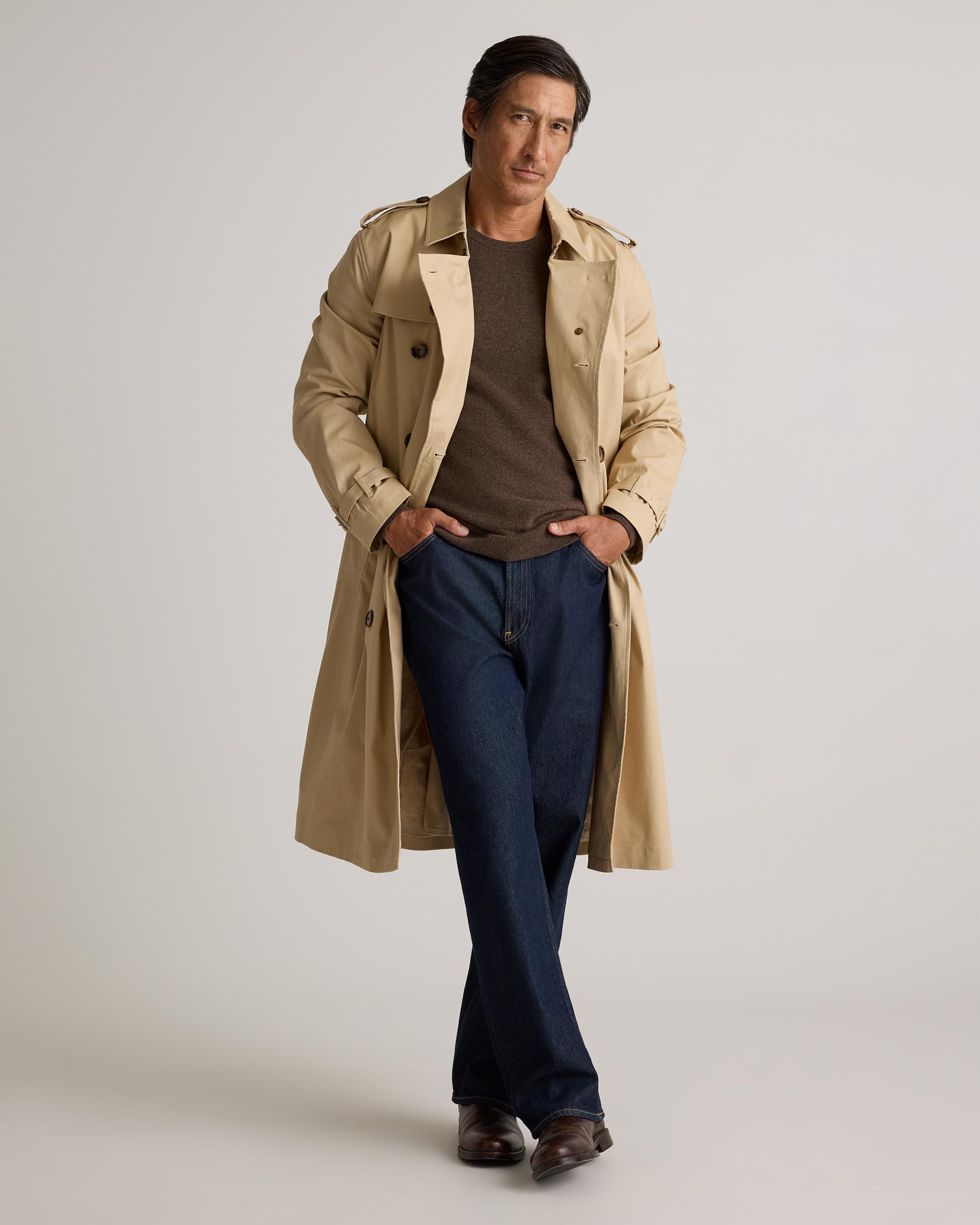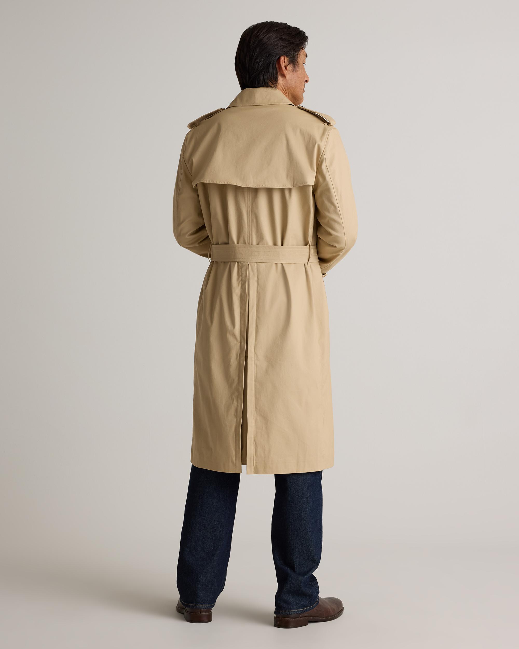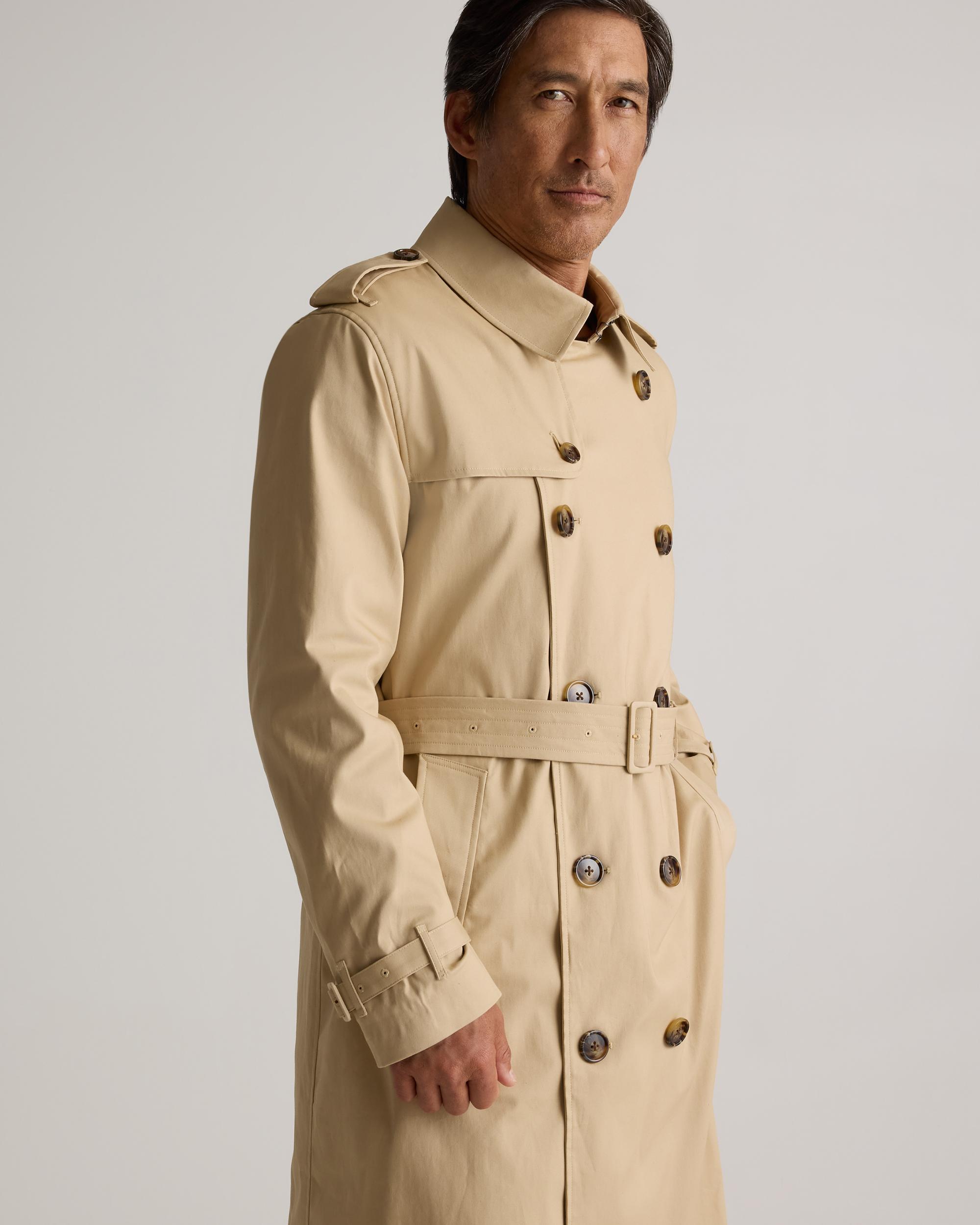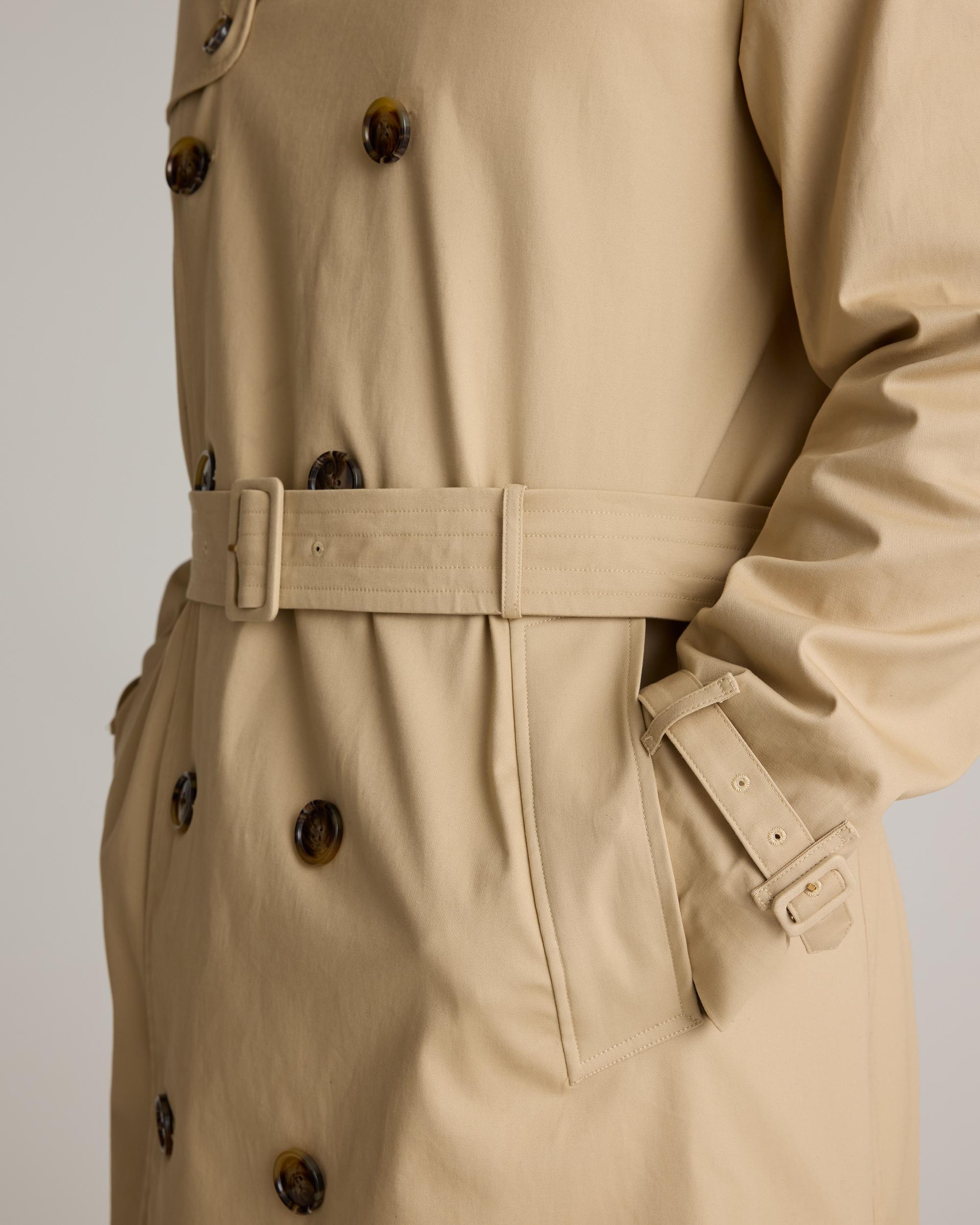 Perfect for those unpredictable weather days, our Comfort Stretch Long Trench Coat is your new wardrobe staple. Fashion meets function with the notched lapels, adjustable self-belt, and center-back vent. Plus, the water-resistant finish and lightweight lining make it the perfect transitional layer. Light enough for mild breezes but durable enough to keep you protected when the skies turn grey. Prefer a different length? Check out our mid-length version. | Quince | Men's Comfort Stretch Long Trench Coat in Light Khaki, Size Medium, Organic Cotton