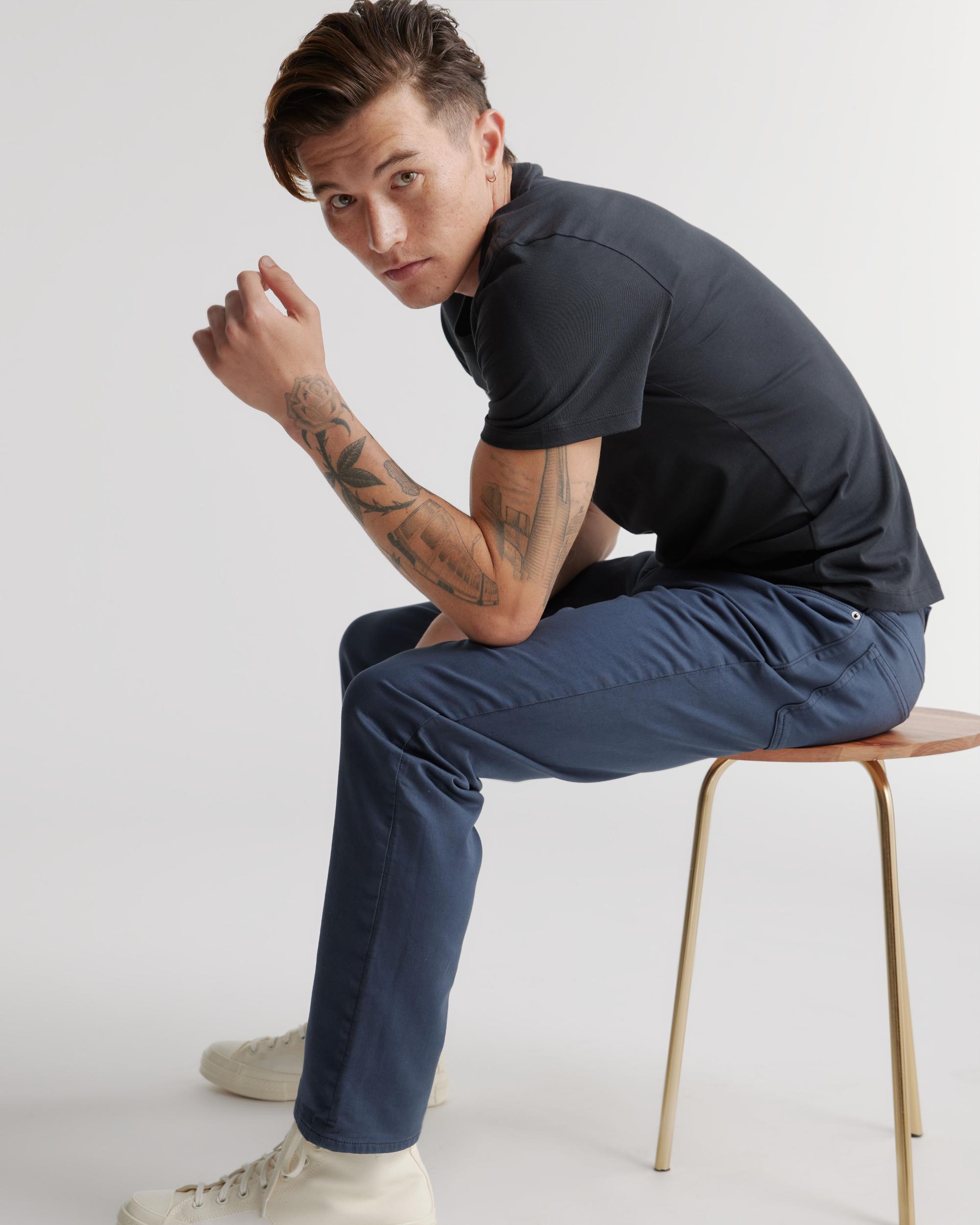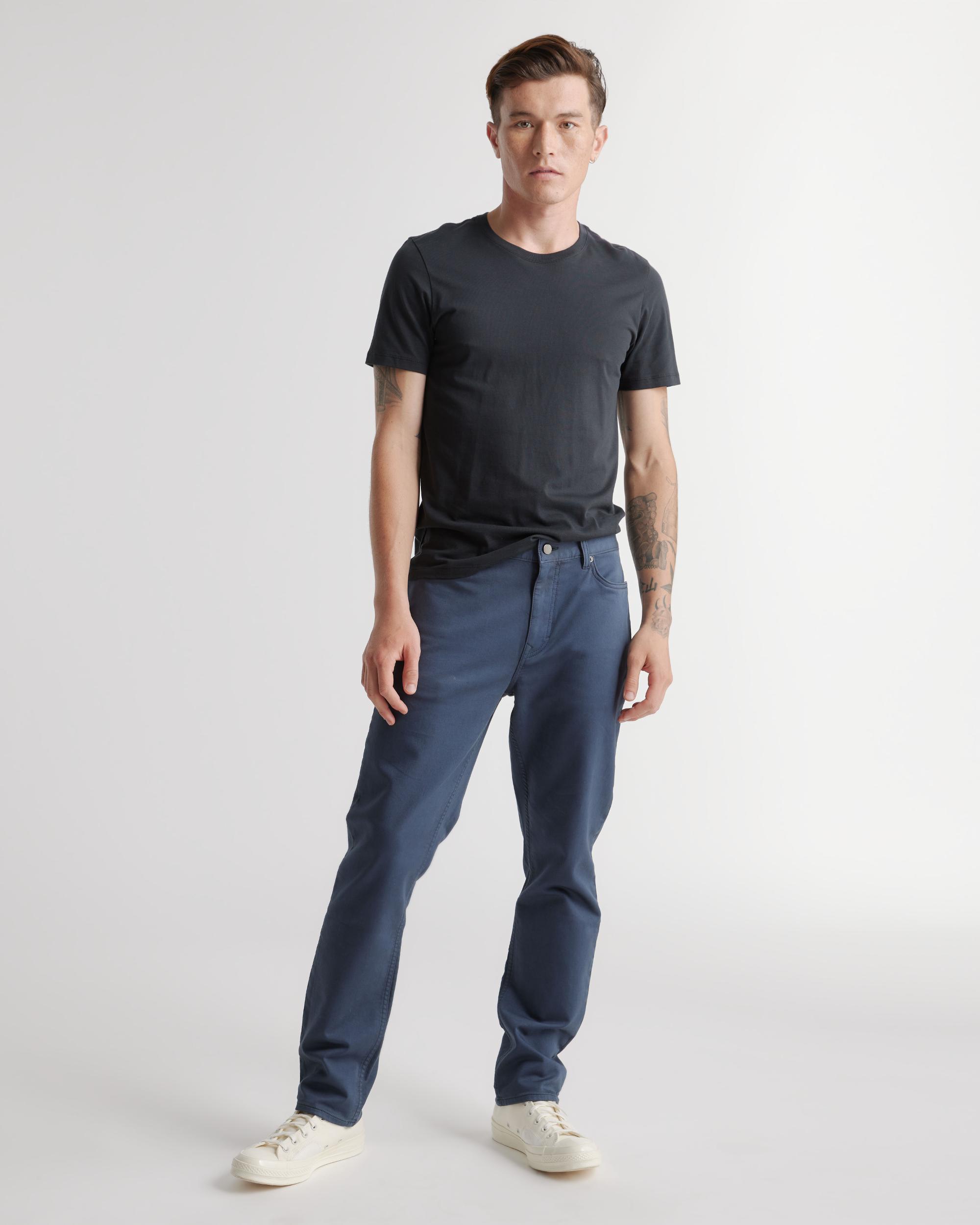 The Comfort Stretch Traveler 5-Pocket Pants is the perfect balance of laid-back and refined. The straight fit and tapered leg opening paired with just enough stretch will have you reaching for this pant every day of the week. | Quince | Men's Comfort Stretch Traveler 5-Pocket Pants in Navy, Size 34X30, Organic Cotton