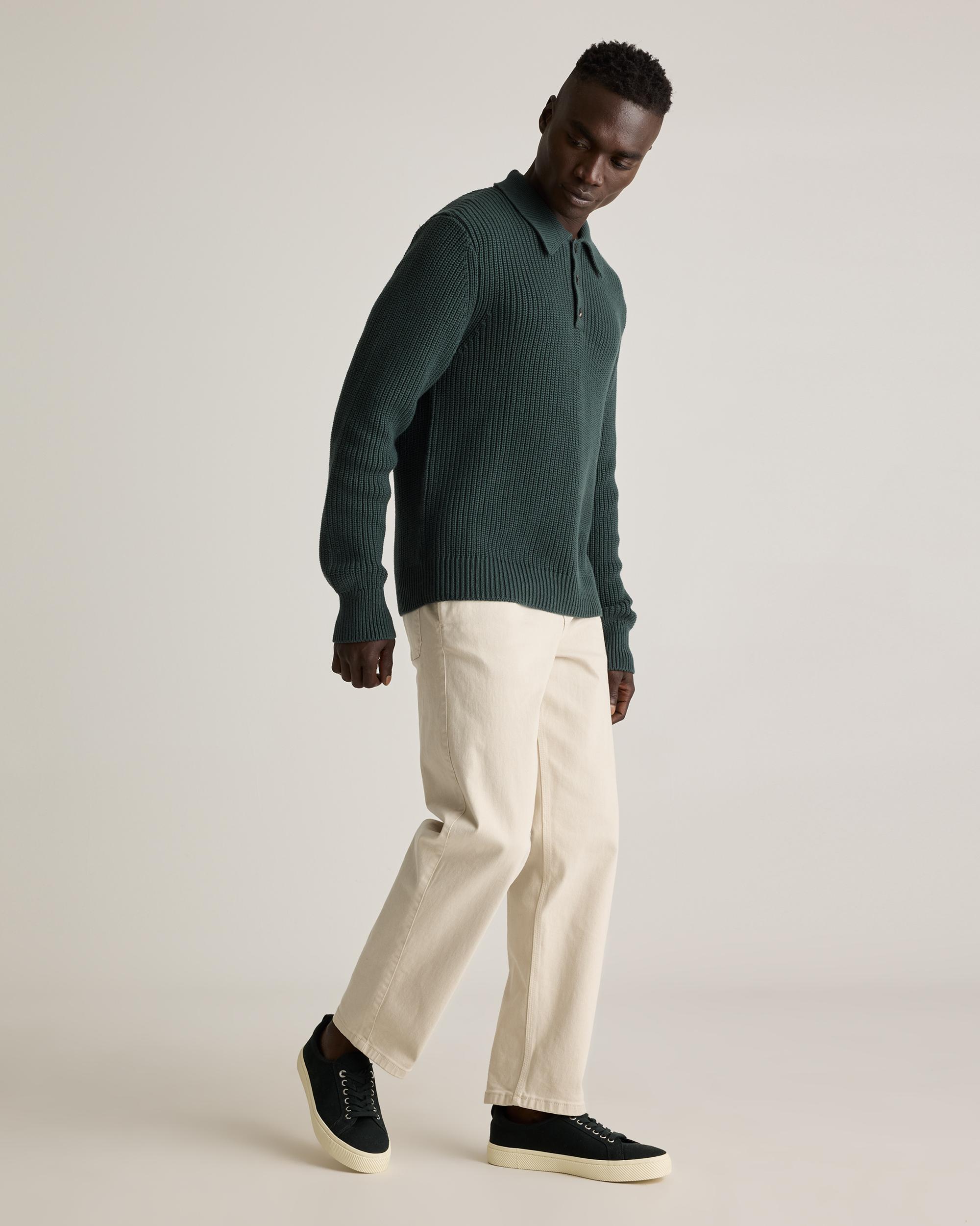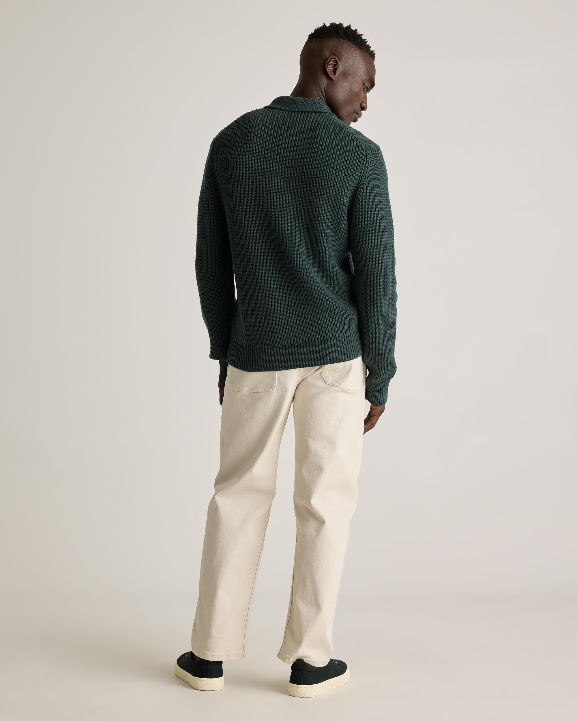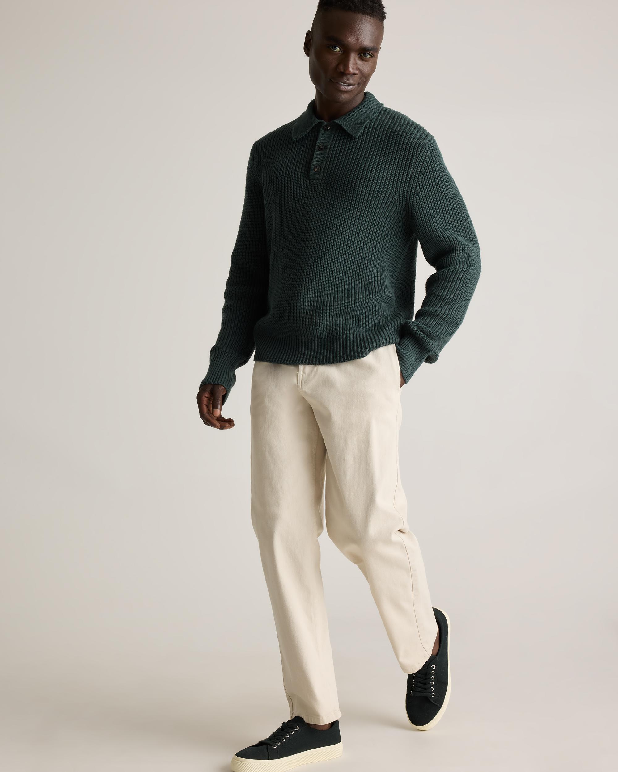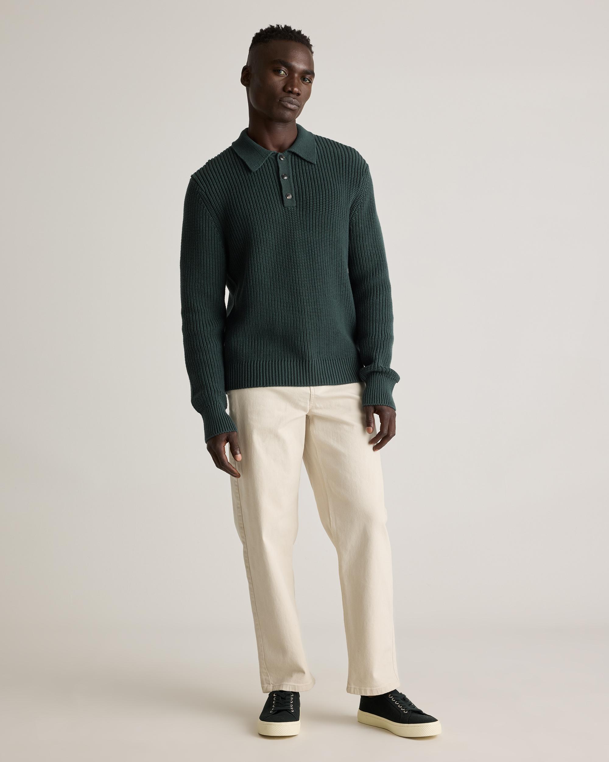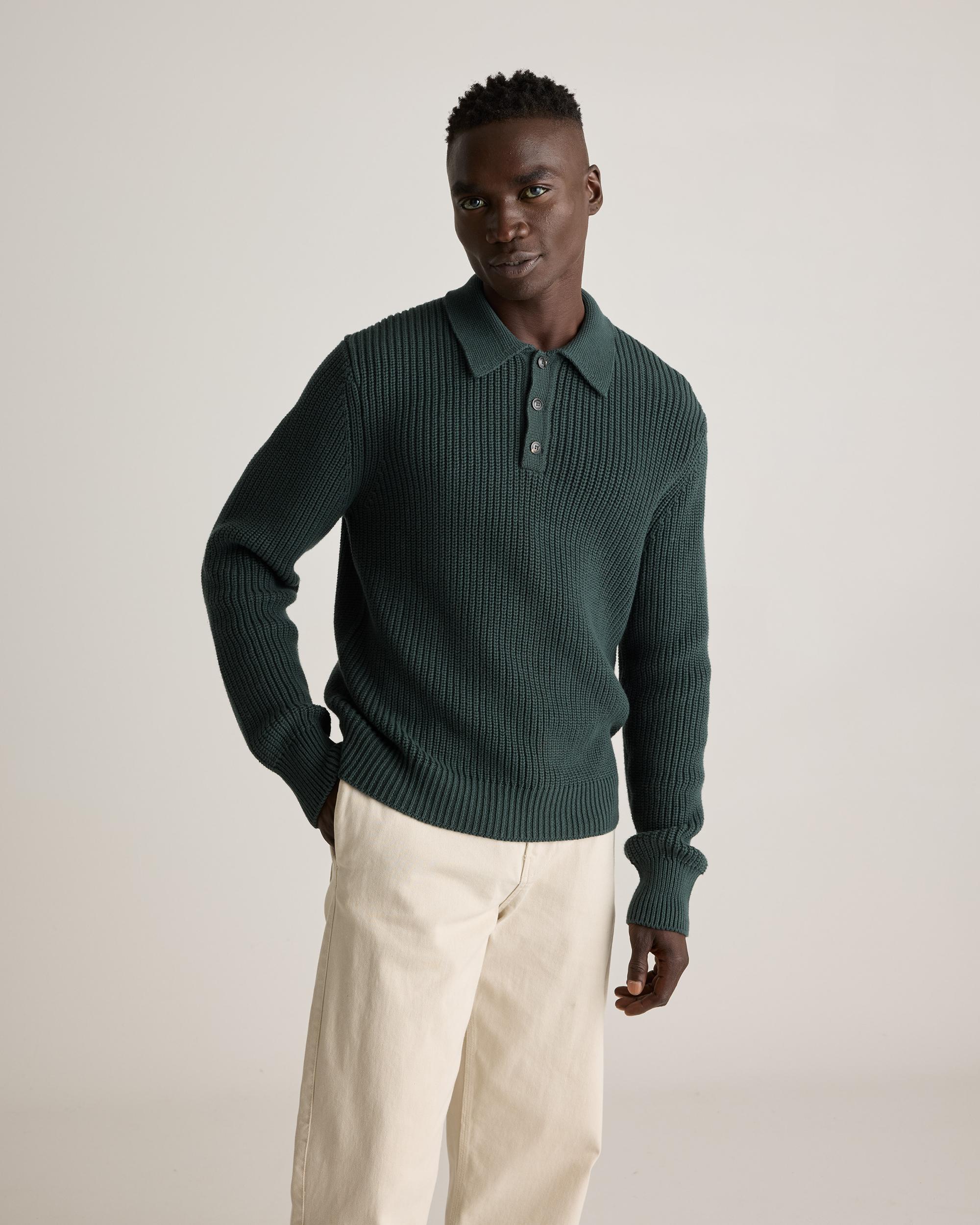 Your favorite 100% Organic Cotton Fisherman Crew Sweater now available as a polo sweater. Detailed with fisherman rib texture throughout, the sweater features a subtle collar and a three-button placket that adds a touch of polished style. Made of 100% organic cotton, it's soft on your skin and provides a cozy yet lightweight feel, perfect for layering or wearing on its own during cooler days. | Quince | Men's Fisherman Polo Sweater in Dark Spruce, Size XXL, Organic Cotton
