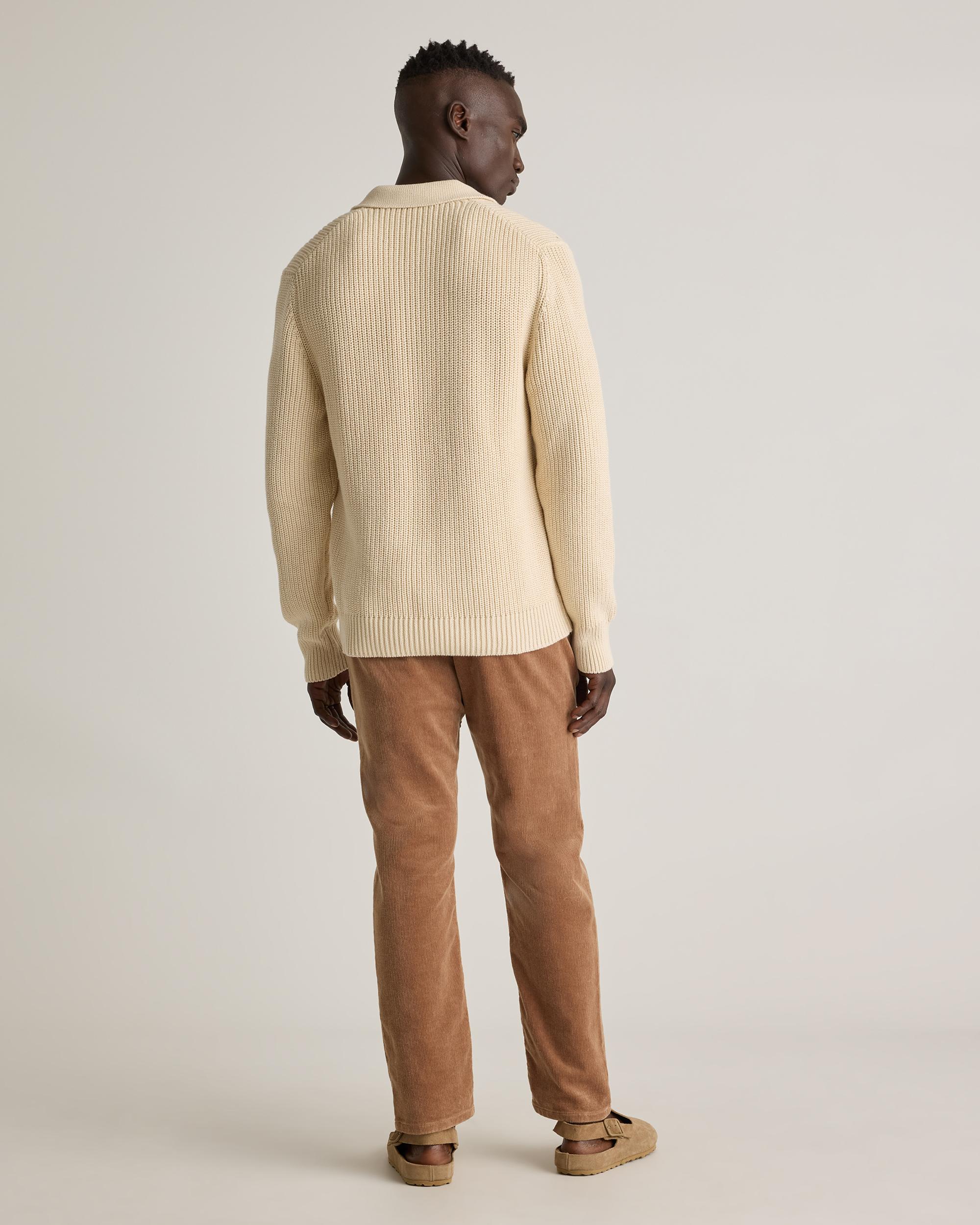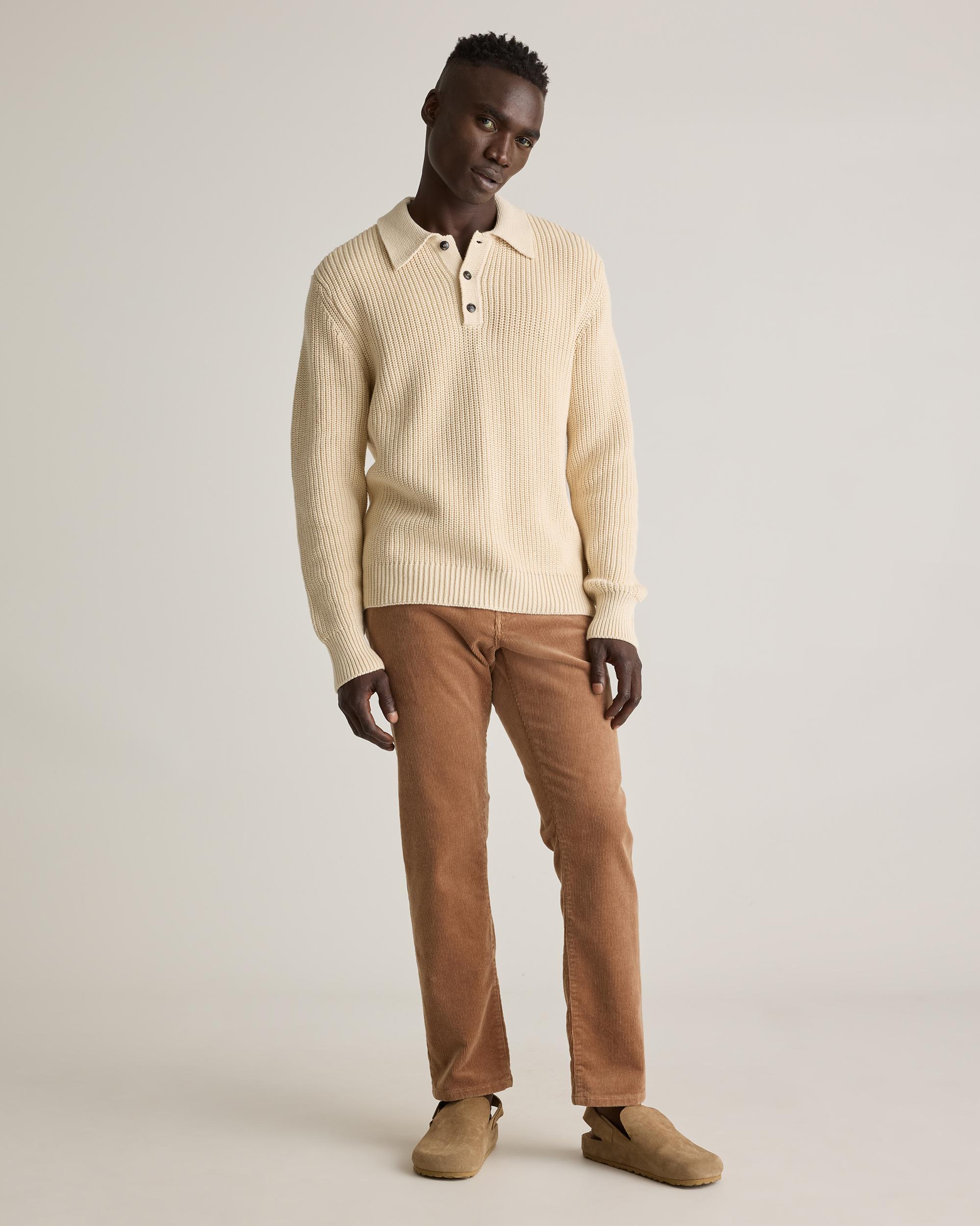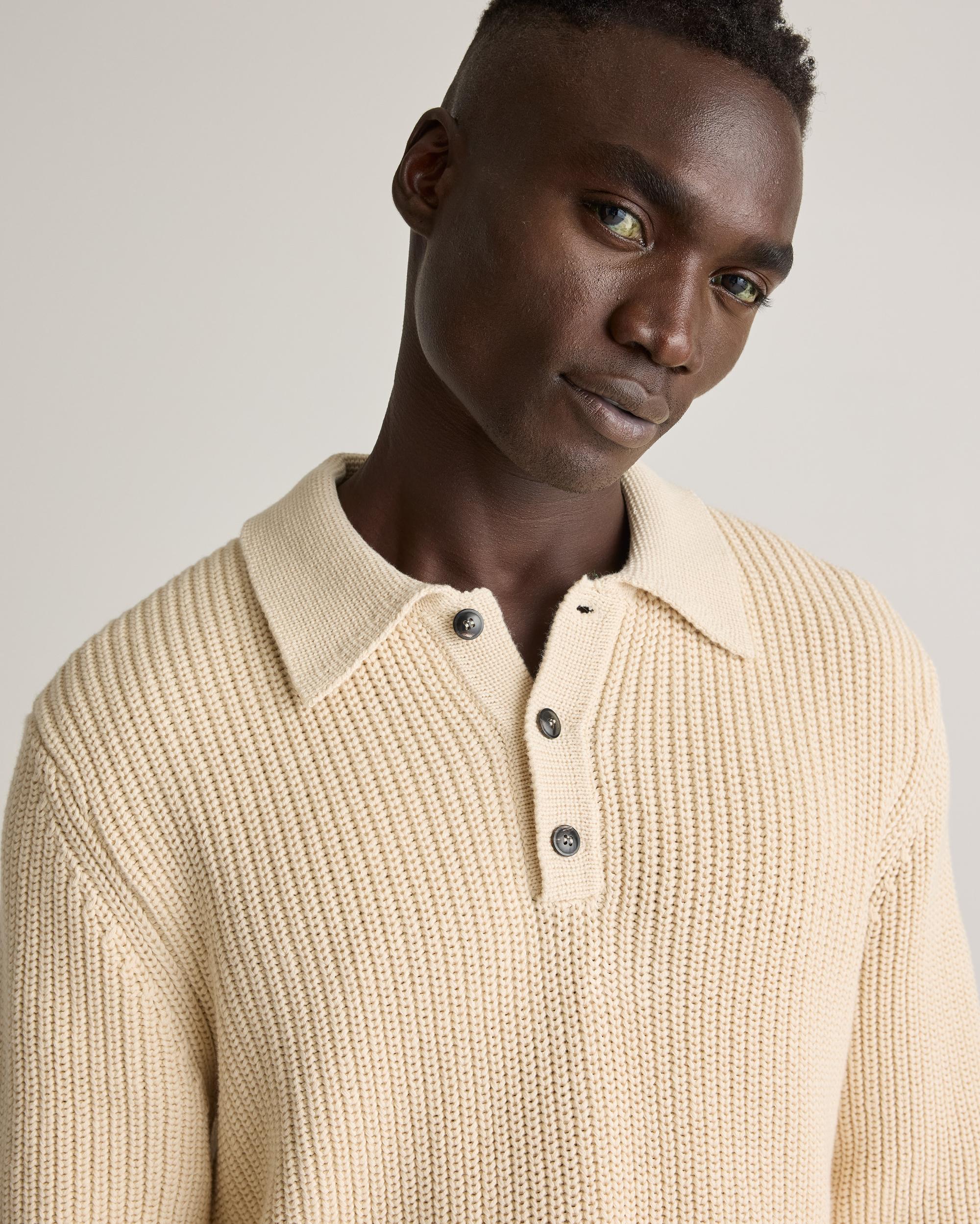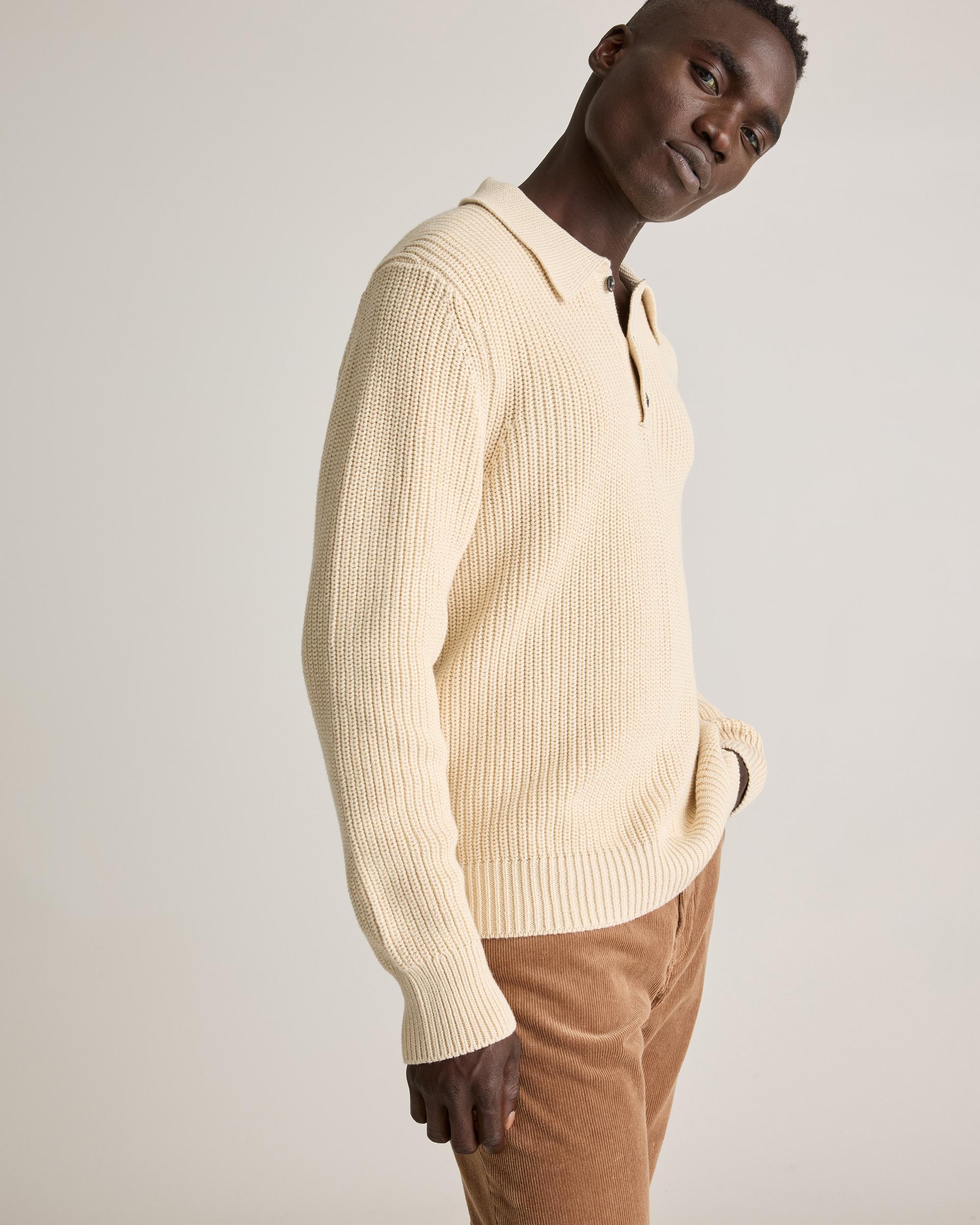 Your favorite 100% Organic Cotton Fisherman Crew Sweater now available as a polo sweater. Detailed with fisherman rib texture throughout, the sweater features a subtle collar and a three-button placket that adds a touch of polished style. Made of 100% organic cotton, it's soft on your skin and provides a cozy yet lightweight feel, perfect for layering or wearing on its own during cooler days. | Quince | Men's Fisherman Polo Sweater in Alabaster, Size Medium, Organic Cotton