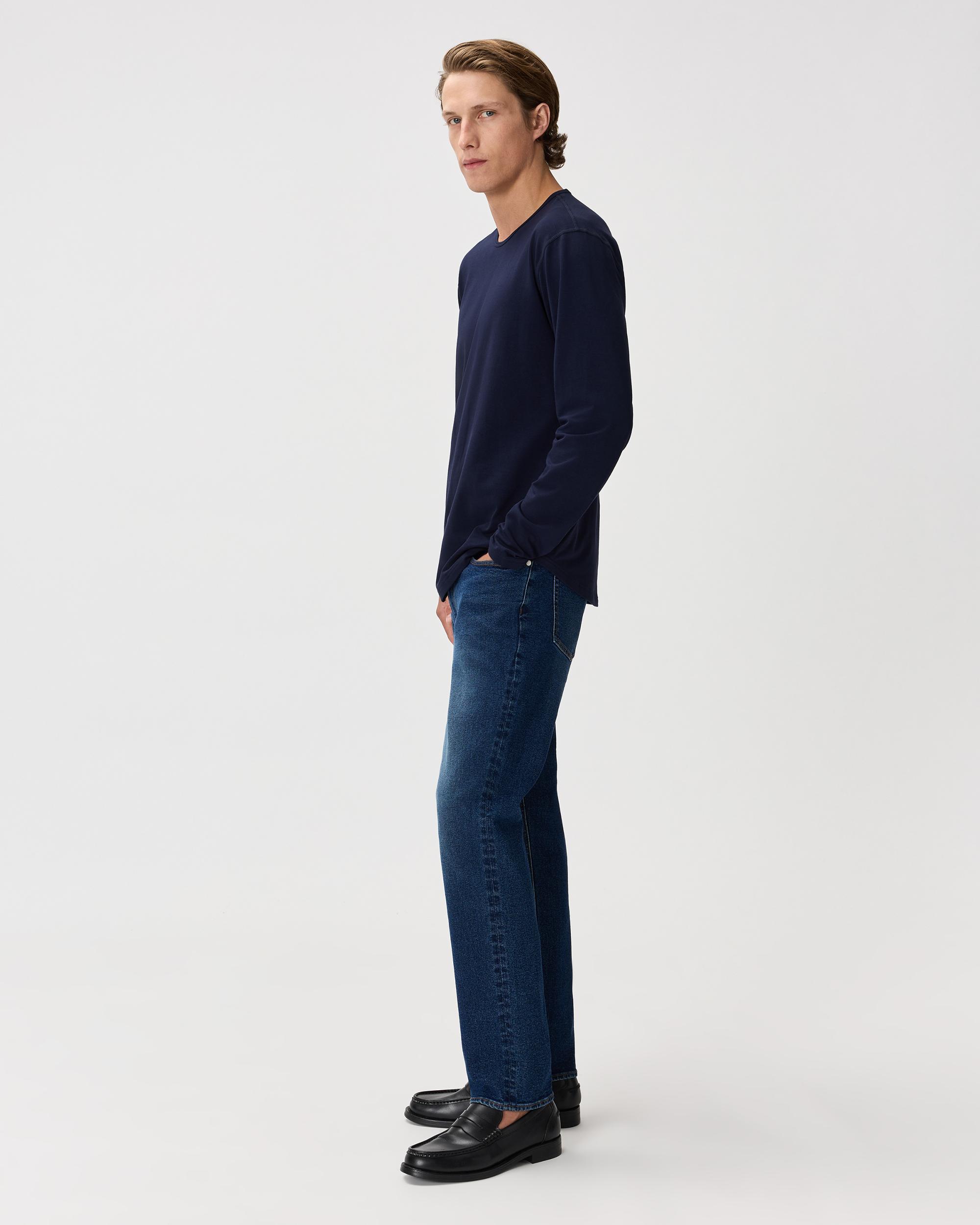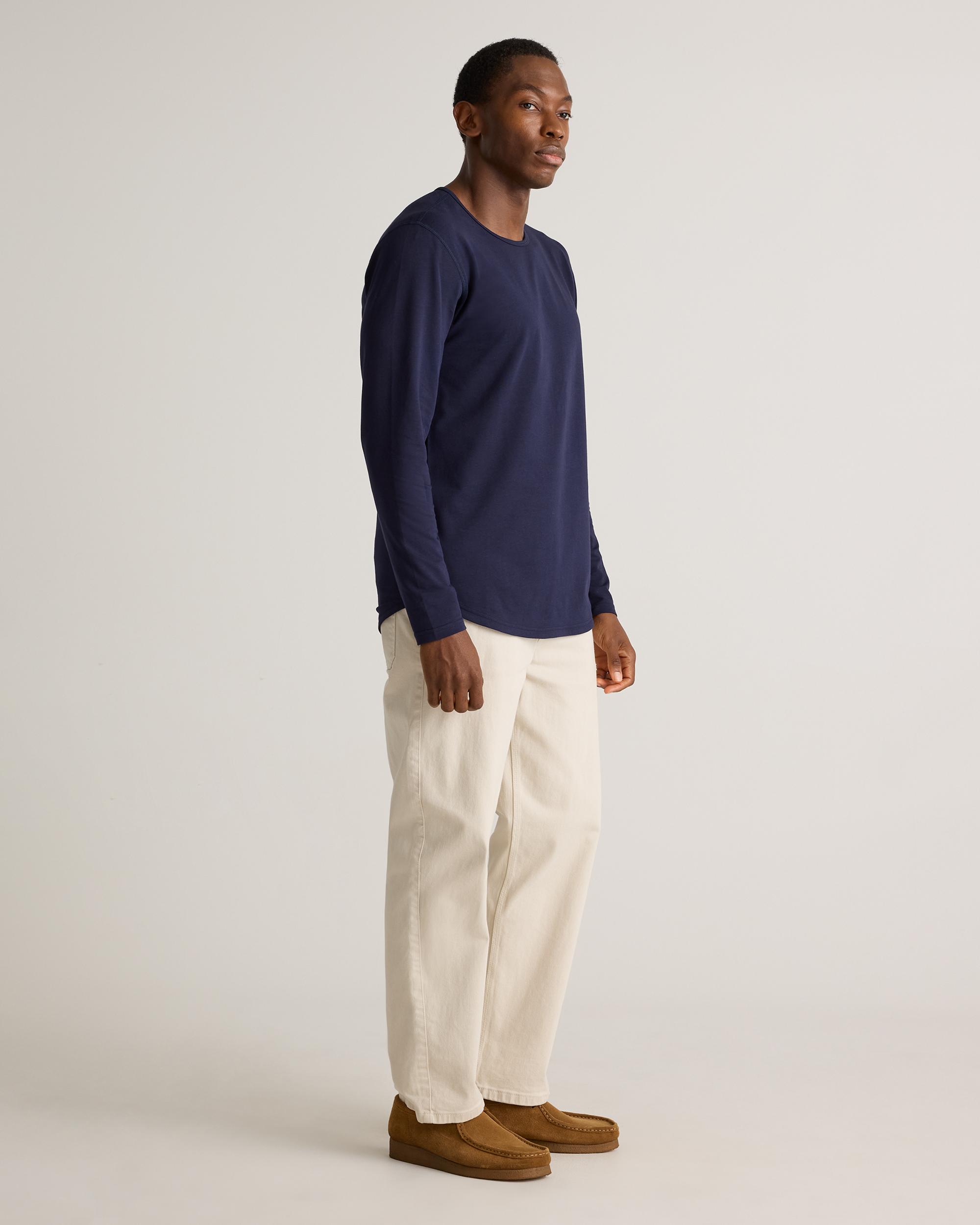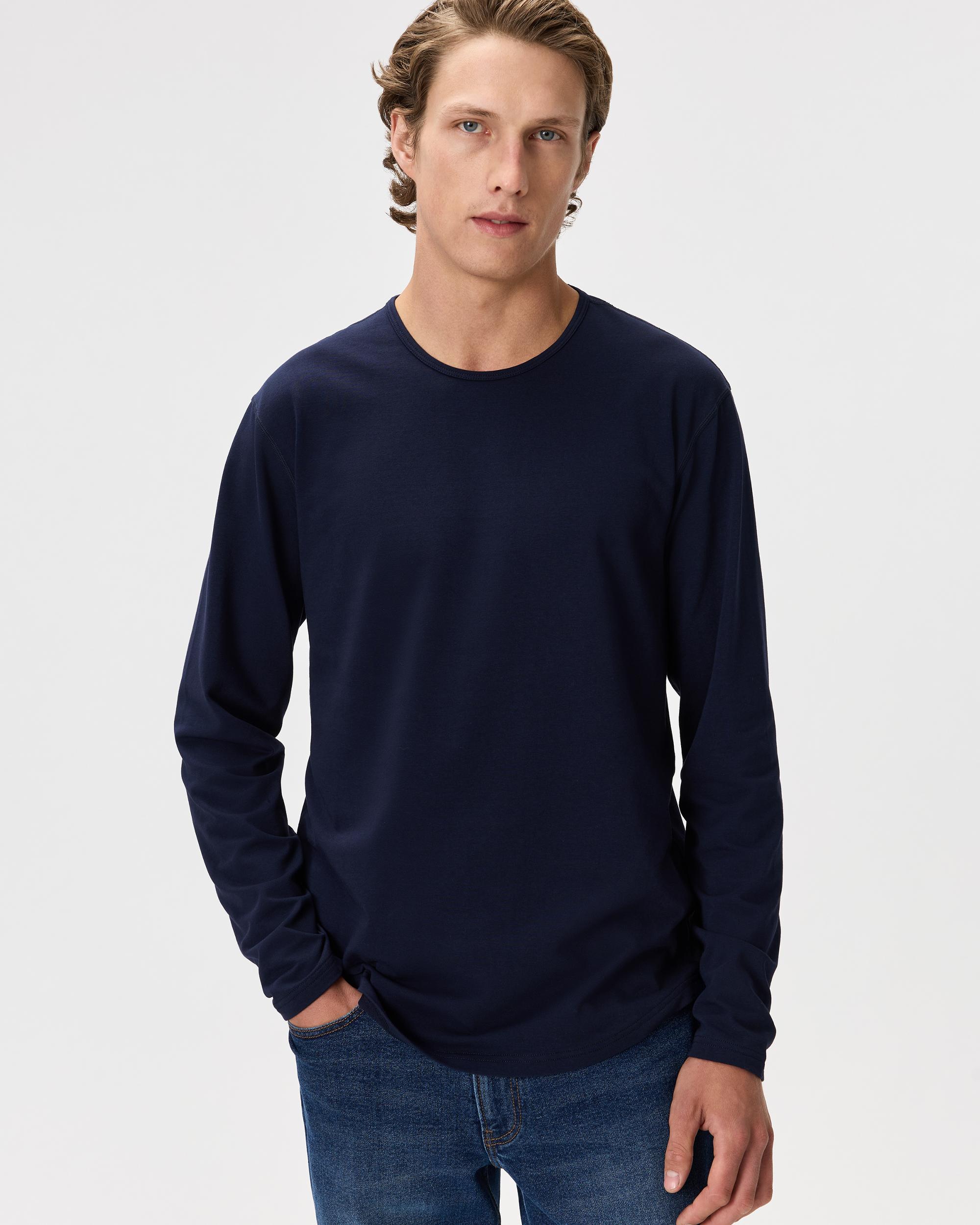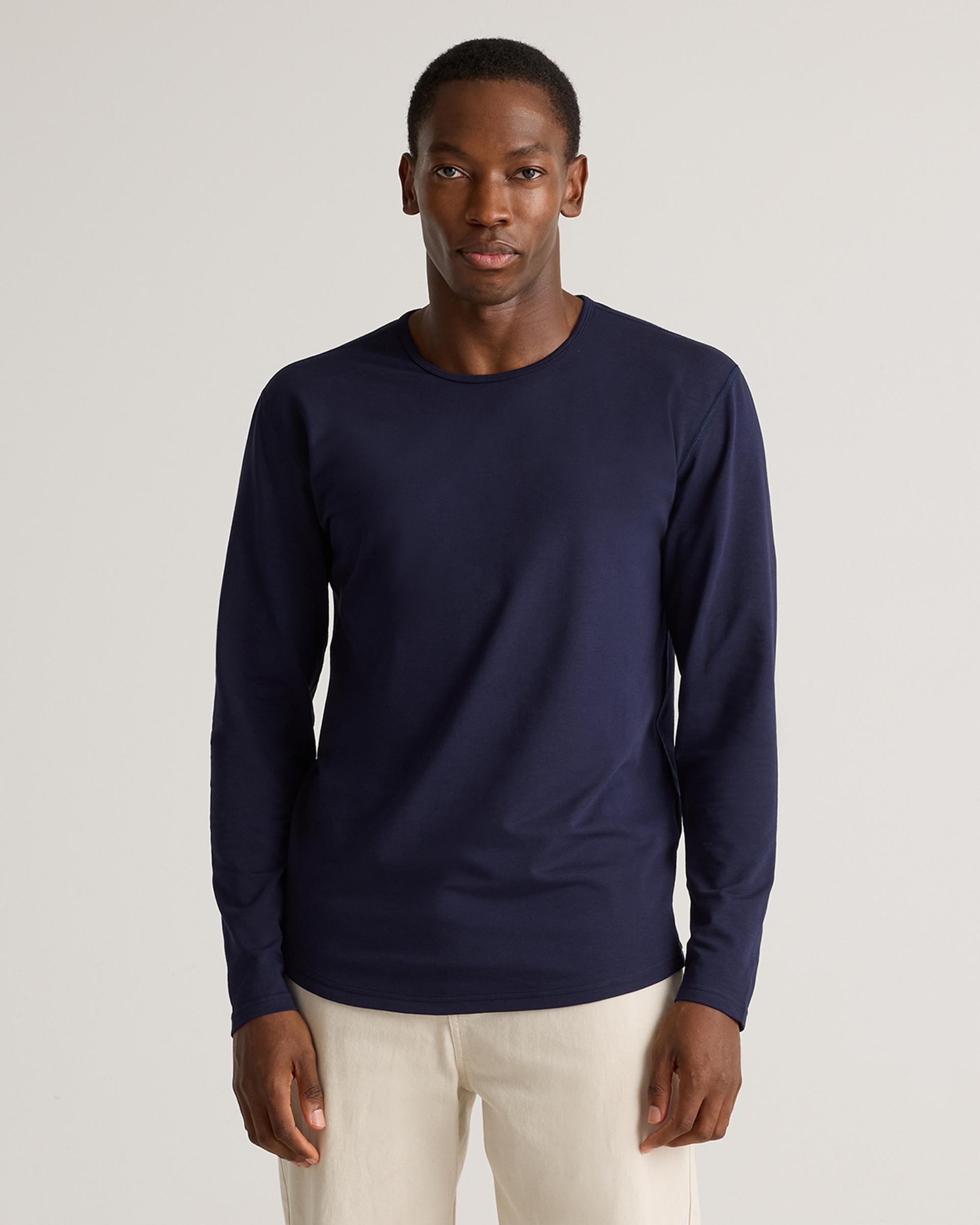 Made with a blend of high-quality sustainable materials, this tee is designed to provide maximum comfort and flexibility. Whether you're hitting the gym, running errands, or just lounging at home, this versatile tee is perfect for any occasion. The classic crewneck design and curved hemline give it a stylish edge, making it easy to pair with your favorite jeans or athletic short. Upgrade your wardrobe with our Flex Curve Long Sleeve Tee, trust us, you'll need three. | Quince | Men's Flex Curve Long Sleeve T-Shirt in Deep Navy, Size XL, Cotton