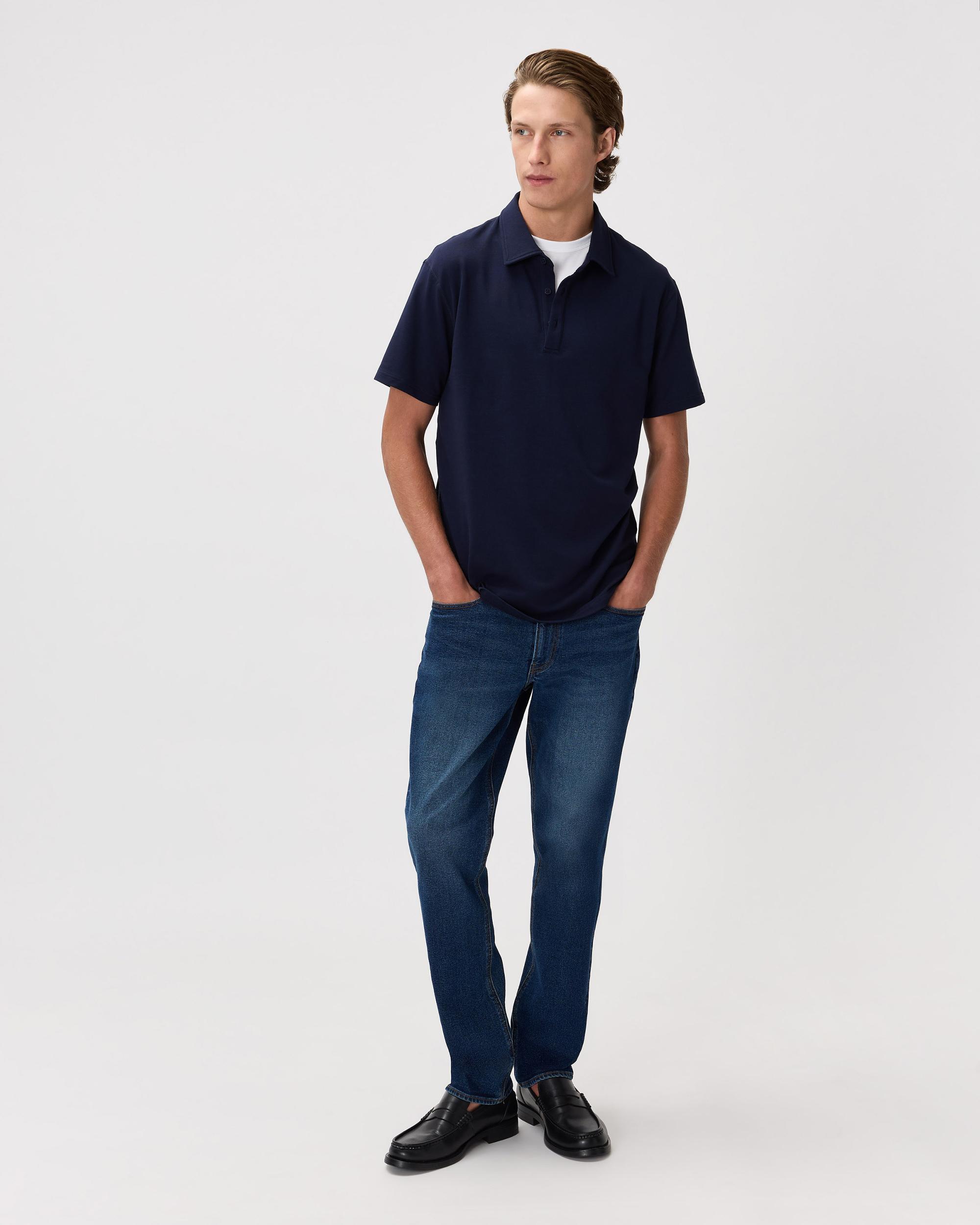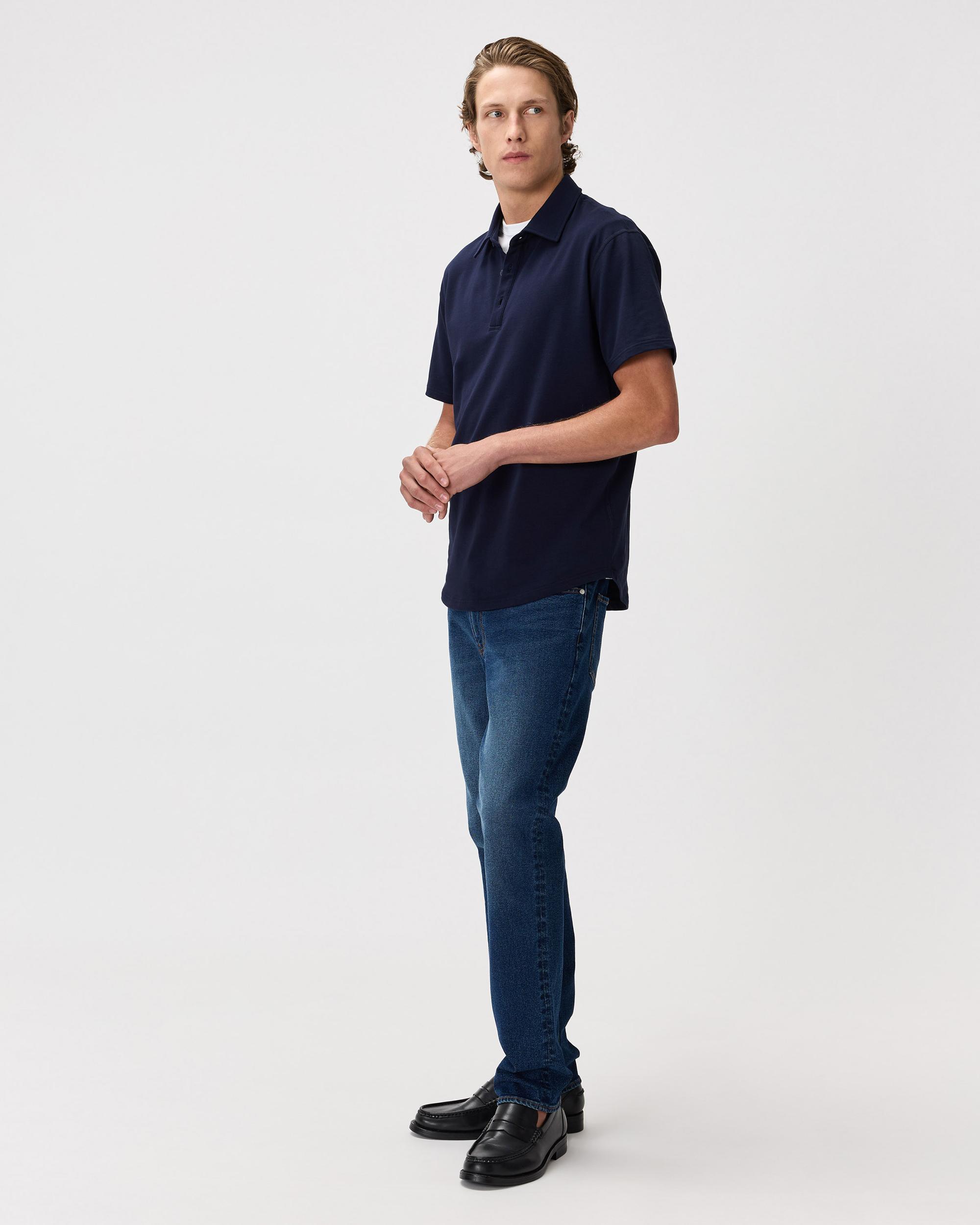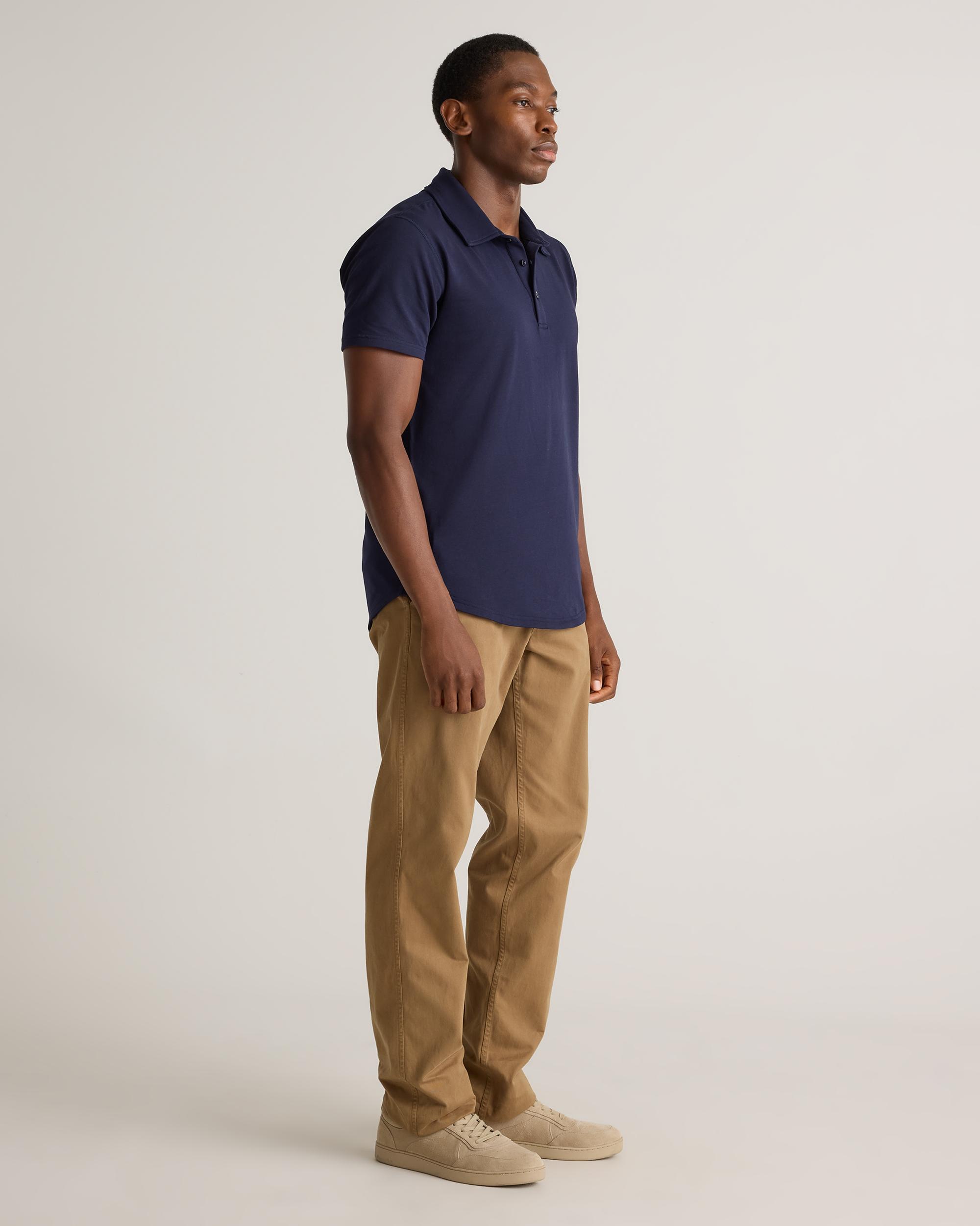 Made with a blend of high-quality sustainable materials, this polo is designed to provide maximum comfort and flexibility. Whether you're hitting the golf course, running errands, or heading to the office, this versatile polo is perfect for any occasion. The classic design is updated with a modern curved hemline give it a stylish edge, making it easy to pair with your golf or casual pant. Upgrade your wardrobe with our Flex Curve Polo, you wont be disappointed. | Quince | Men's Flex Curve Polo in Deep Navy, Size Large, Organic Cotton