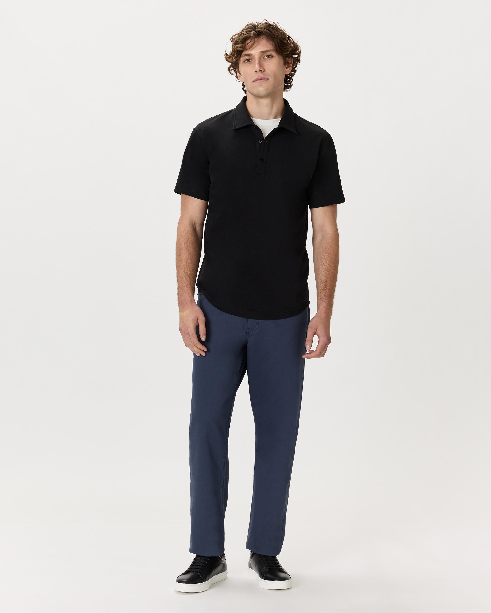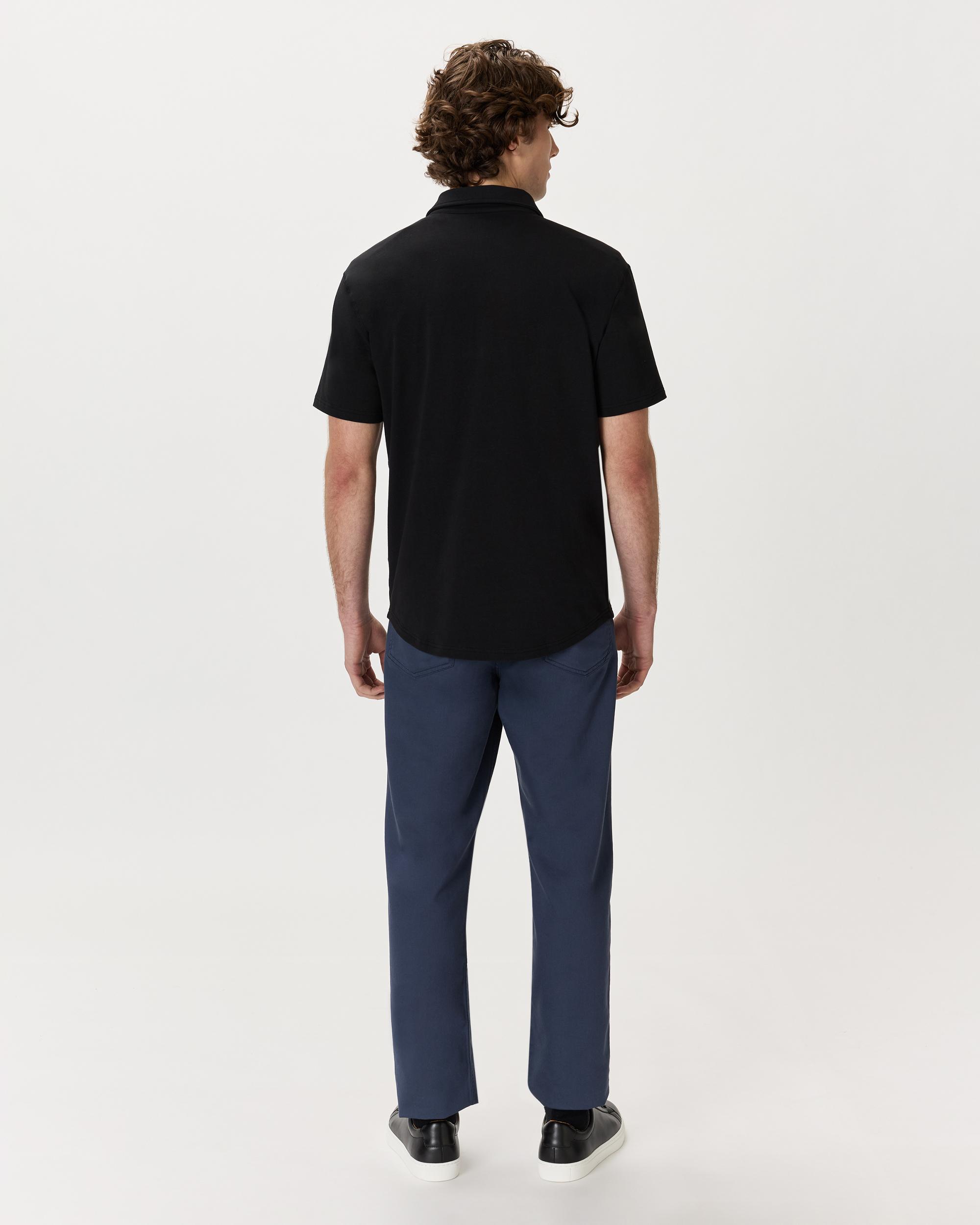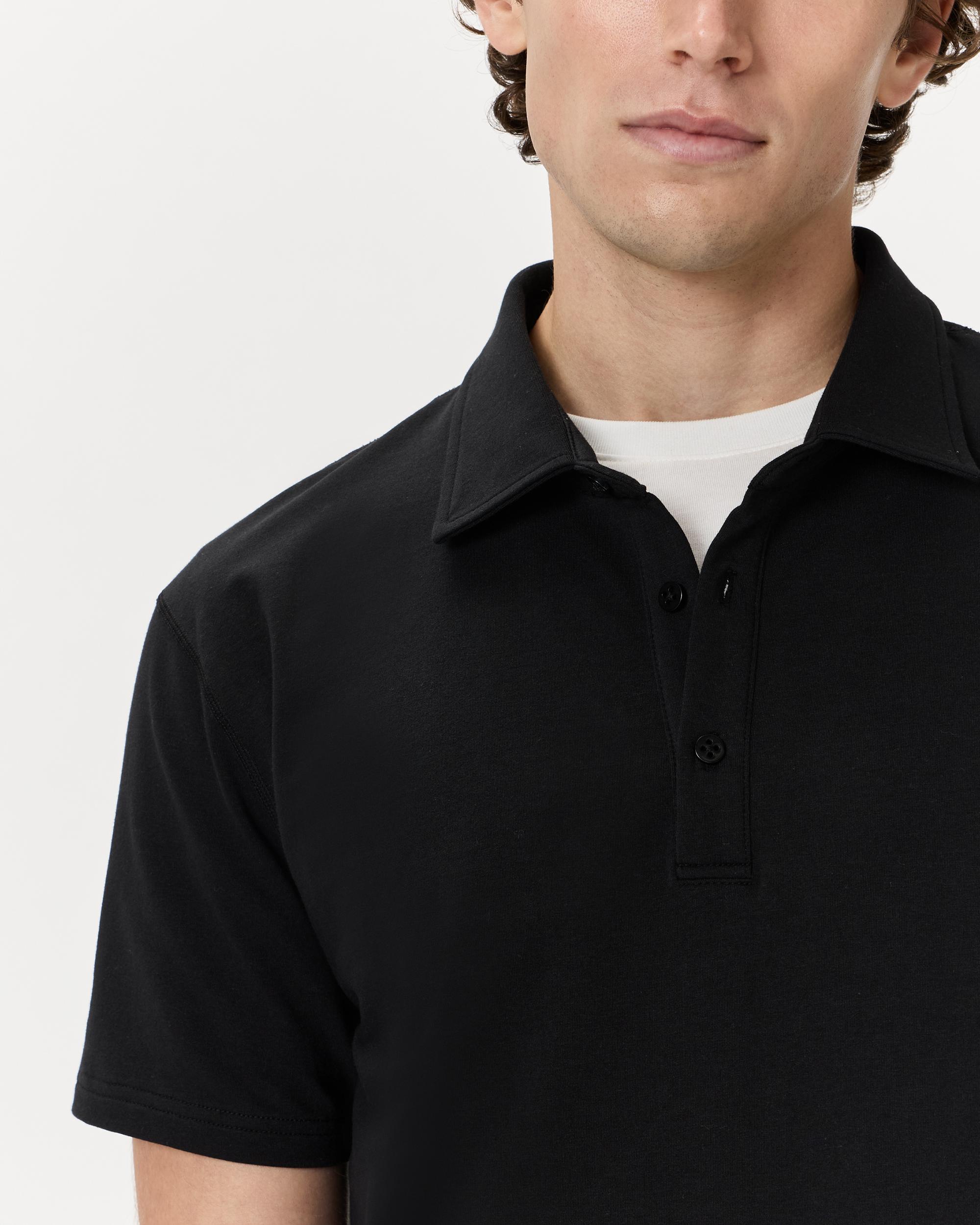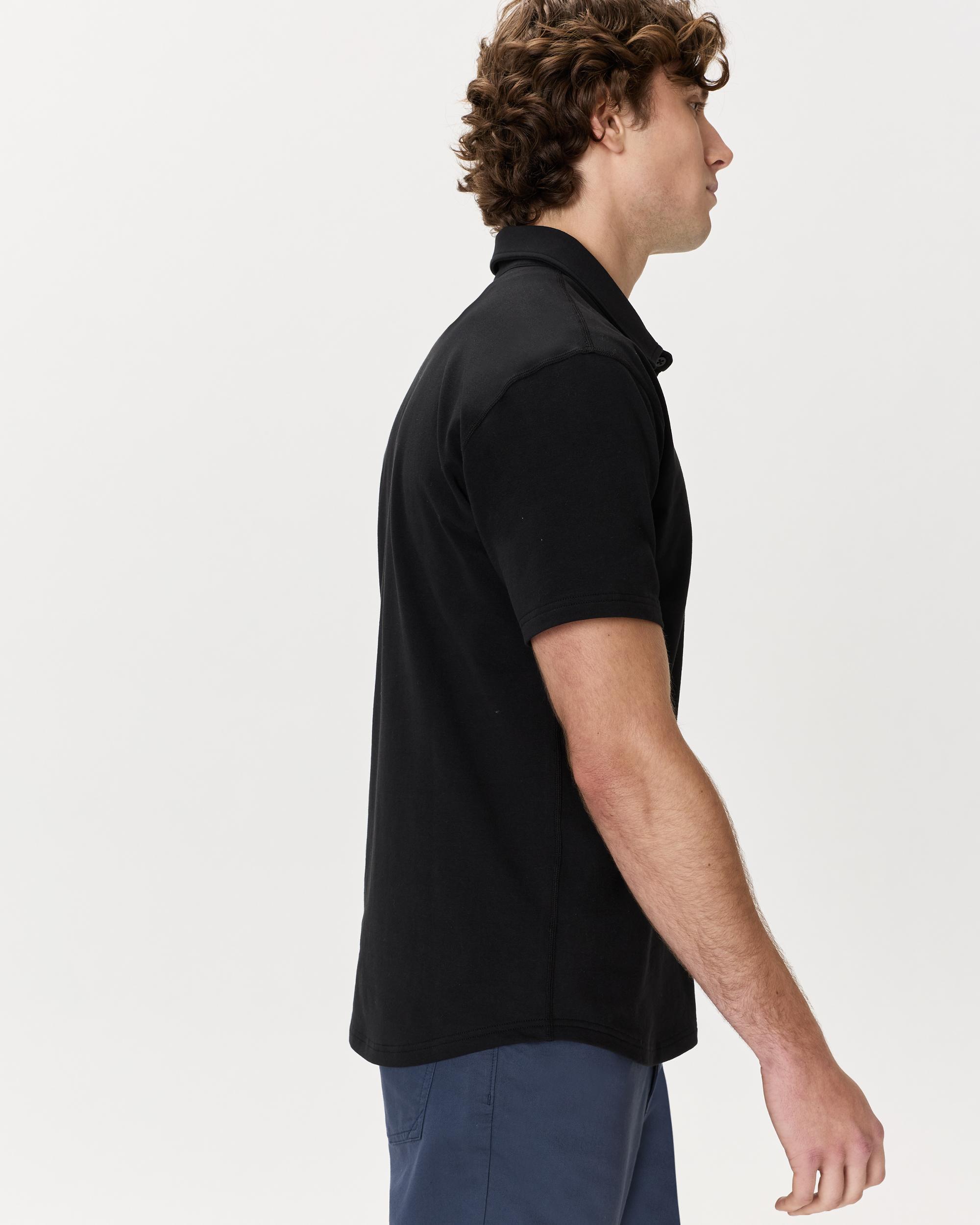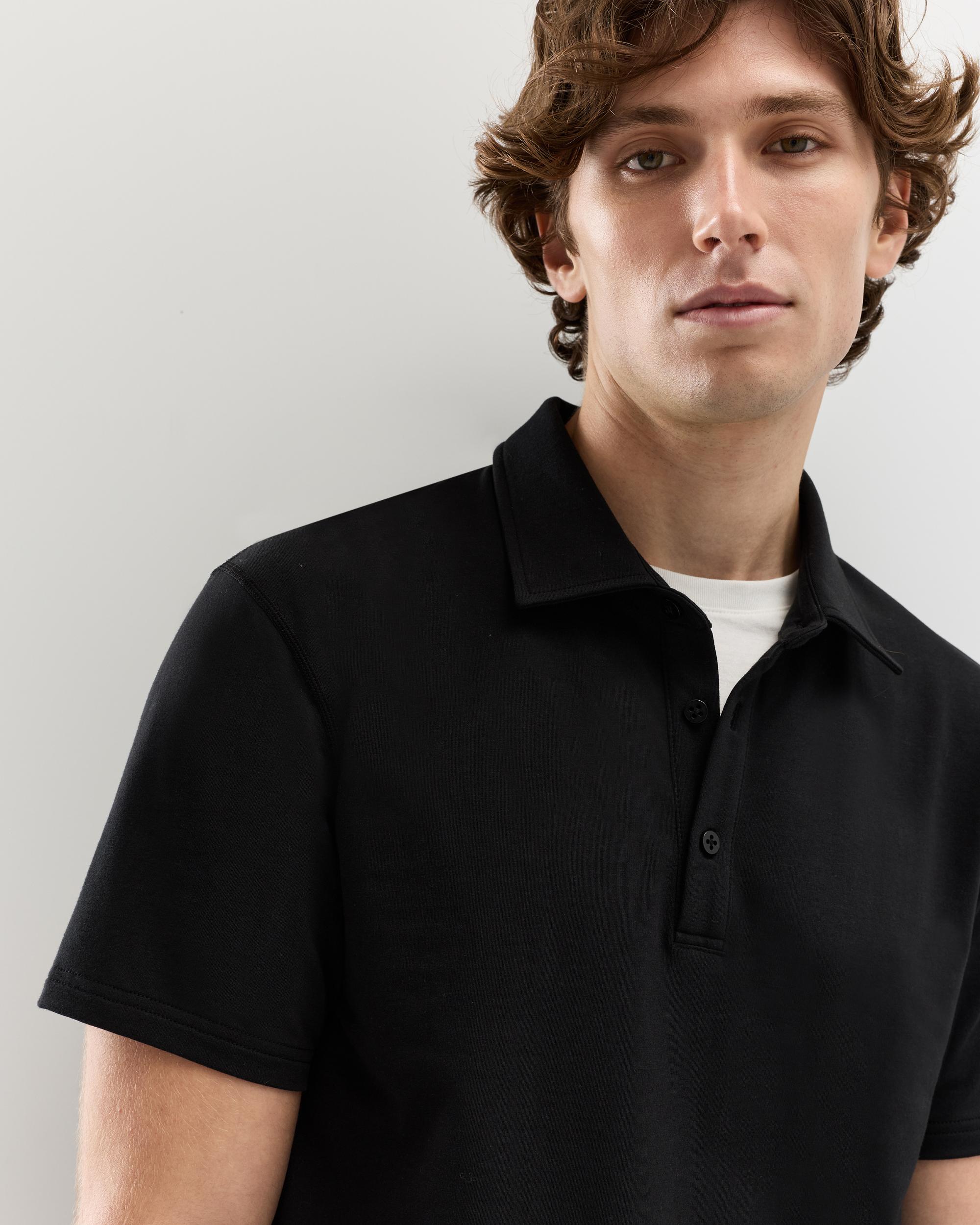 Made with a blend of high-quality sustainable materials, this polo is designed to provide maximum comfort and flexibility. Whether you're hitting the golf course, running errands, or heading to the office, this versatile polo is perfect for any occasion. The classic design is updated with a modern curved hemline give it a stylish edge, making it easy to pair with your golf or casual pant. Upgrade your wardrobe with our Flex Curve Polo, you wont be disappointed. | Quince | Men's Flex Curve Polo in Black, Size Small, Organic Cotton