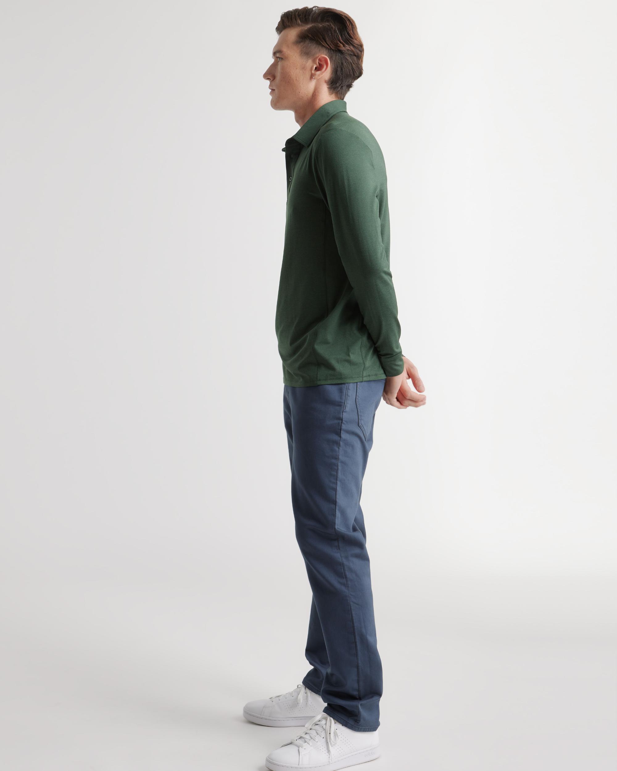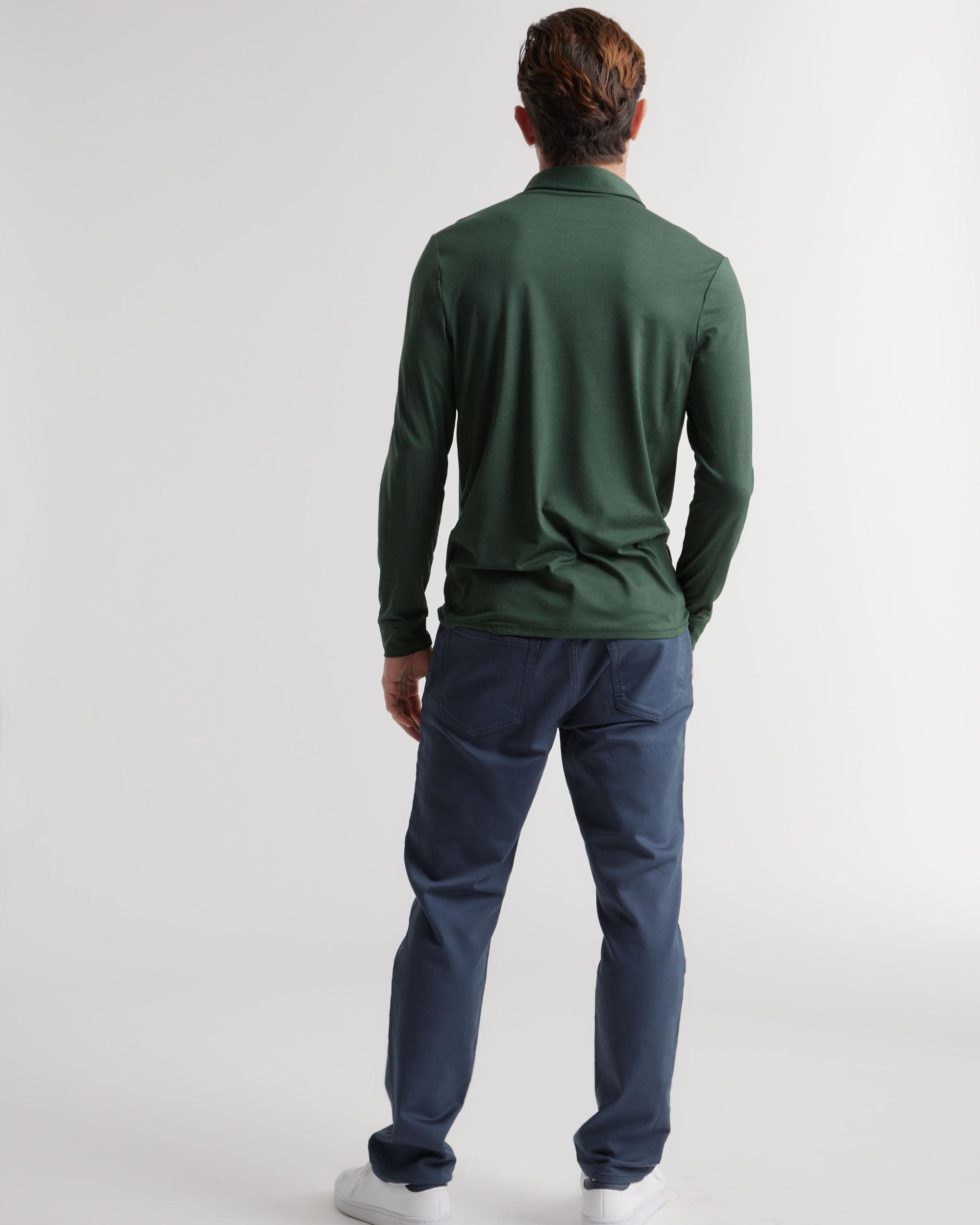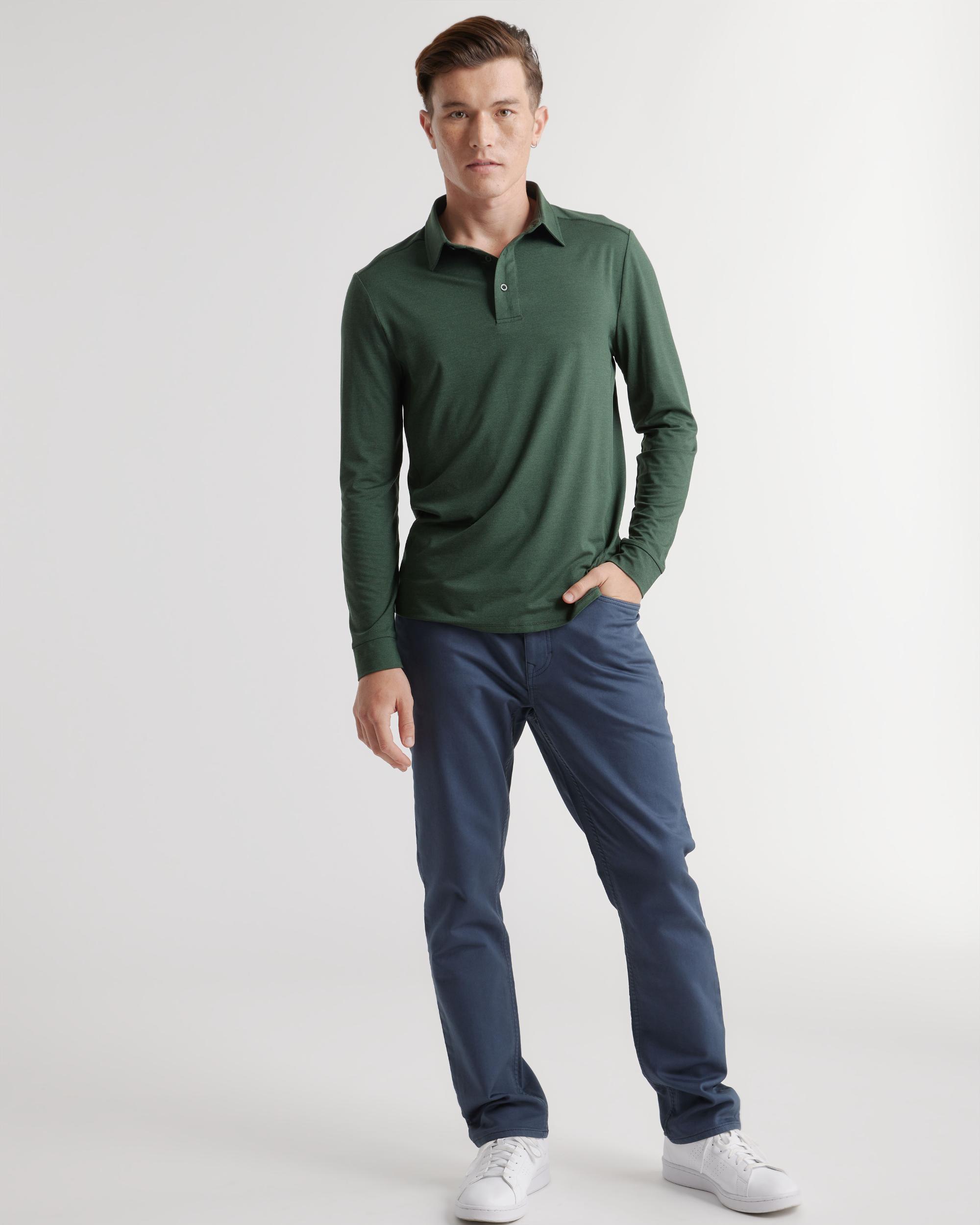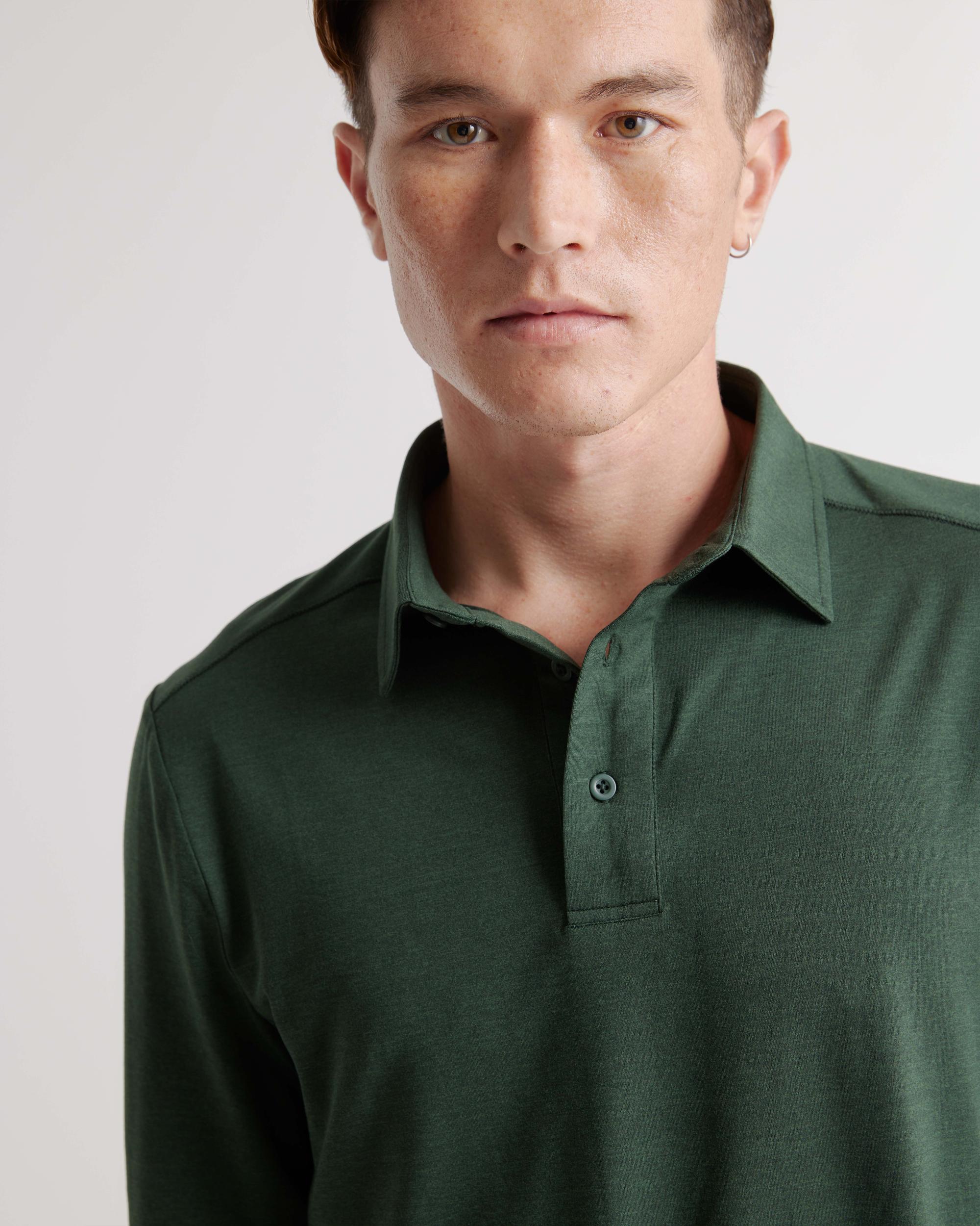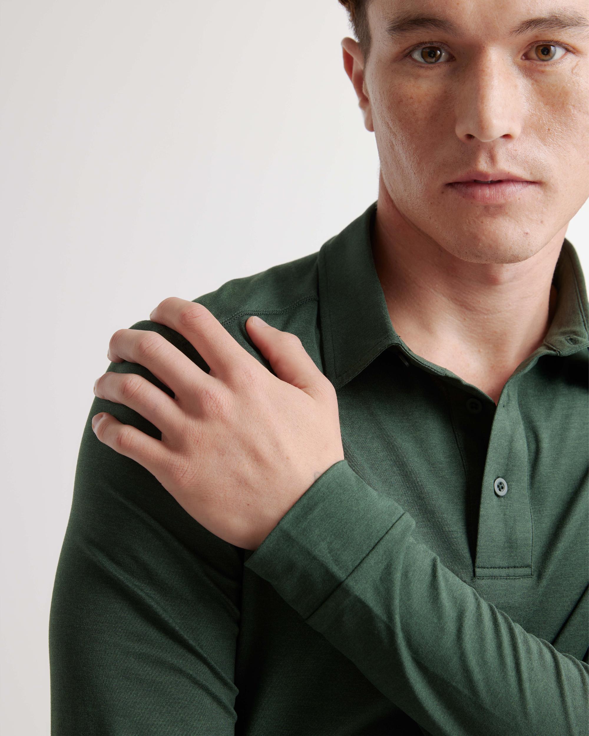 The most comfortable polo you'll ever wear now with long sleeves - perfect for golf, travel, date-night, or just lounging. Our insanely-soft Flowknit fabric is not only sustainable, but jam-packed with performance features like moisture-wicking and anti-odor for ultimate versatility. We dare you to take this off. | Quince | Men's Flowknit Breeze Performance Long Sleeve Polo in Olive, Size XL, Recycled Polyester