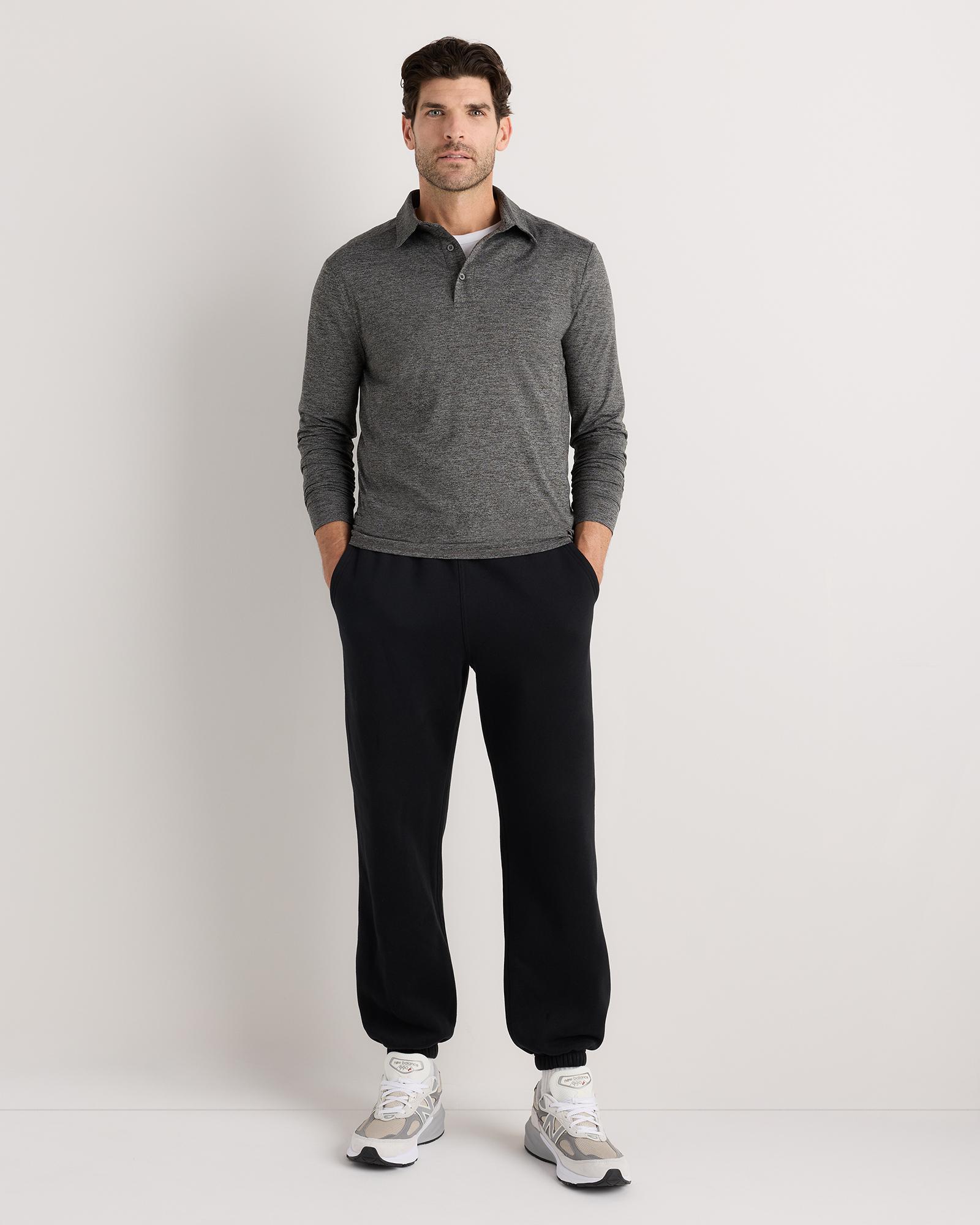 The most comfortable polo you'll ever wear now with long sleeves - perfect for golf, travel, date-night, or just lounging. Our insanely-soft Flowknit fabric is not only sustainable, but jam-packed with performance features like moisture-wicking and anti-odor for ultimate versatility. We dare you to take this off. | Quince | Men's Flowknit Breeze Performance Long Sleeve Polo in Charcoal, Size Small, Recycled Polyester