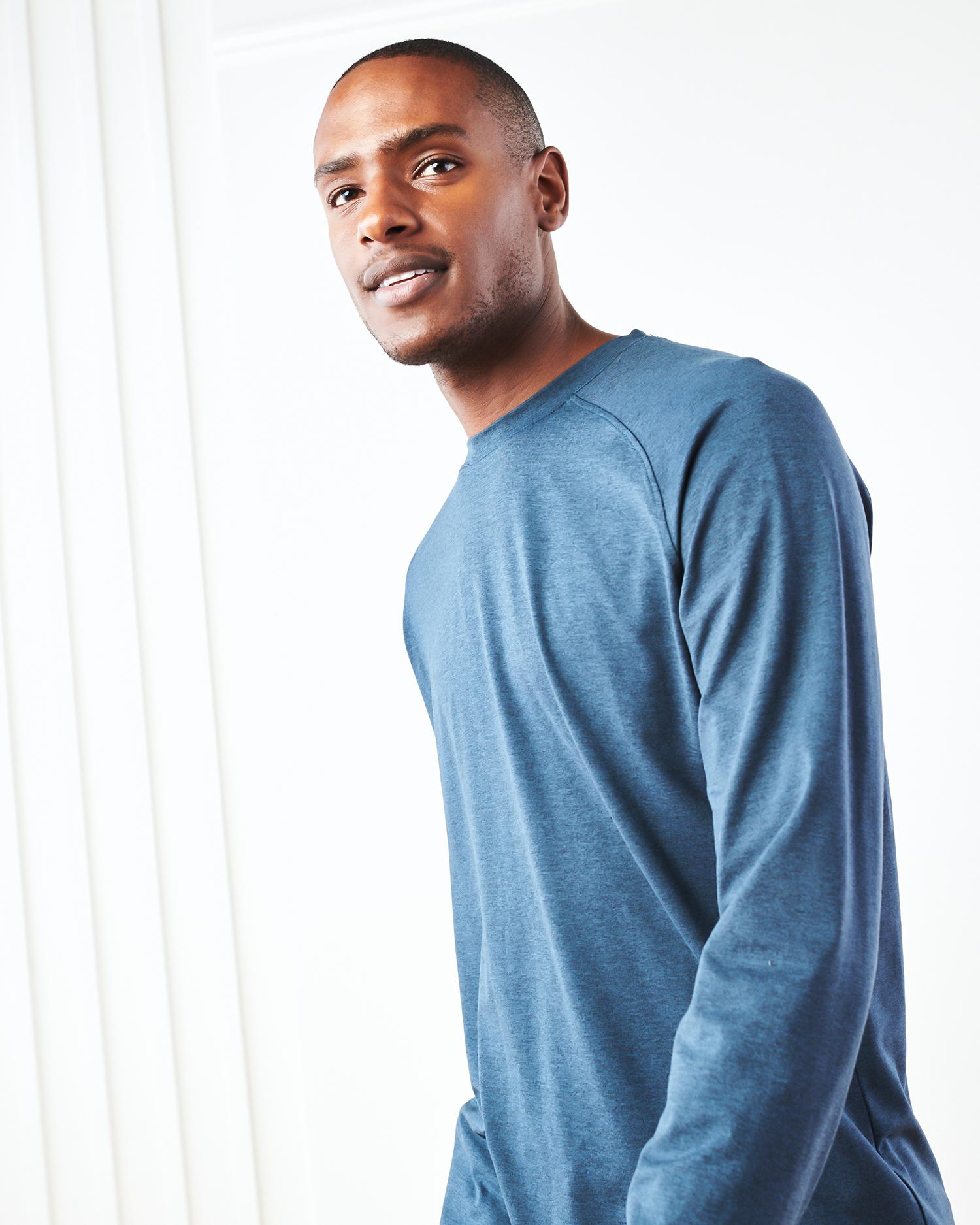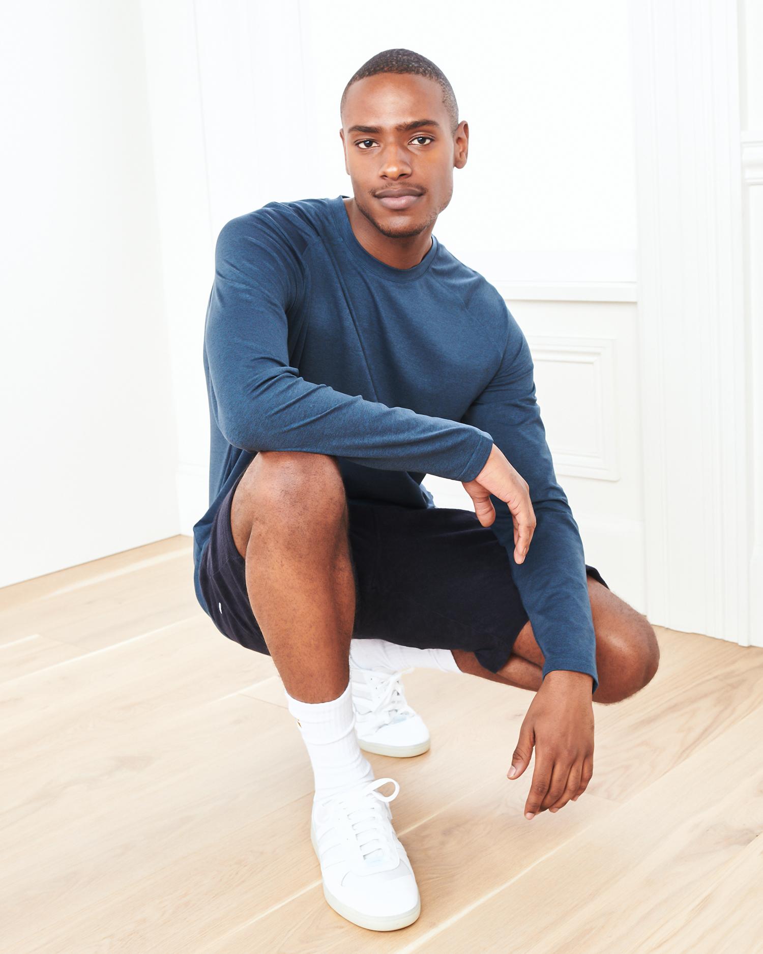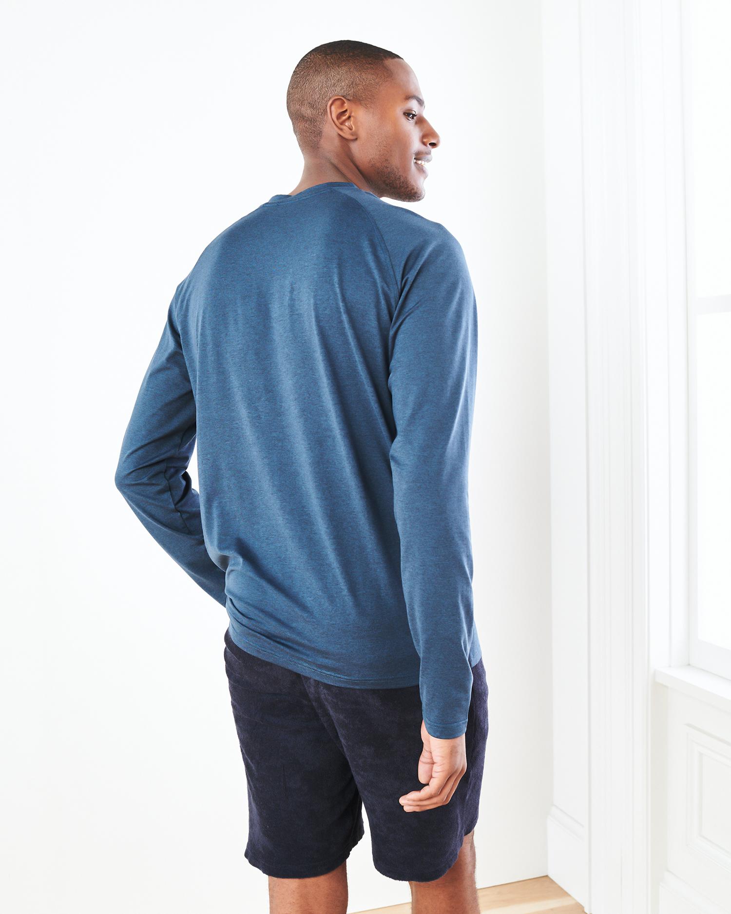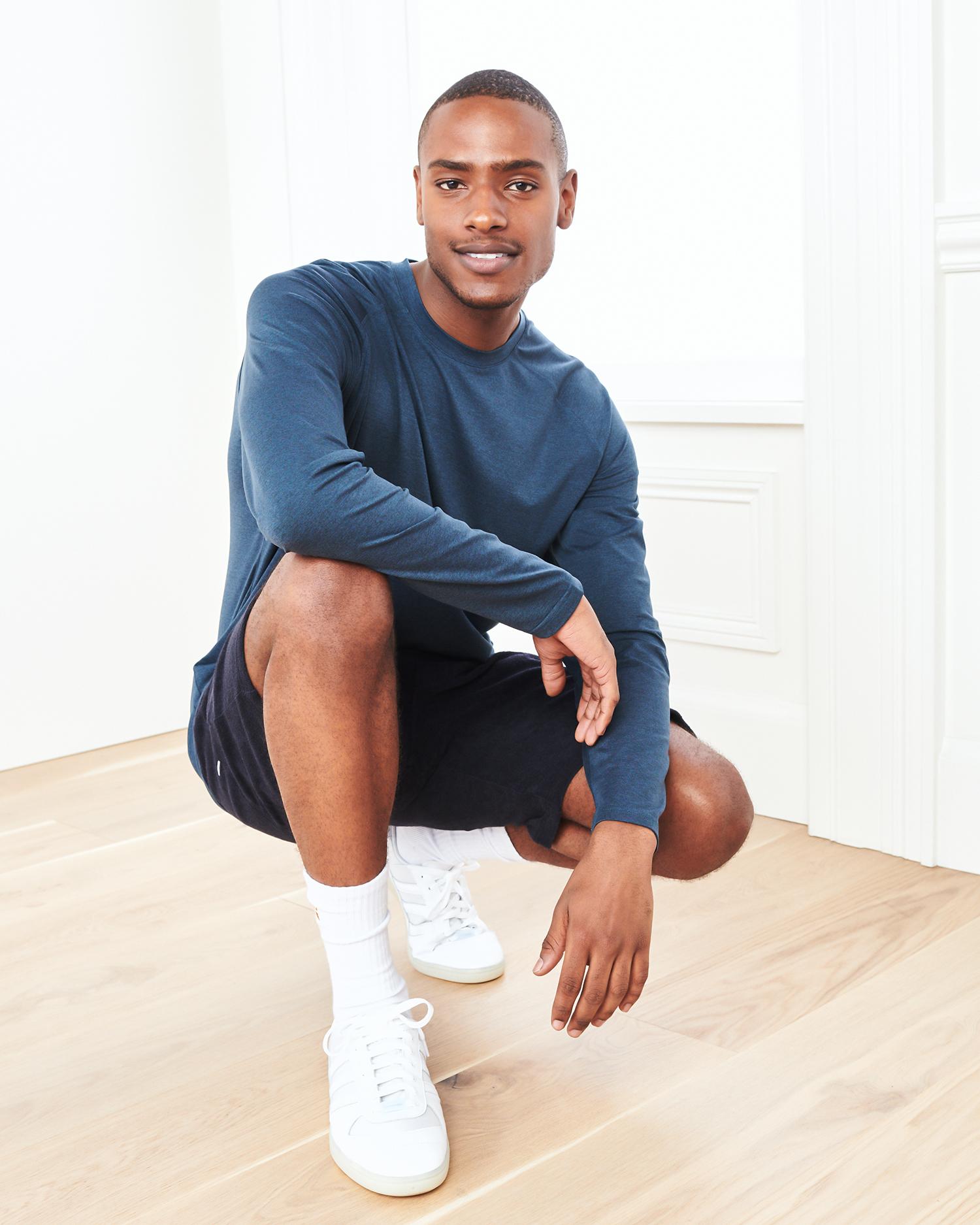 Our fave flowknit tee, but now in a long sleeve style. Perfect for training, travel, or lounging, our insanely-soft Flowknit fabric is jam-packed with performance features like moisture-wicking and anti-odor. Built for next-level comfort, and for everyday wear. Our Flowknit is made from Global Recycle Standard poly yarn, which diverts and recycles plastics destined for landfill or the ocean, so you can feel and look good in what you wear. | Quince | Men's Super Soft Performance Long Sleeve T-Shirt in Navy, Flowknit Activewear, Size Small, 100% Polyester