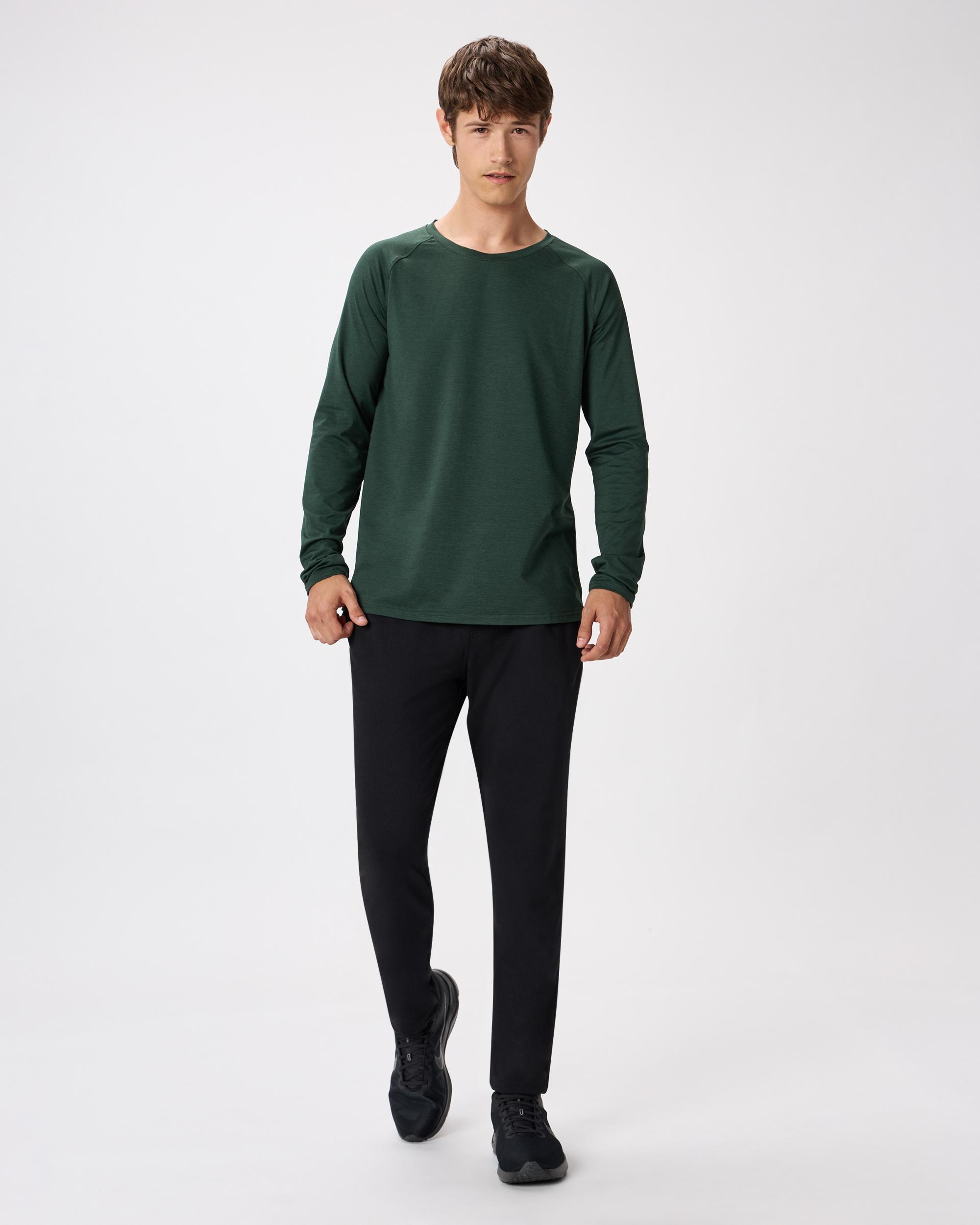 Our fave flowknit tee, but now in a long sleeve style. Perfect for training, travel, or lounging, our insanely-soft Flowknit fabric is jam-packed with performance features like moisture-wicking and anti-odor. Built for next-level comfort, and for everyday wear. Our Flowknit is made from Global Recycle Standard poly yarn, which diverts and recycles plastics destined for landfill or the ocean, so you can feel and look good in what you wear. | Quince | Men's Super Soft Performance Long Sleeve T-Shirt in Olive, Flowknit Activewear, Size Large, 100% Polyester