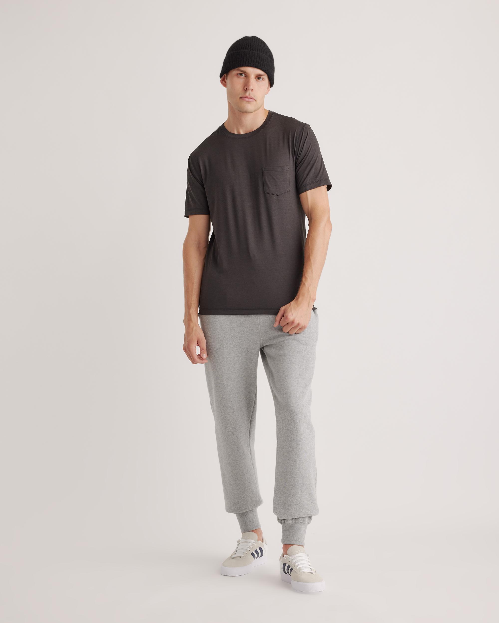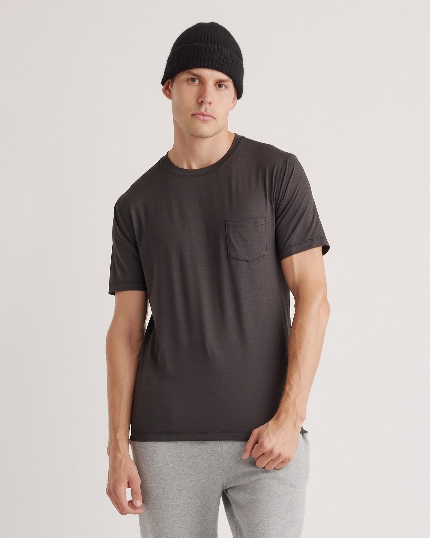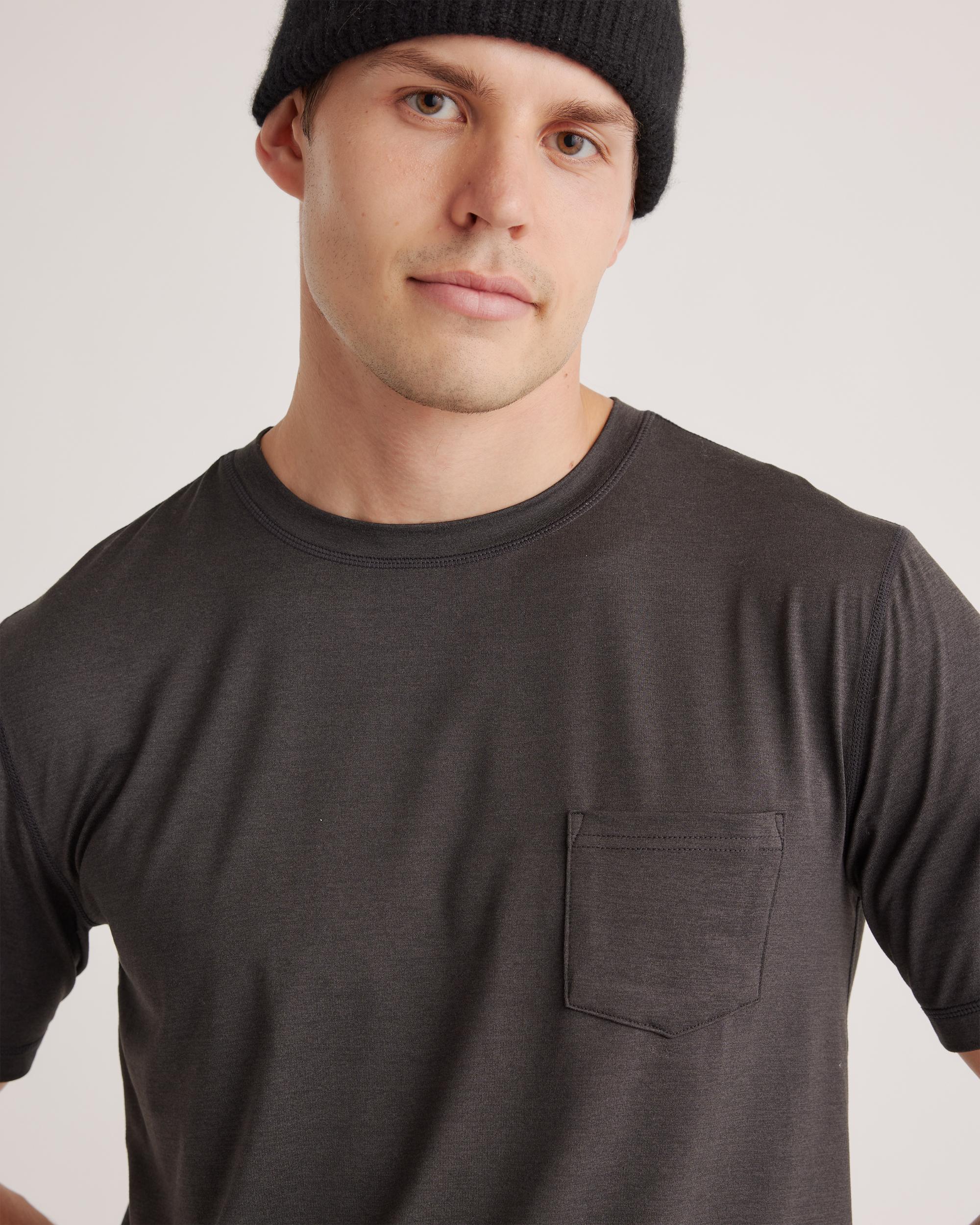 The ultimate do-everything tee, now with a pocket. The single chest pocket adds simple flare to the same shirt you know and love, our Flowknit Breeze Performance Tee, and is the perfect addition to your rotation. Made for training, travel, or lounging, our insanely-soft Flowknit fabric is jam-packed with performance features like moisture-wicking and anti-odor benefits. Bonus: Our Flowknit is made from Global Recycle Standard poly yarn, which diverts and recycles plastics destined for landfill or the ocean, so you can feel and look good in what you wear. | Quince | Men's Flowknit Breeze Performance Pocket T-Shirt in Heather Black, Size Small, 100% Polyester