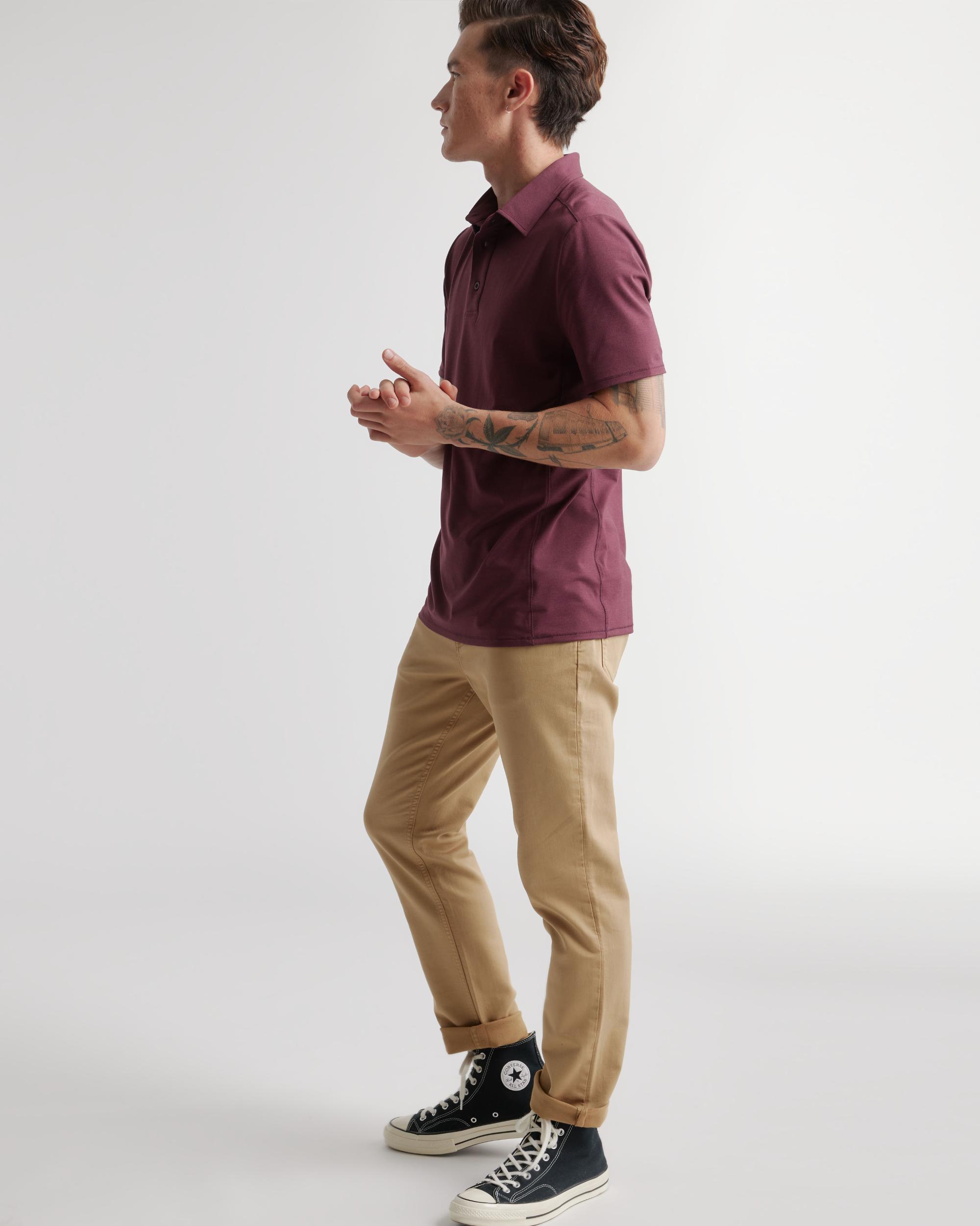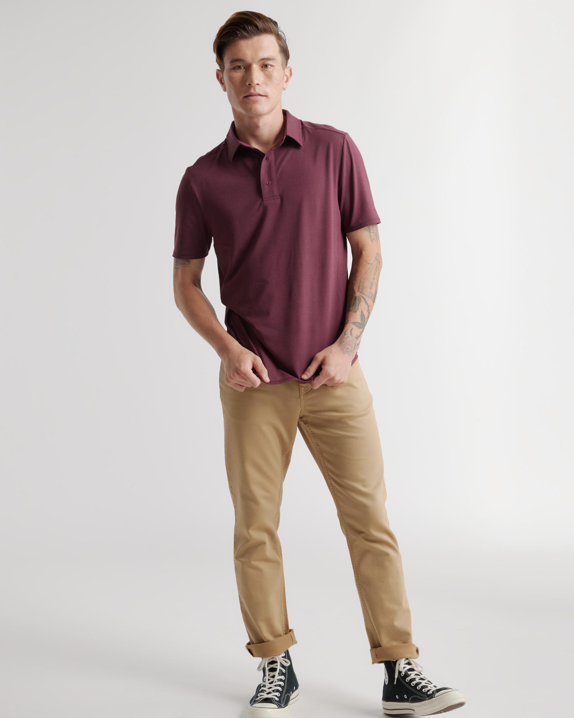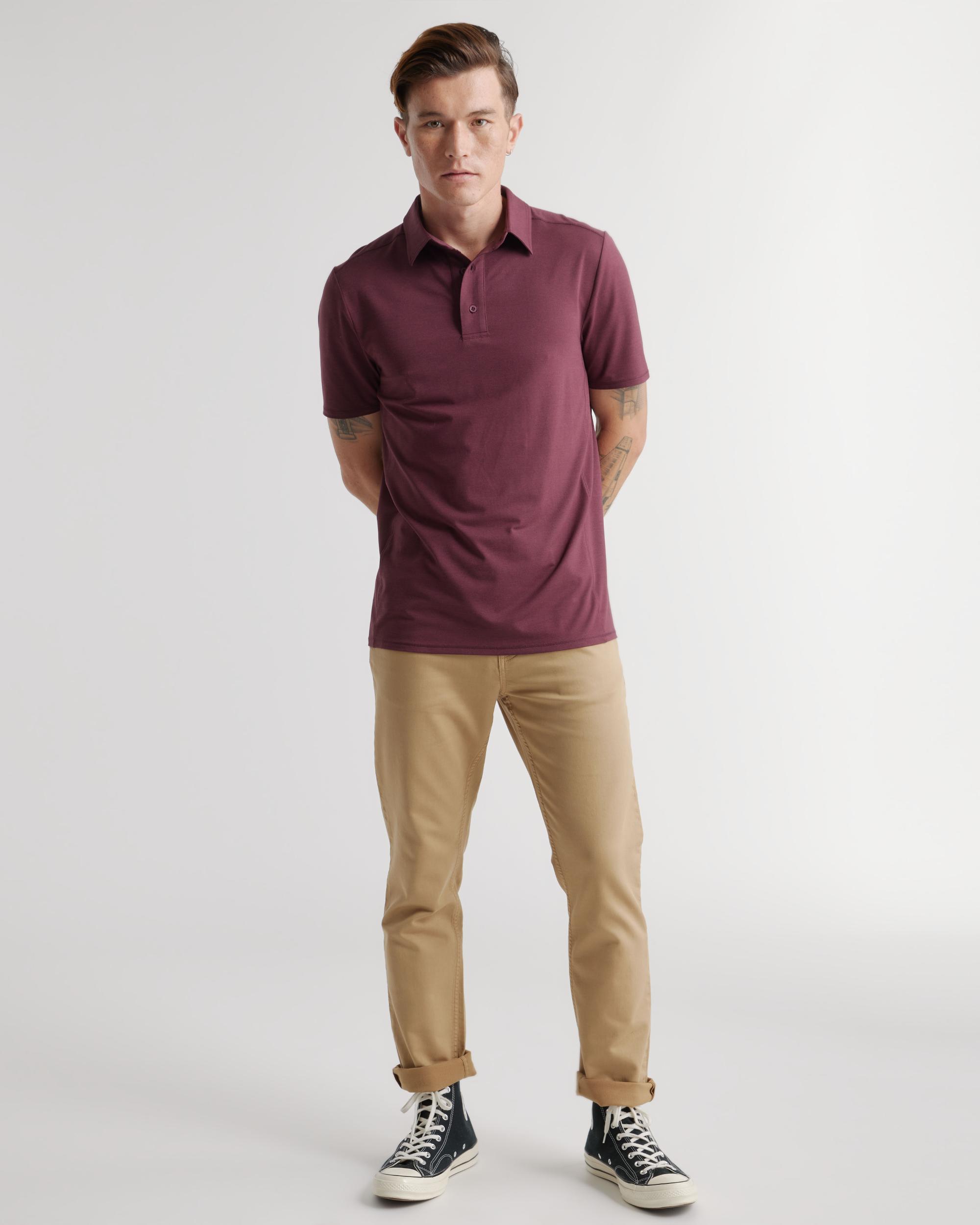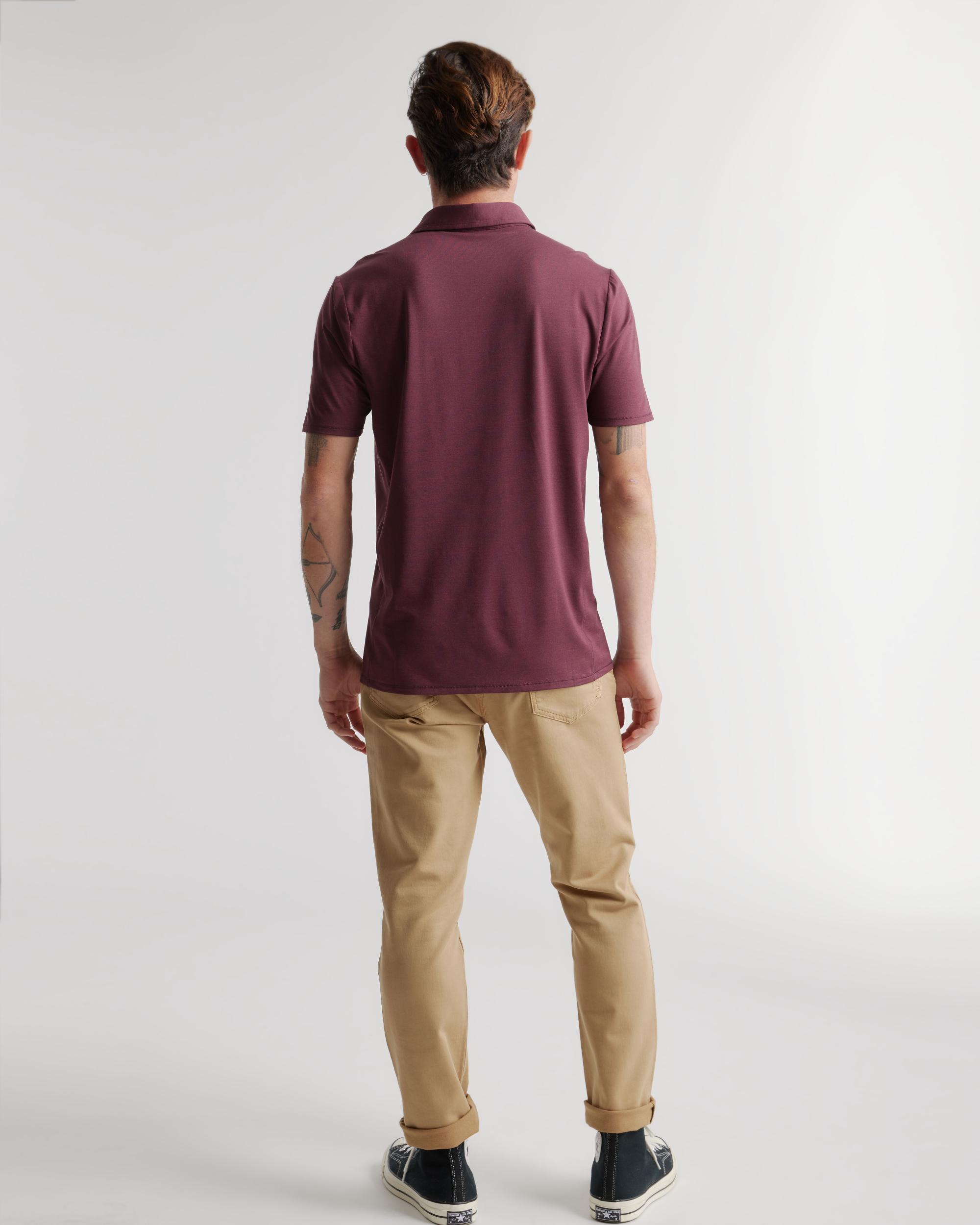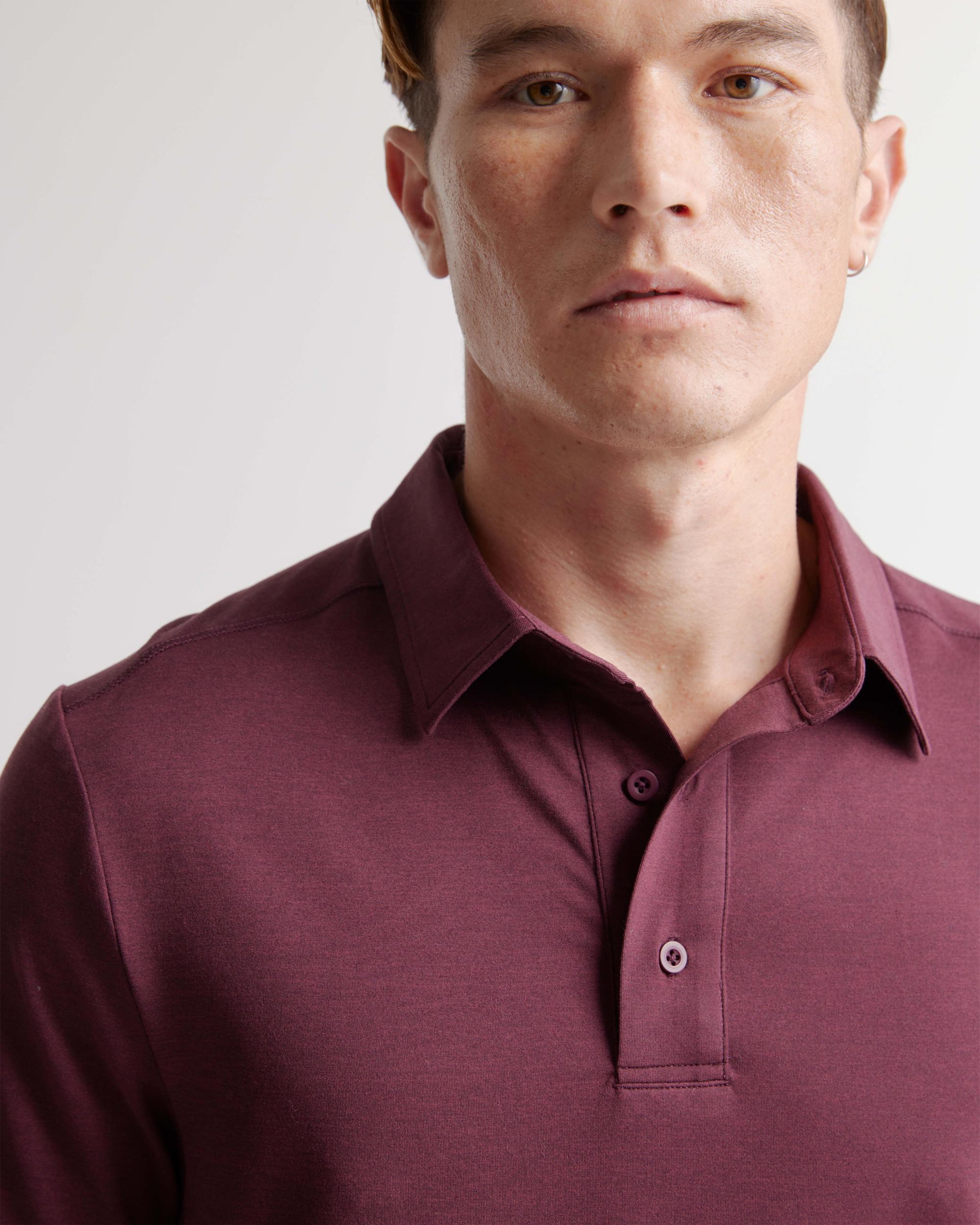 Level up your perfect polo. This supersoft option is ideal for golf, travel, or date-night. Our insanely-soft Flowknit fabric is not only sustainable, but jam-packed with performance features like moisture-wicking and anti-odor for ultimate versatility. Our Flowknit is made from Global Recycle Standard poly yarn, which diverts and recycles plastics destined for landfill or the ocean, so you can feel and look good in what you wear. | Quince | Men's Flowknit Breeze Performance Polo in Burgundy, Size Large, Recycled Polyester